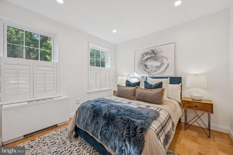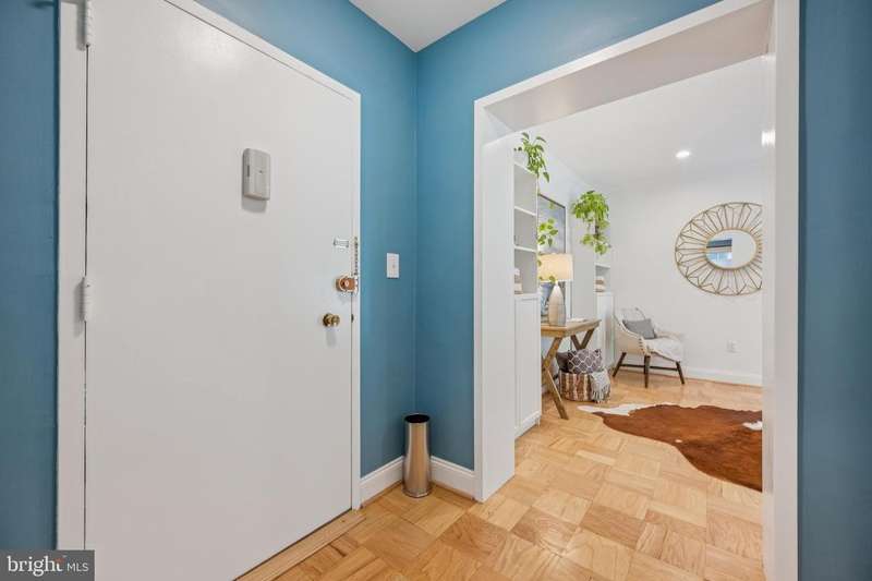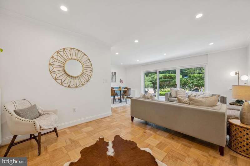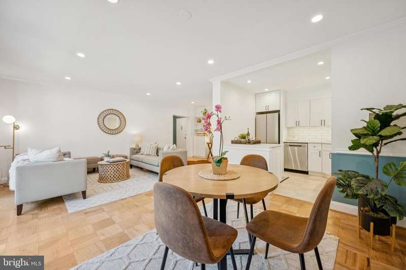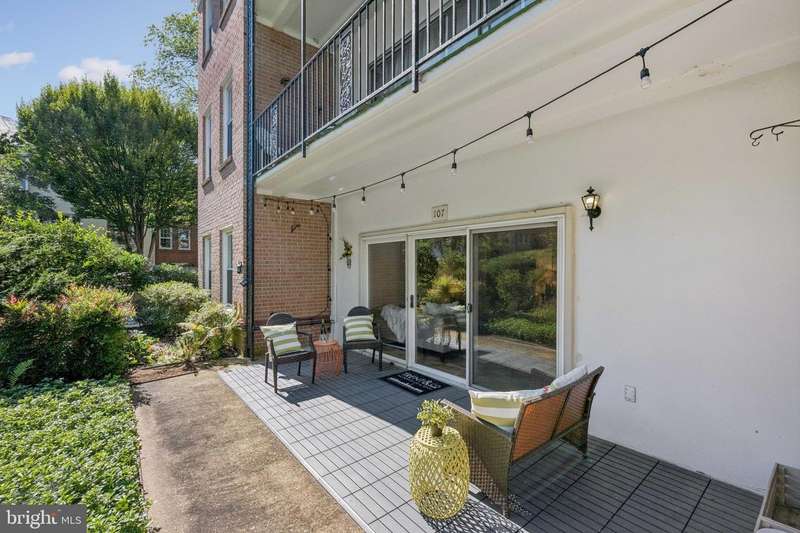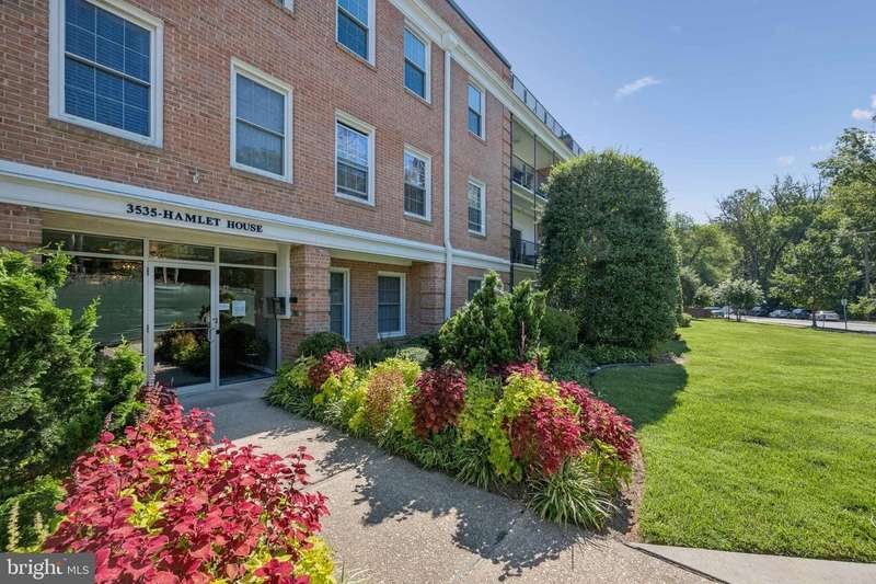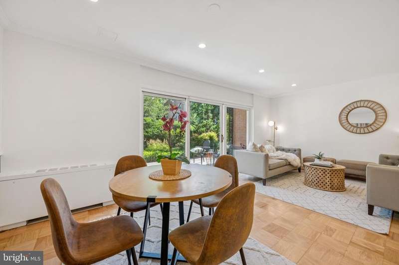 Rarely available two-bedroom condo offering nearly 1,000 square feet of living space with desirable outdoor main level patio tucked away just blocks from the future Purple Line Metro stop. This home combines comfort, convenience, and value with extra storage, dedicated parking, and all utilities included in the condo fee. Upon entry to the foyer with large closet, the interior features gleaming parquet floors and an open layout with a flexible work/reading area, spacious living room, and adjacent dining space. The renovated kitchen is appointed with quartz countertops, stainless steel appliances, and modern finishes. Both bedrooms are generously sized and include louvered shutters that provide privacy while still welcoming natural light. Step out to a private patio with direct access to landscaped greenery, maintained by the condo association for year-round garden views. Just blocks away, Chevy Chase Lake offers a vibrant mix of amenities including Amazon Fresh, Playa Bowls, Dok KhaoThai, Stretch Lab, RTR Pilates, Sarah's Ice Cream, CVS, One Medical, and more. Outdoor recreation is also close by with Rock Creek Park trails around the corner, along with easy commuter access to major routes. This move-in ready home presents an ideal opportunity in a highly desirable Chevy Chase location.