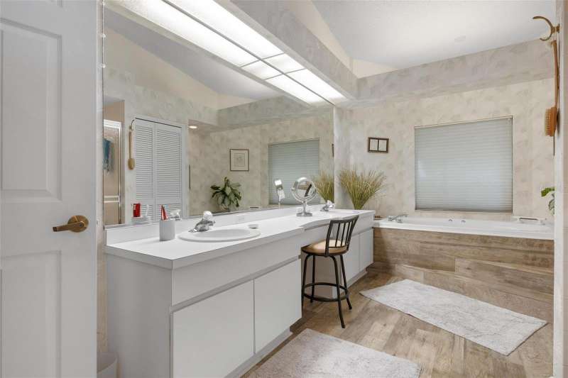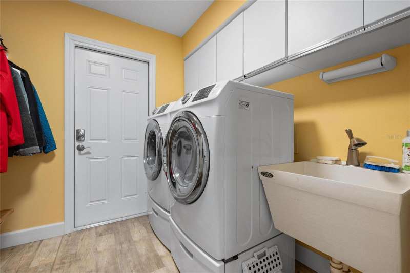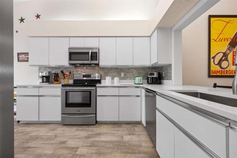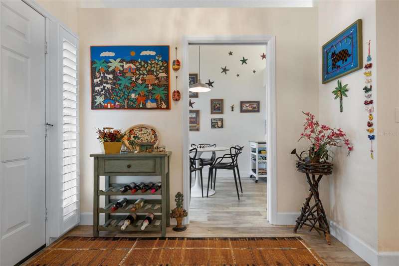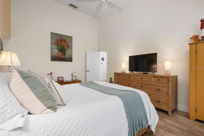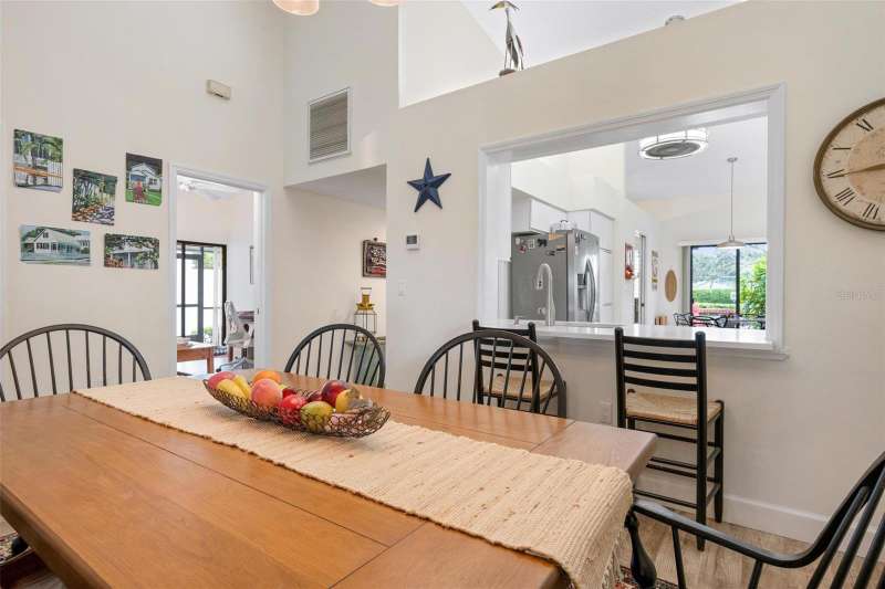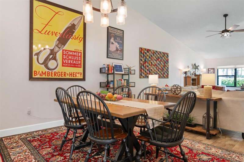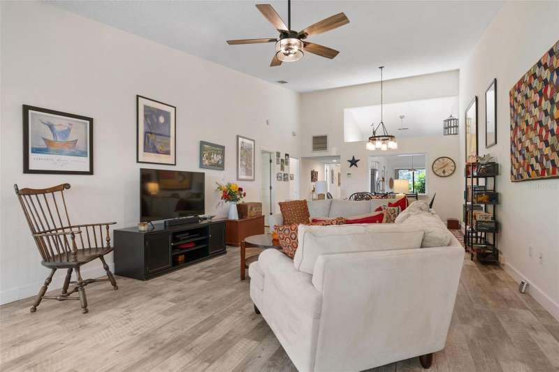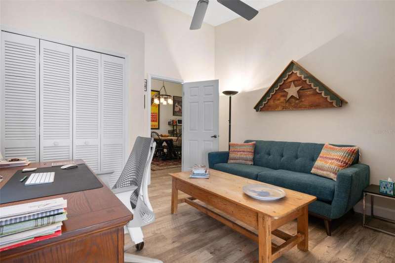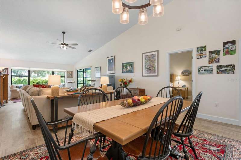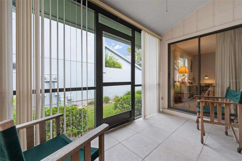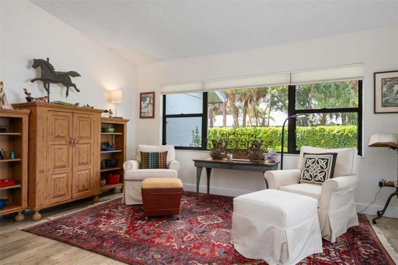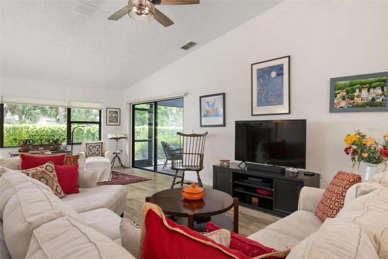 Welcome to the hidden gem of Woodbridge Estates, centrally located, close to shopping, downtown and beaches. This beautiful villa/condo is an end unit, maintenance free, including the exterior and roof, yet feels like a single-family home. Vaulted ceilings throughout the main living area and primary bedroom. A large, screened lanai looks out over a serene private greenery and is accessed from the main living area as well as the primary bedroom. A second private screened lanai shared with the second bedroom and office/den or third bedroom. Kitchen is bright, open and has an eat-in area, pantry and cabinets with lots of workspace, overlooking the front courtyard. The inside laundry room has storage and hanging area. The oversized two-car garage with storage, workspace and outside entry. Woodbridge Estates has 60 units on 13 acres, with heated pool, manor/club house, tennis and pickleball courts.