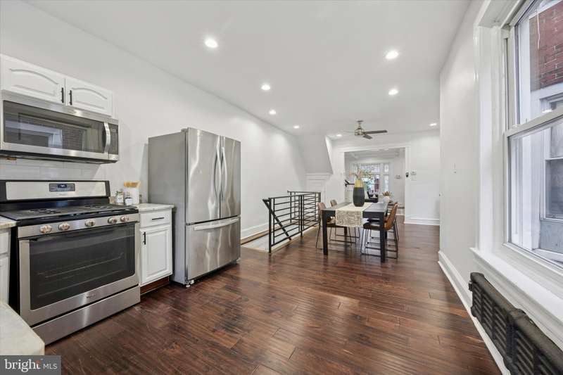 On one of the nicest blocks of Cobbs Creek, this rowhome has been updated where it counts while leaving plenty of charm intact. In the living room, the fresh white paint on the walls, coffered ceiling and original turned staircase make the leaded glass window and contemporary gas fireplace with cement tile surround blend perfectly together. The classic rowhome layout has been opened up, yet an extra-wide doorway with original dentil trim subtly separating the living and dining rooms was preserved, as was a sweet under-stair closet with original door. Oversized windows, including a floor-to-ceiling one in the dining room, flood the entire floor with natural light. The rear kitchen has freshly painted cabinets, handsome granite countertops with stainless steel undermount sink and stainless steel Whirlpool appliances including a five-burner range and French door fridge. A mudroom with extra storage space opens to the nicely sized rear yard. The finished basement with wood grain tile runs the full length of the house, offering two different hang zones separated by a powder room, a large mechanical closet, plus room left for storage. The second floor has gorgeous freshly refinished narrow-plank oak floors throughout the three bedrooms and hallway. The primary bedroom has a lovely bay window, the rear bedroom has two exposures including a charming window bench seat flanked by closets, and the middle true bedroom gets nice eastern light. Ornate radiators give each room an extra touch of charm. The oh-so-fresh-and-clean hall bathroom has a functional skylight and a new contemporary vanity, mirror and all black hardware. This tree-lined street, one of the loveliest stretches of already lovely Larchwood Ave, is in the heart of Cobbs Creek and is convenient to greenspace, shopping and public transit.