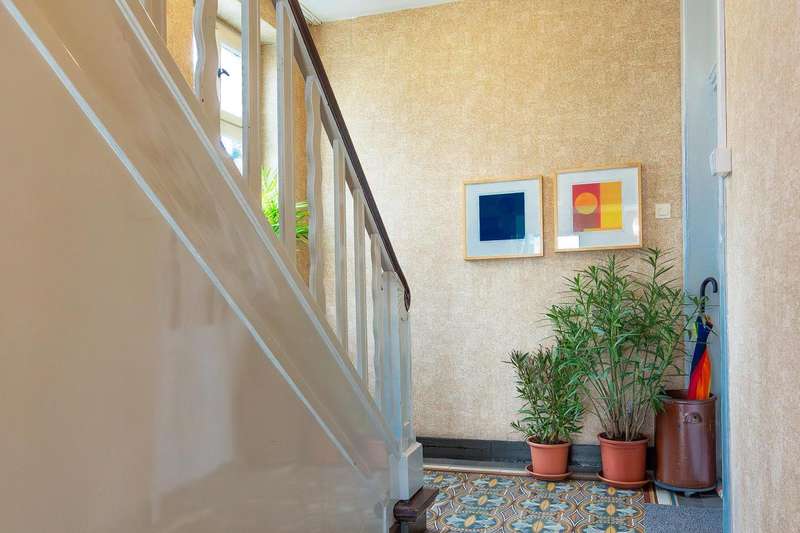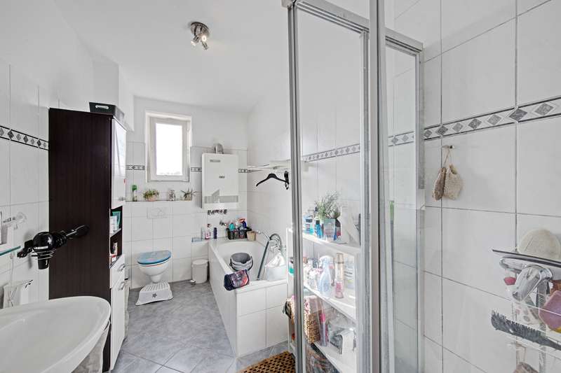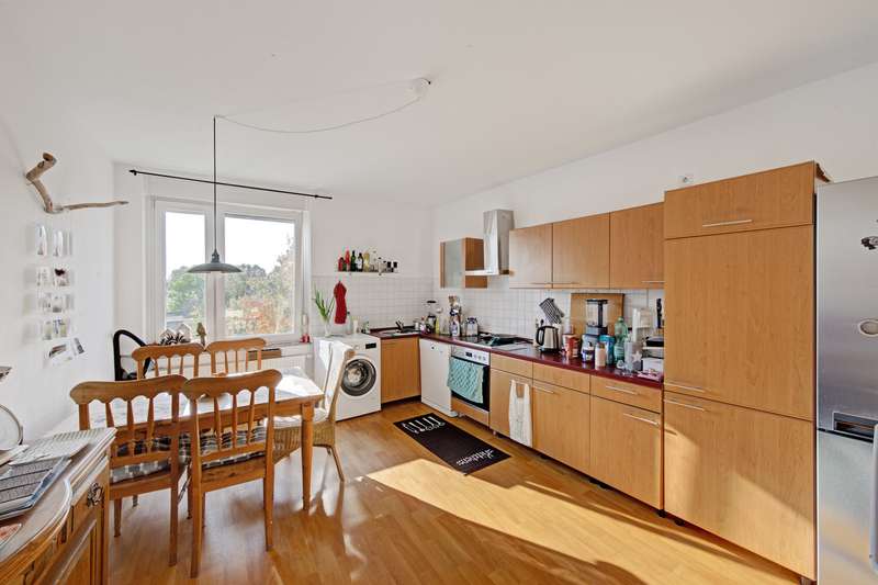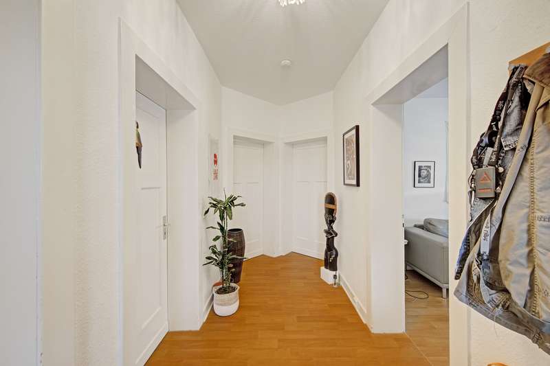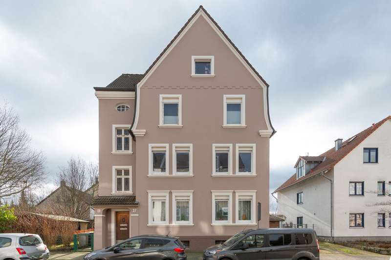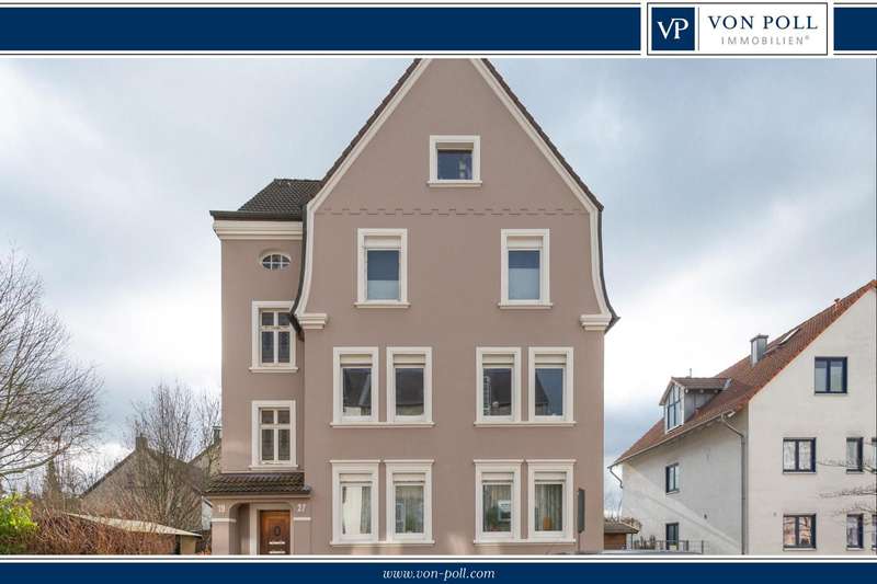 The Art Nouveau house was built in 1927 as a 3-party house with an attic room on the top floor. Built on a plot of approx. 893 m² in a convenient, central location. The staircase with leaded wooden frame windows at the front is set back slightly from the residential building, leaving space for an entrance portal with a small canopy. The original front door with the typical Art Nouveau window has been preserved over the decades and lends the house a special charm, as do the historic floor tiles and the original staircase. The façade renovation from around 2019 emphasizes the Art Nouveau elements of the building in bright, friendly colors. To increase the living space, the first floor has an extension for the kitchen, which was completely gutted and converted into a large kitchen with dining area as part of an apartment renovation in around 2007. The terrace and garden area can be accessed from the kitchen via an external door. The two apartments on the 1st and 2nd floors each have large kitchens, while the kitchen on the 1st floor leads to a small storage room. The apartment on the 1st floor is in need of renovation; the apartment on the 2nd floor is in good condition after the last renovation (approx. 2008). The attic was converted into a fully-fledged apartment around 1975 with the installation of a bathroom. The attic conversion with large dormer windows in the living room and kitchen gives the attic apartment a bright atmosphere. The new roof covering and insulation contribute to energy optimization. The apartment sizes are divided as follows: First floor: approx. 97.85 m² (rented) 1st floor: approx. 81.36 m² (rented) 2nd floor: approx. 81.39 m² (rented) Top floor: approx. 52.73 m² (vacant) Actual rental income per month for the three rented residential units: approx. € 1,300.00 Actual rental income per month from the rented garages (6 of 7 rented, one is provided free of charge in exchange for maintenance of the garage yard): approx. € 216.47 The property is in a well-kept condition overall. Arrange your personal viewing appointment today. We look forward to hearing from you.