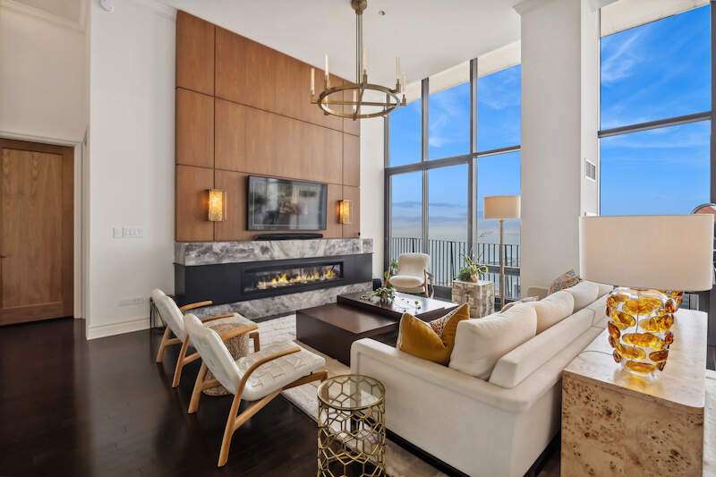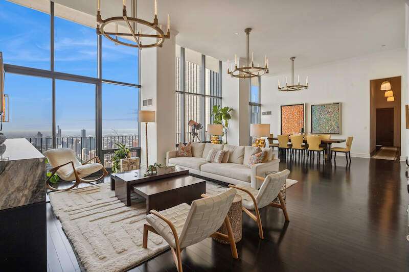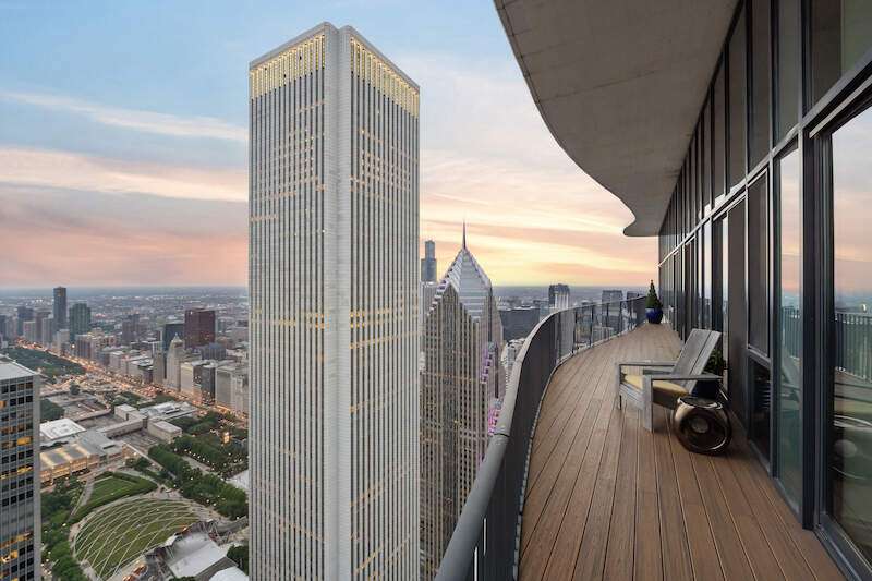 Experience views of the lake and city from this top floor - penthouse unit in Chicago's Aqua Tower. Award-winning architect Jeanne Gang designed this building's unique, slow rippling balconies, giving the skyscraper a sculptural quality. This residence offers a terrace that spans 91 feet in length with access from the living spaces and all four bedrooms. Recently updated with new weather-proofed flooring, this serene outdoor space is perfect for entertaining, relaxation, and meditation. Abundant natural light flows from floor-to-ceiling windows in every room. 14 ft ceilings and vast wall space create the ideal space to display an art collection. Highlights include Lutron motorized shades, crown molding, millwork, and hardwood floors throughout the home. The living space flows together flawlessly: a living room with fireplace, a dining area large enough to accommodate both large parties as well as intimate gatherings. Tastefully appointed, the kitchen offers Calacatta Gold marble counters, custom cabinetry, Subzero, Wolf, and Miele appliances, and an island with breakfast bar. The current owner created an elegant, temperature-controlled wine cellar in an area once dedicated to storage. A dramatic, newly renovated powder room features new wood paneled walls and a floating sink atop lit Onyx counter. The graciously sized primary suite features a grand walk-in closet outfitted by Closet Works and a luxurious ensuite bath with custom cabinetry in a cocoa finish, Calacatta Gold countertops, mosaic marble shower, and Airbath Jacuzzi tub. The spacious second and third bedrooms have generous closets and stunning views; two full baths are located across the hall. The fourth bedroom is currently configured as a den with custom built-ins. One deeded parking space included in the price and a second deeded space potentially available at an additional cost. Residents enjoy Aqua's full amenities: indoor and outdoor swimming pools, hot tub, sundeck, fitness center, sauna, steam, indoor basketball court, outdoor running track, media/theatre room, billiards room, business center, restaurants and direct access to the city via the Chicago pedway.
