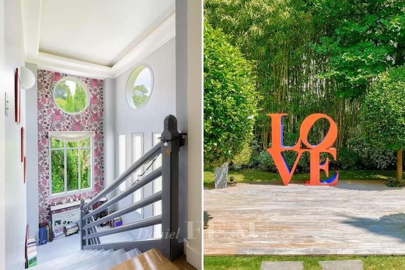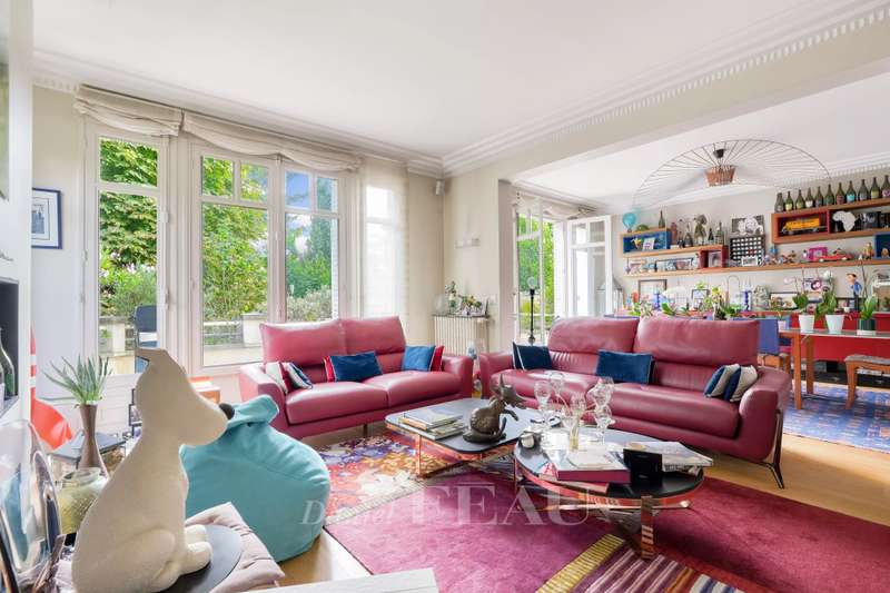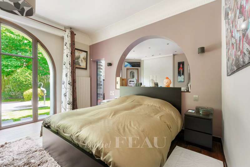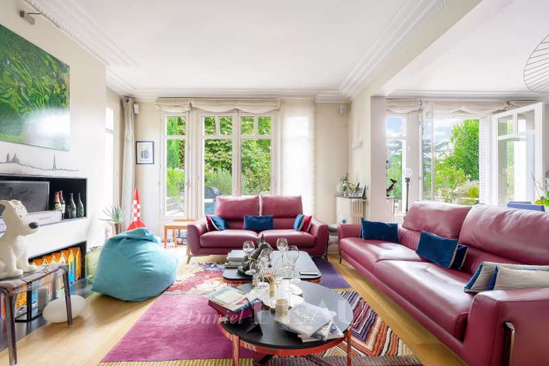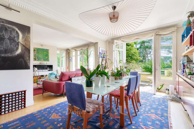 This 1930s property set in a 649 sqm plot is located just a few minutes walk from the station, the schools and Saint-Cloud Park. Offering 240 sqm of floor space and about 200 sqm of living space, it includes a bright living/reception room with a dining room opening onto a 20.50 sqm south-facing terrace enjoying an open view, and a kitchen with dining facilities. Upstairs are three bedrooms, a study with a mezzanine or possible bedroom, a bathroom and a shower room. The garden level comprises a master suite with a study area with a dressing room and a bathroom opening onto a terrace, and a utility room. With a garage.