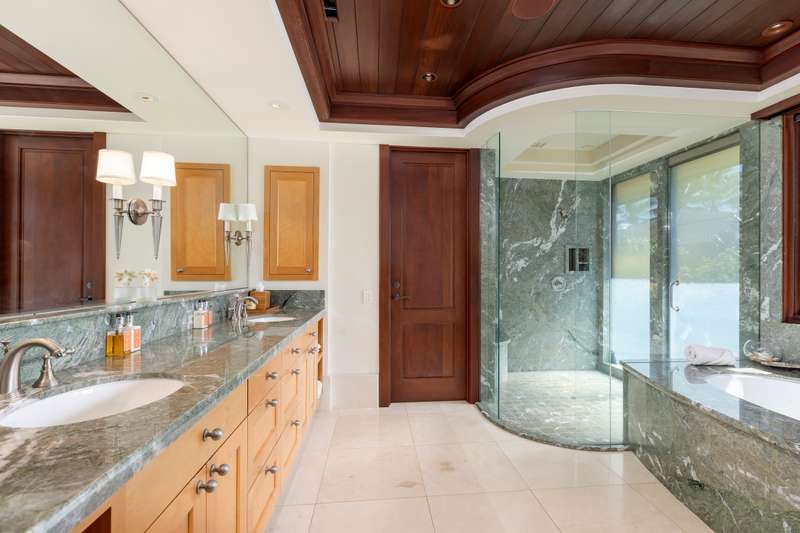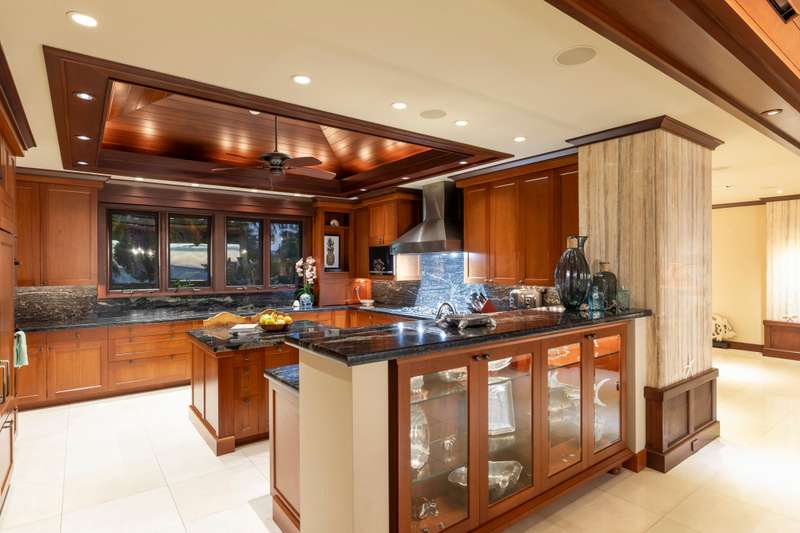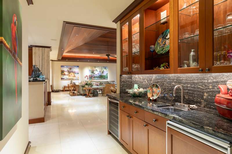 The grand entrance sets the tone with exotic tropical landscaping, a koi pond, and meticulously maintained grounds that span over half an acre. Custom-built with extraordinary attention to detail, this 5,733-square-foot residence radiates craftsmanship and luxury. The home features four bedroom suites, each with its own private lanai, five and a half bathrooms, and a spacious Great Room designed for comfort and elegance. The gourmet kitchen is a chef’s paradise, fully equipped with premium appliances and thoughtful design touches. Additional highlights include a two-person office, a state-of-the-art media room, and a dining area that comfortably seats eight within the Great Room. The Great Room's motorized lanai doors blur the lines between indoor and outdoor living, while pocket doors integrate glass, screens, and rich hardwood shutters to enhance functionality and beauty. Throughout the home, the use of exotic hardwoods and fine Italian, Spanish, and Brazilian marble elevate the aesthetic. Unique features such as switchable glass panels in the bathrooms—instantly transforming from clear to opaque—adding a touch of modern luxury.