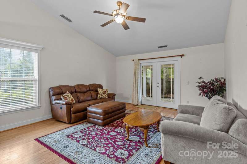 Charming Ranch-Style Home on Spacious Corner Lot in Mooresville. Check out this beautifully maintained 4-bedroom ranch home, ideally situated on a fenced corner lot in the sought-after Linwood Farms community. Enjoy the outdoors year-round from the covered back patio, surrounded by mature shade trees and a large, level yard that is perfect for entertaining or relaxing. Step inside to find a warm and inviting layout featuring vaulted ceilings in the great room and kitchen. The primary suite is complete with walk in closet and decorative ceiling beams. While the home offers four bedrooms all on the main level, one has been converted into a home office with custom built-ins, ideal for remote work or study. Upstairs, a bonus room provides the perfect space for a recreation room, playroom, or additional living area. Additional highlights include a spacious 2-car garage and access to fantastic neighborhood amenities, including a community pool, clubhouse, and playground. Don't miss your chance to own this move-in ready home in a wonderful community!