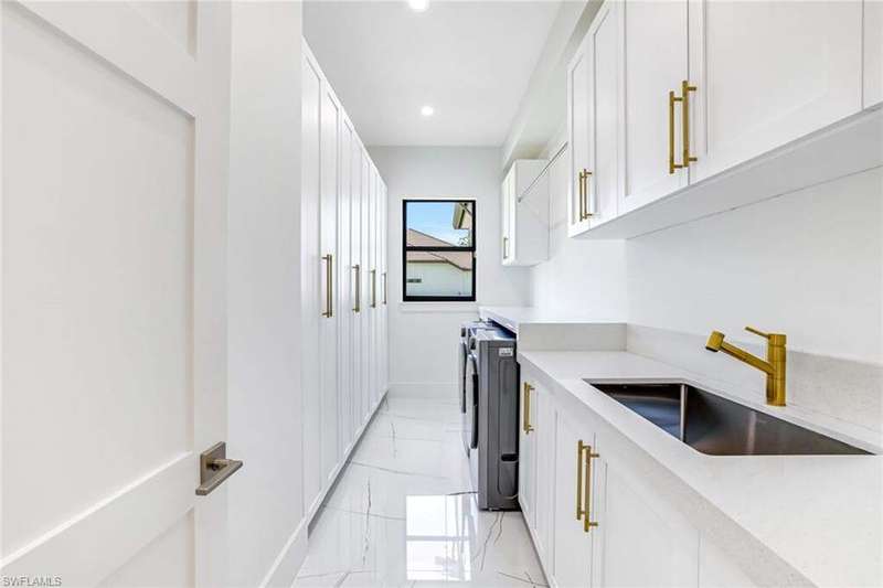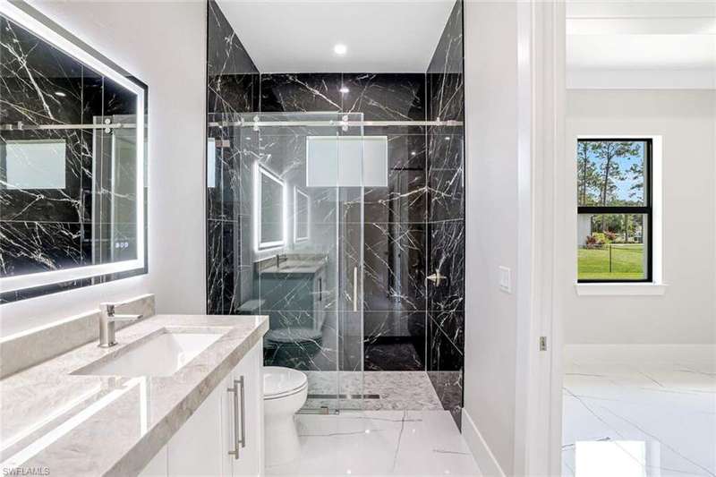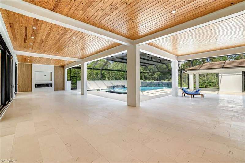 Gorgeous open-concept living area show cases a perfect blend of elegance and modern design. Gleaming large format porcelain floors flow throughout the space, reflecting abundant natural light that pours in through expansive glass sliders. The coffered ceilings with recessed lighting and a sculptural chandelier add architectural depth and sophistication. The gourmet kitchen features a grand island, premium cabinetry, and professional-grade stainless steel appliances framed by sleek quartz counters and a striking backsplash. Beyond the living area, oversized sliding doors open to a resort-style lanai and pool, creating a seamless connection between the interior and the tranquil outdoors ideal for both everyday living and entertaining. Step outside to a resort-inspired oasis where every detail was crafted for relaxation and entertainment. The custom pool showcases multiple water features, arched jets, and a swim-up bar-perfect for sunset gatherings or weekend lounging. A spacious sun shelf and elevated spa with spillover edge invite you to unwind, surrounded by shimmering mosaic tiles and lush preserve views. The covered lanai elevates outdoor living with its warm wood-accented ceilings, recessed lighting, and a sleek built-in fireplace creating an inviting atmosphere for year-round enjoyment. The expansive screened enclosure seamlessly connects each zone, offering privacy, style, and a true indoor-outdoor flow. Altogether, this home embodies the pinnacle of modern luxury and resort comfort, designed to impress and built to entertain.