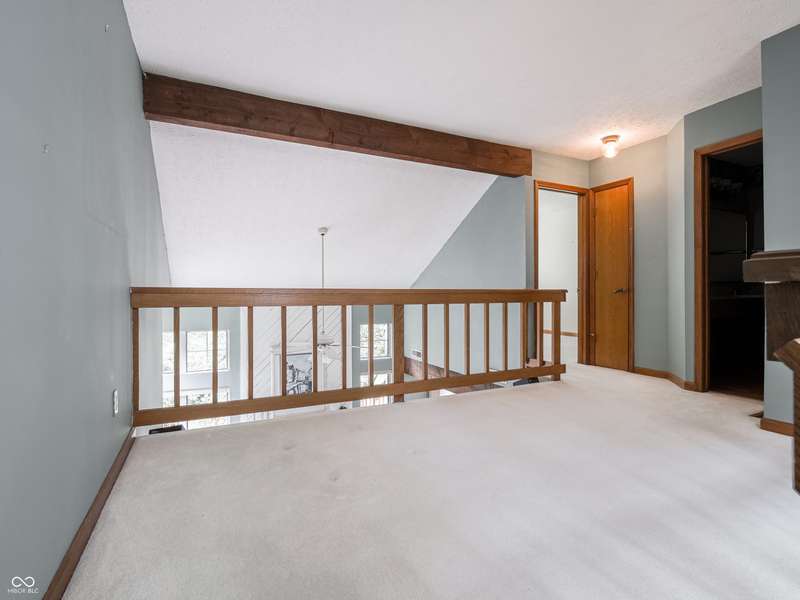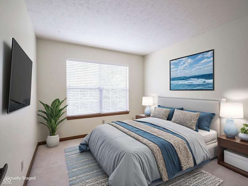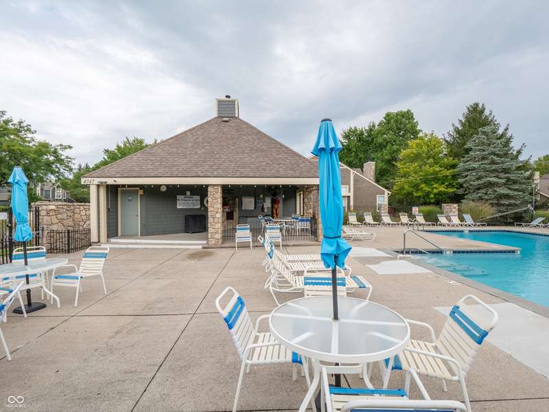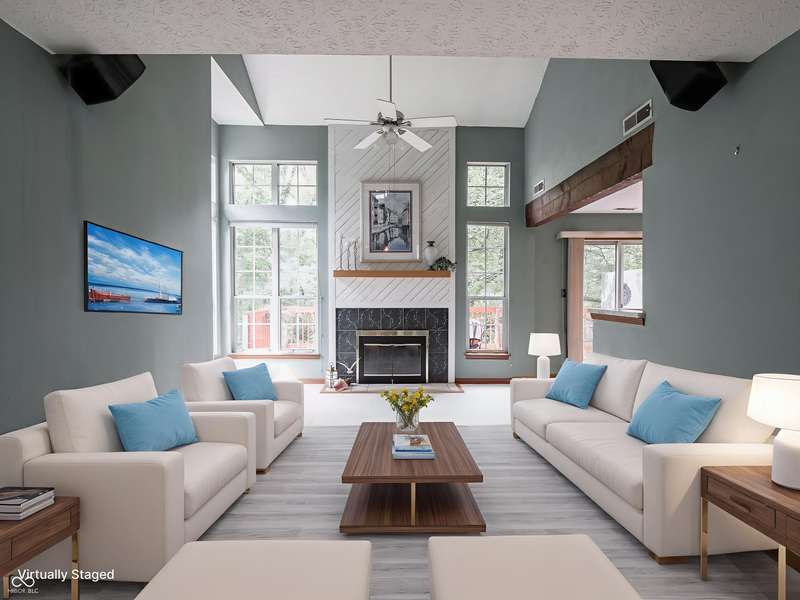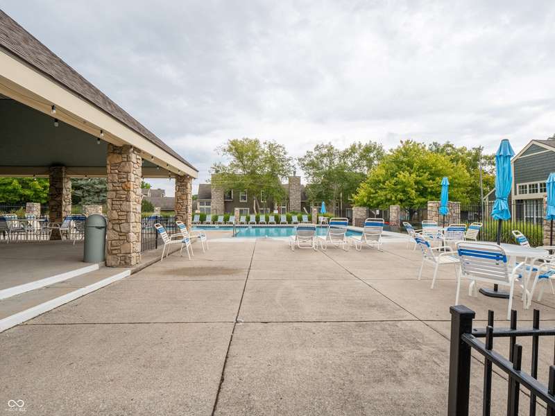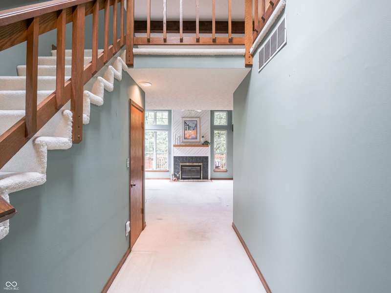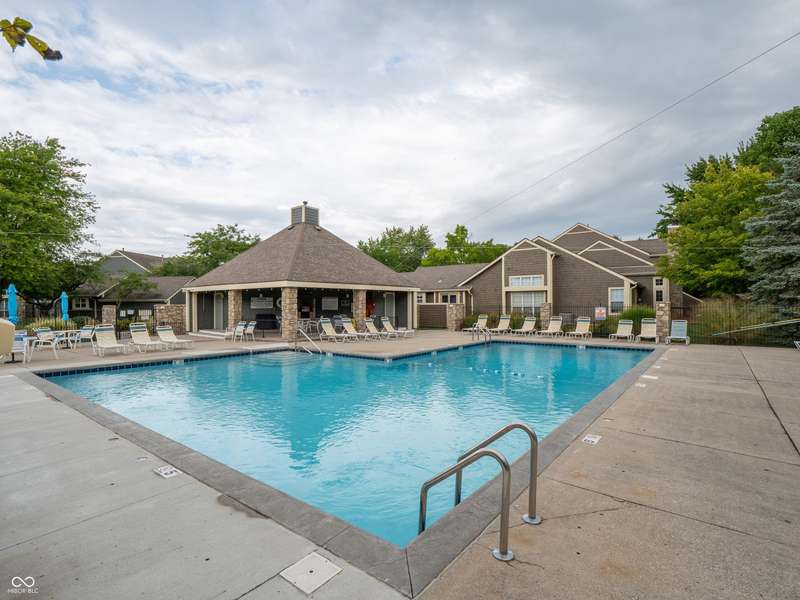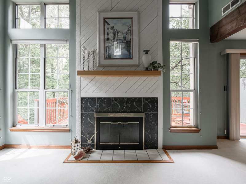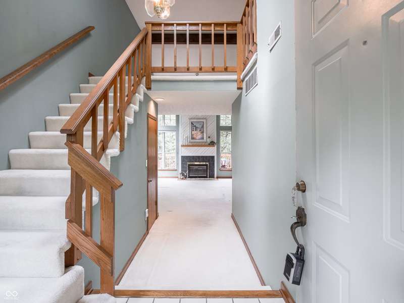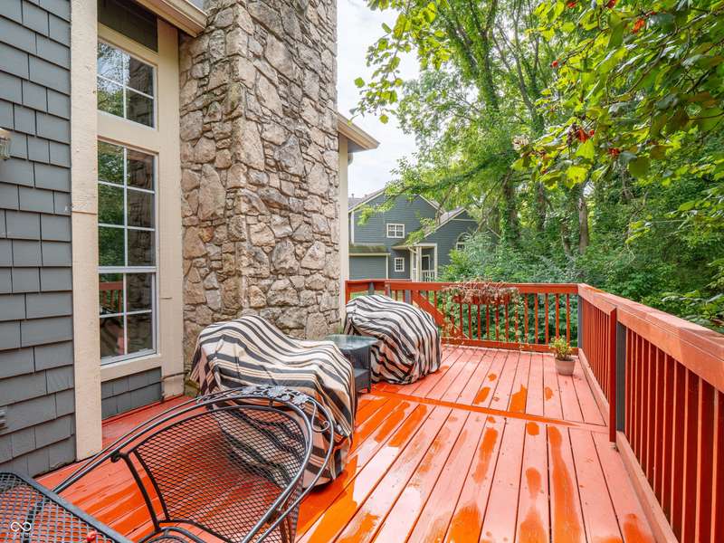 Welcome to Cobblestone at Eagle Creek! This charming 2-bedroom, 1.5-bath end-unit townhome offers a perfect blend of comfort, style, and convenience in one of Indianapolis' most tranquil communities. Step inside to a light-filled great room featuring a dramatic floor-to-ceiling stone fireplace, soaring ceilings, and walls of windows that bring the outdoors in, giving you the feeling of living in your very own treehouse retreat. The open-concept design flows seamlessly into the dining and kitchen areas, where you'll find space for everyday living or entertaining. Enjoy your morning coffee or evening unwind on the private back deck, steps from the neighborhood pool. A washer and dryer are included for your convenience. Upstairs, you'll find a versatile loft area, two spacious bedrooms, and a large full bath. The primary suite impresses with a large picture window that fills the room with natural light. Cobblestone residents love the quiet, tree-lined streets and unique architecture that create a warm, welcoming atmosphere. The location is unbeatable-just minutes from Eagle Creek Park and Reservoir, with endless trails, water activities, and nature escapes. Dining at the local favorite Rick's Boatyard Cafe, shopping, and quick highway access make this a truly connected yet peaceful place to call home. If you're looking for a stylish, low-maintenance home that feels like a nature escape right in the city, this is it!
