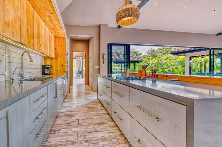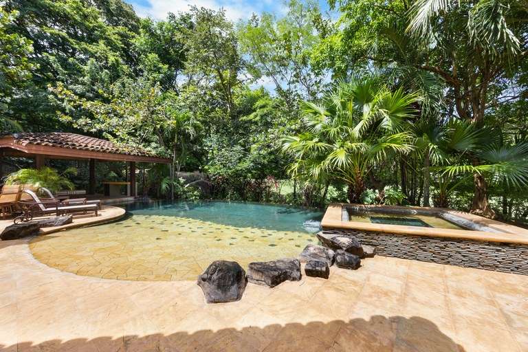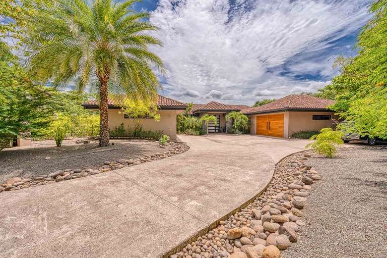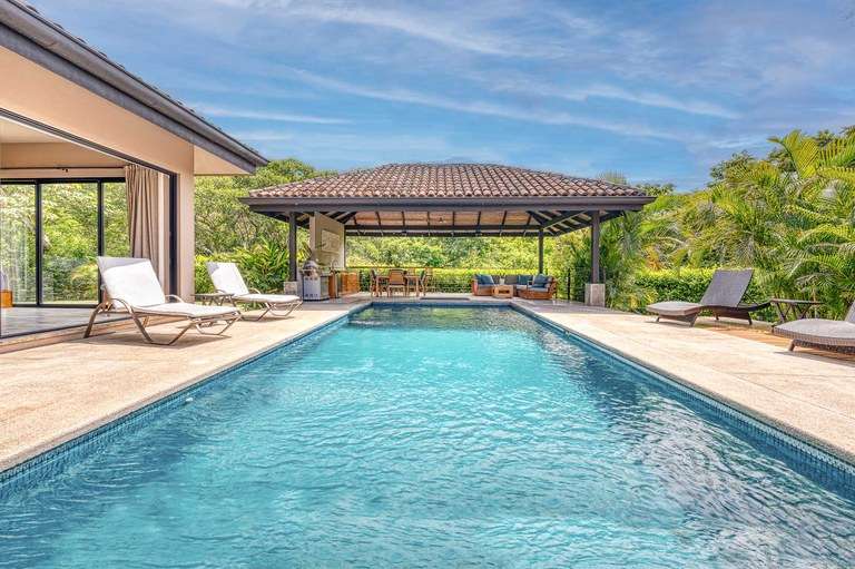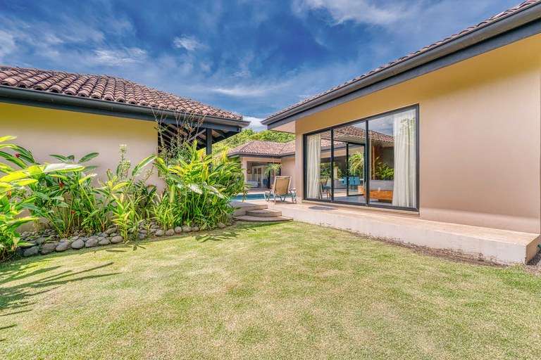 This home is located in Los Almendros, a guarded community inside of Hacienda Pinilla. It has 5 bedrooms and 4 bathrooms. Once entering the property, one will notice the spacious parking lot leading into a large door that opens up to an open space where one can find the living room, dining area, and kitchen in the same space. This space has large glass doors that open up to the pool, creating the perfect balance between outdoor and indoor living. On one side of the house, one can find 3 bedrooms, one with a direct view of the pool and the one next to it has direct access to the garden; these share a large bathroom with a double vanity sink and an outdoor shower. Then there is another door leading to an inside garden and another bedroom with 2 beds and one bathroom. Besides this room, there is the laundry room.