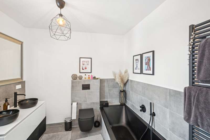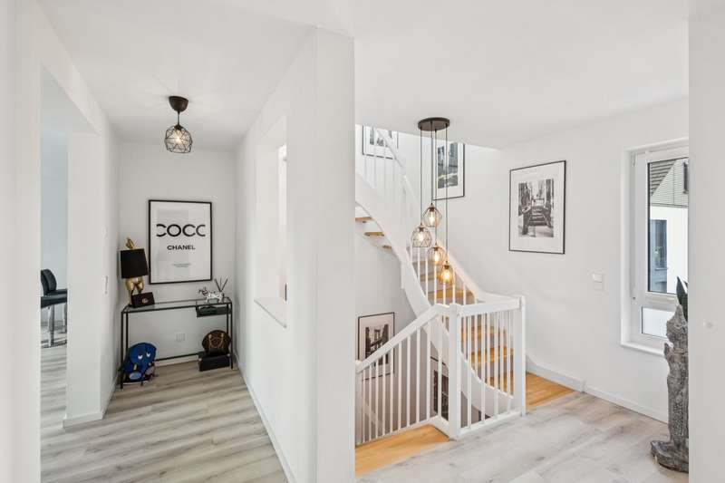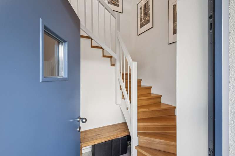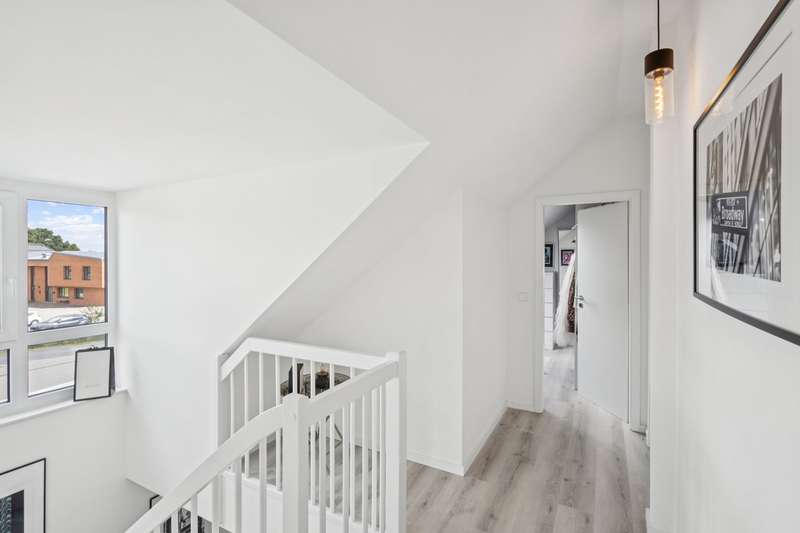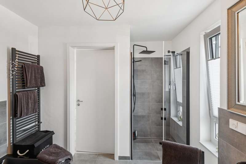 This modern, high-quality end terraced house was built in 2020 as a solid construction and is in an extremely well-kept, almost new condition. With a living space of approx. 132.3 m², spread over 4 rooms, the property offers generous living comfort on two levels. Access is via a separate, private entrance area on the first floor. From here, an internal staircase leads directly to the second floor. Here you will find an open and bright eat-in kitchen, a flexibly usable study or bedroom, a modern bathroom with shower and bathtub, a utility room and a spacious balcony. On the top floor there are two further bedrooms and a walk-in closet, which offers additional comfort. The home's fittings meet the highest standards: PVC windows with double glazing and electric shutters, an energy-efficient gas condensing boiler combined with underfloor heating and an energy efficiency class A rating underline the modern standard of the property. Two allocated parking spaces, one of which is covered, and a tool shed round off the offer. This property offers a rare opportunity for discerning buyers who value quality, efficiency and an exclusive living environment.