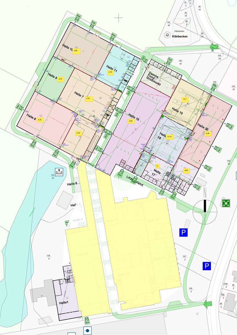 Welcome to a spacious commercial site with a total hall area of approx. 30,110 m² and a vacant plot area of approx. 30,000 m². This versatile property offers companies an ideal solution for storage, logistics and transportation. Available areas: Currently 10 of 11 halls are available. The hall sections can be rented individually or as a whole as required. There is also 30,000 m² of open space available for project planning or free use. The space will be realized by demolishing halls 01-06, halls 12 to 15 and the administrative wing on the site. Wide range of possible uses: The property has spacious hall areas that are ideal for various types of storage and logistics: - Intermediate and buffer storage - Distribution and supply warehouse - Picking and transshipment warehouse - Delivery or distribution warehouse - Procurement warehouse - Project planning for new construction projects In addition, two hall sections are available that can be used as high-bay warehouses or expanded accordingly. Flexible letting options: Whether individual tenants or shared use - the aim is to create a future-proof complex that meets the requirements of modern logistics. The cold storage halls can be adapted to different types of use. The halls currently offer economical and spacious use. In principle, the above-mentioned types of storage would be possible, but production, trade and distribution, workshops, exhibition and sales areas could also be integrated into the overall complex and expanded as required. Forward-looking development: The site is designed as a long-term project with extensive investment in the future. The halls are currently in a usable condition and can be occupied immediately for from €2.0/sqm. Only cold halls are offered. If warm halls are required, this could only be realized after appropriate coordination. Planned refurbishment: In close coordination with the new tenants, the space will be gradually refurbished and modernized to enable individual use. The respective rental price and rental period will be agreed individually with the landlord depending on the investment. Fulfillment warehouse and external service providers: The option of a fulfillment warehouse has already been created for efficient logistics organization. Here, an experienced service provider is available for external support in order to tailor processes such as storage, order picking and shipping to your individual needs. This service provider is also currently on site and is very familiar with the property. Alternatively, you can also organize your logistics completely yourself. Your benefits at a glance: - Flexible space adjustment as required - Suitable for numerous warehouse types and logistics processes - Future-oriented modernization in close coordination with the tenants - Can be used as a high-bay warehouse - Optional support from fulfillment service providers Project planning of the open spaces: Together in coordination, tailor-made construction projects can be realized that are precisely adapted to the requirements of your company. Whether production hall, high-bay warehouse or a combined administration and warehouse building - the open spaces offer sufficient space and flexibility to plan and implement a modern and future-oriented building. Take the opportunity to optimize your warehouse and logistics processes at a strategic location. Contact us for more information or a viewing!