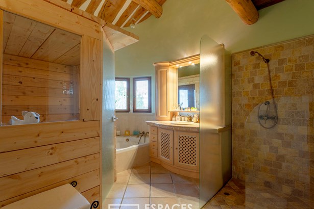 Spread over 3 levels, the property, entirely facing the terraces to the south and east, offers a large living room, an open kitchen, 3 bedrooms, 2 bathrooms, one with a sauna, 1 shower room, and 3 toilets. Also on the 3rd level, there is an office and a 6th room for an additional bedroom, with a shower room, and a 4th toilet.