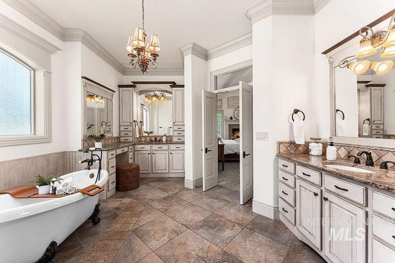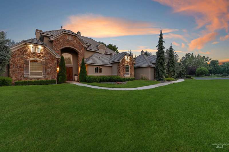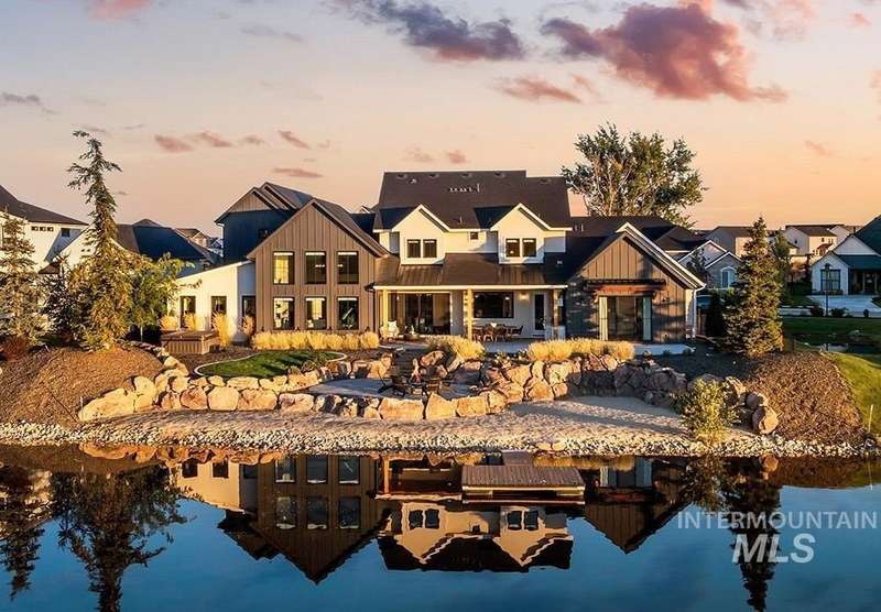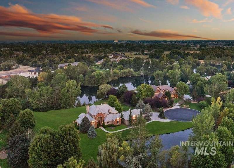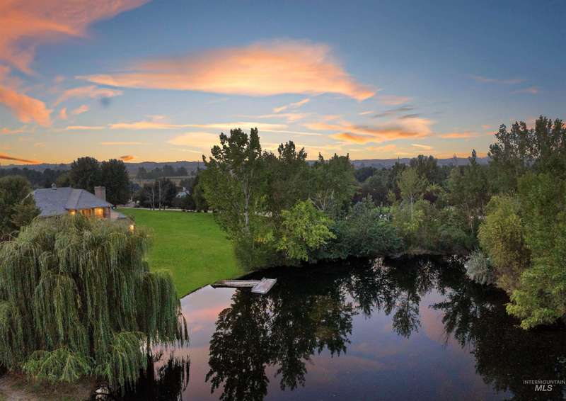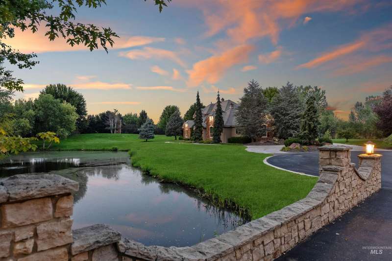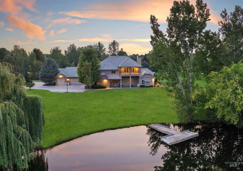 Nestled setting with lakes on both sides in an exclusive Eagle location! Over $40,000 in new interior paint! Spectacular, irreplaceable lot with breathtaking mountain views, the serenity of being just steps from the Boise River, multiple waterways & towering mature trees. Superior custom-designed home offers unparalleled luxury & sophistication. Over 4500sf with endless upgrades such as triple crown molding, rich hardwood floors throughout & abundant windows to take in the breathtaking views. Chef's kitchen is a masterpiece, featuring slab granite counters, custom cabinetry, top-end appliances & spacious pantry. The main-level master suite is a true retreat, boasting a fireplace, walk-in tile shower & clawfoot soaker tub. Upstairs, the balcony provides stunning eastward views of the mountains & overlooks the tranquil water. The oversized 40x28 garage offers ample space. Enjoy full irrigation water rights & 50+ acres of surrounding open space.