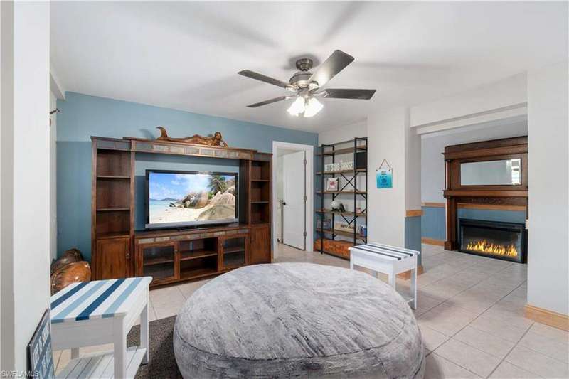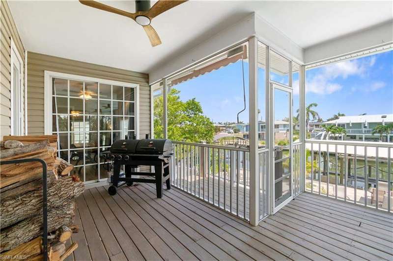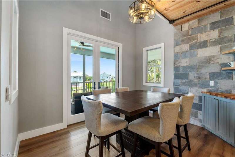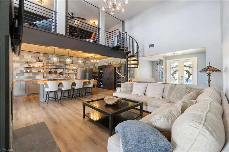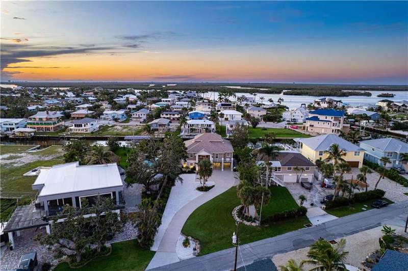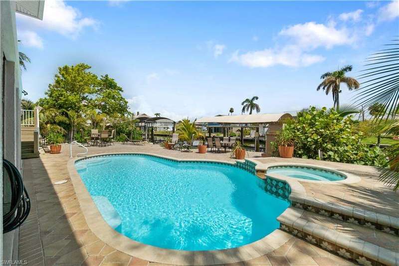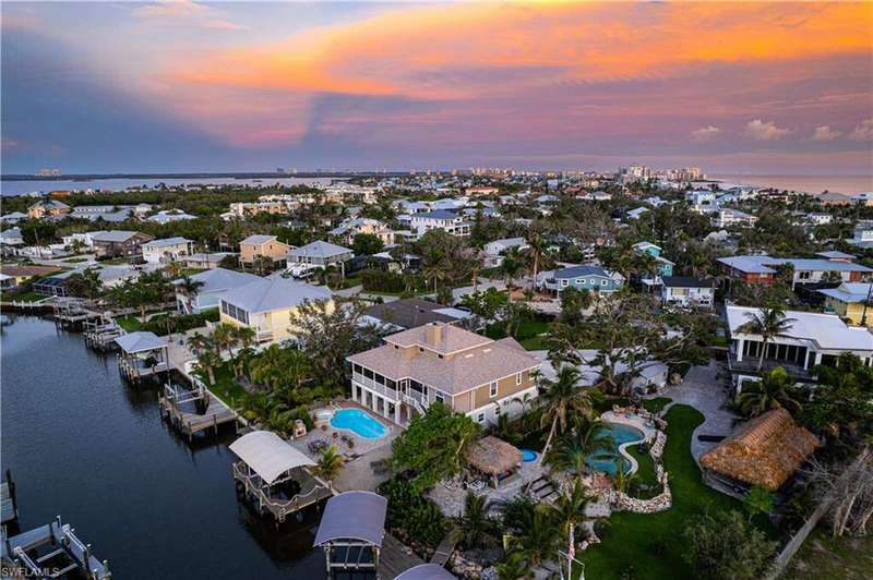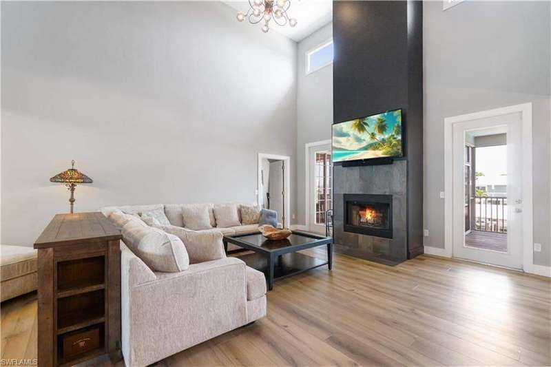 Stunning coastal retreat with breathtaking water views, nestled on an oversized lot on Fort Myers Beach. Just a short 5-minute walk to the beach, it's a true sanctuary for beach lovers and boating enthusiasts alike-complete with direct Gulf-access from your private dock featuring a 10,000 lb lift and canopy. The resort-style backyard is designed for both relaxation and entertaining, with a spacious screened-in second-floor balcony, large pool, spa, and multiple lounge areas-including your own private beach oasis. Inside, the open-concept floor plan is equally impressive with 3 bedrooms & a den, soaring 21-foot ceilings, beautiful wood-look flooring, and a charming wood-burning fireplace. The chef's kitchen has a unique modern design featuring wood-paneled ceilings, sleek steel accents, stainless-steel appliances, and a professional-grade 8-burner gas stove. The expansive primary suite is a true retreat with its own attached den/seating area and a spa-like bathroom offering dual rainfall shower heads, dual vanities, and a deep soaking tub. Upstairs, you'll find a spacious loft area that makes for the perfect media lounge. Additional highlights include versatile ground-floor flex space, a whole-house generator, and room to add a private elevator. Ideally situated on a quiet stretch of Estero Island, this extraordinary home is just minutes from fantastic restaurants and offers easy access to Lovers Key and Bonita Beach.