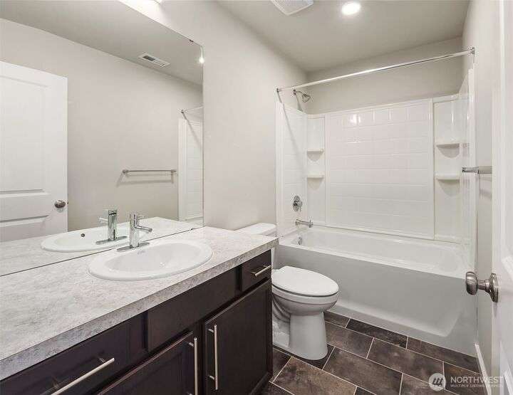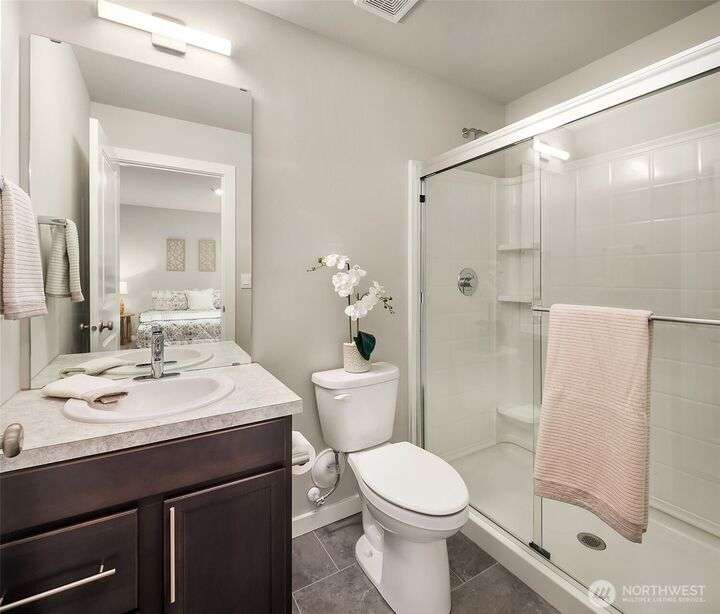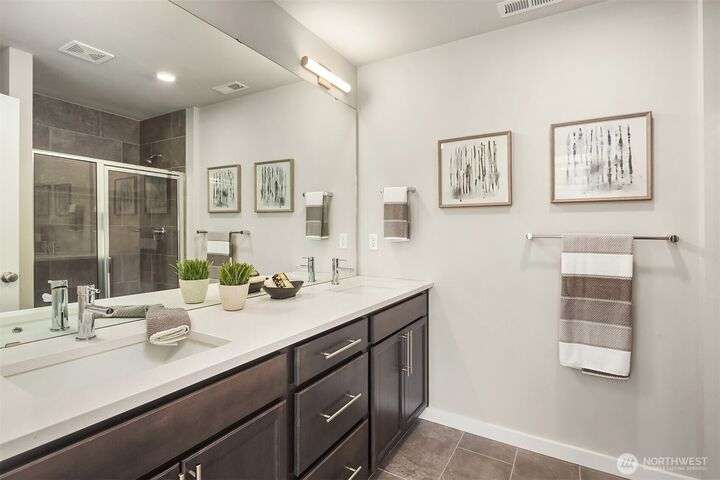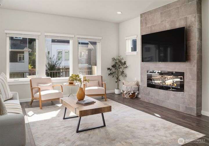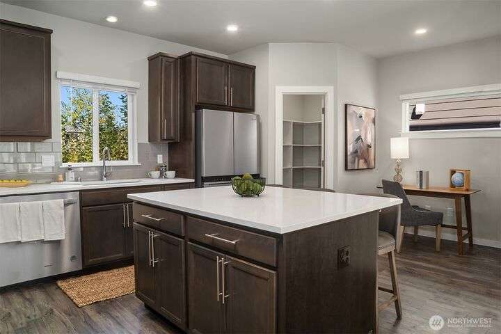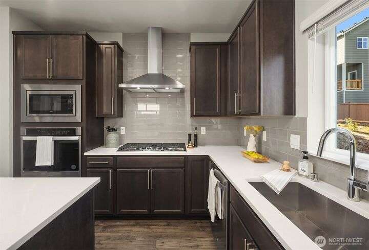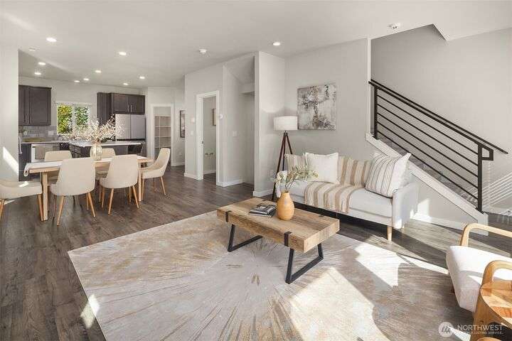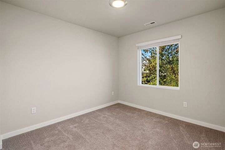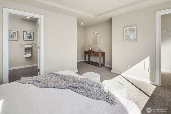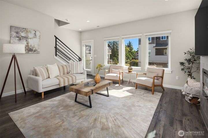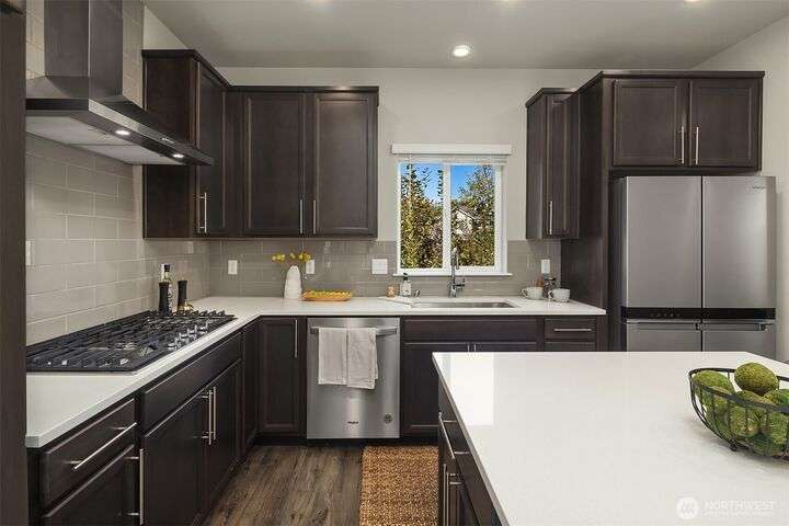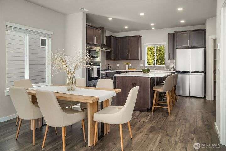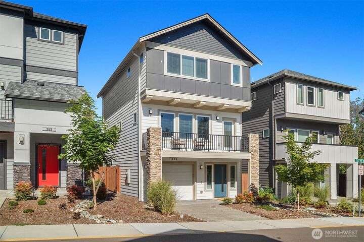 Located in the Northshore School Dist with 4 bedrooms, including 2 primary bdrms with en-suites, one conveniently located on the entry level-ideal for multigenerational living. The open-concept design is perfect for entertaining, showcasing a commanding kitchen island, high-end appliances, a dining space, office area and a spacious living room with an expansive wall of south-facing windows complete with door access to a charming deck. Upstairs boasts 3 additional bdrms, 2 bathrooms, laundry, and a luxurious primary suite with a generous walk-in closet & a spa-like 5-piece bathroom. Low-maintenance backyard next to a tranquil greenbelt, perfect for gardening, play, or simply relaxing. Air Conditioning, garage and additional outdoor parking.