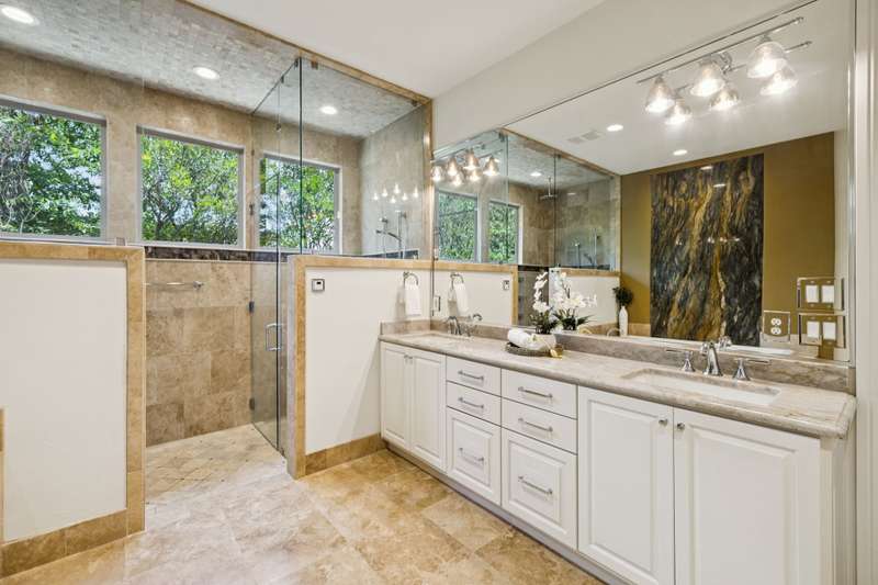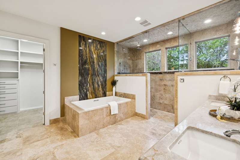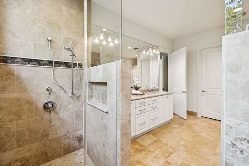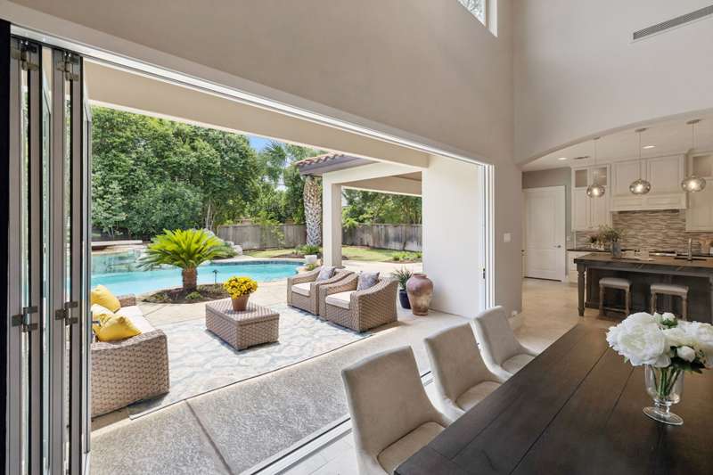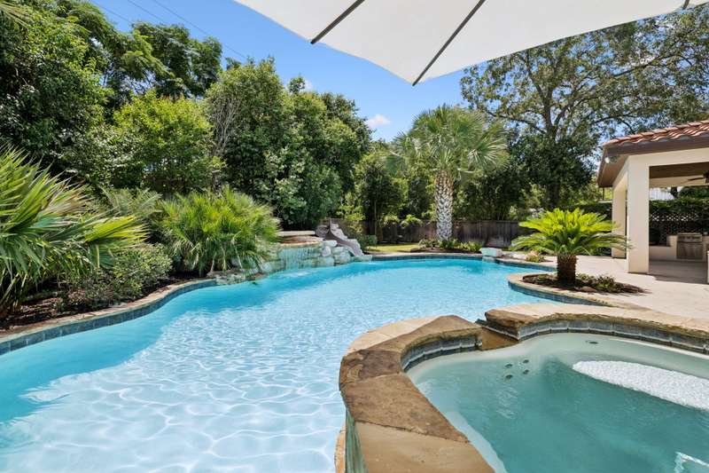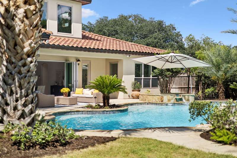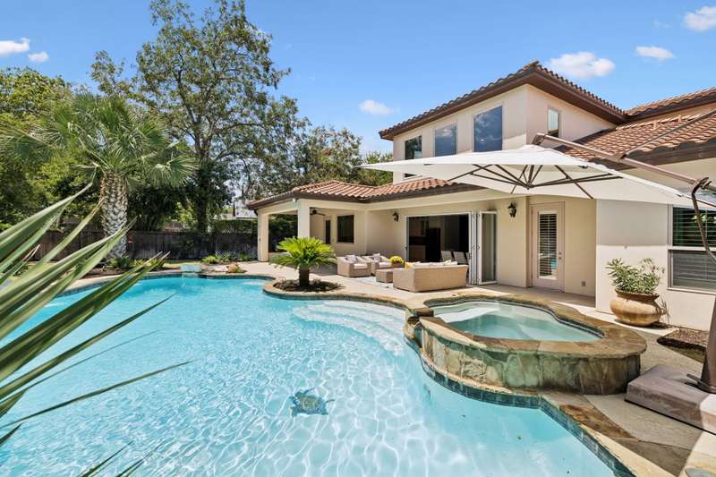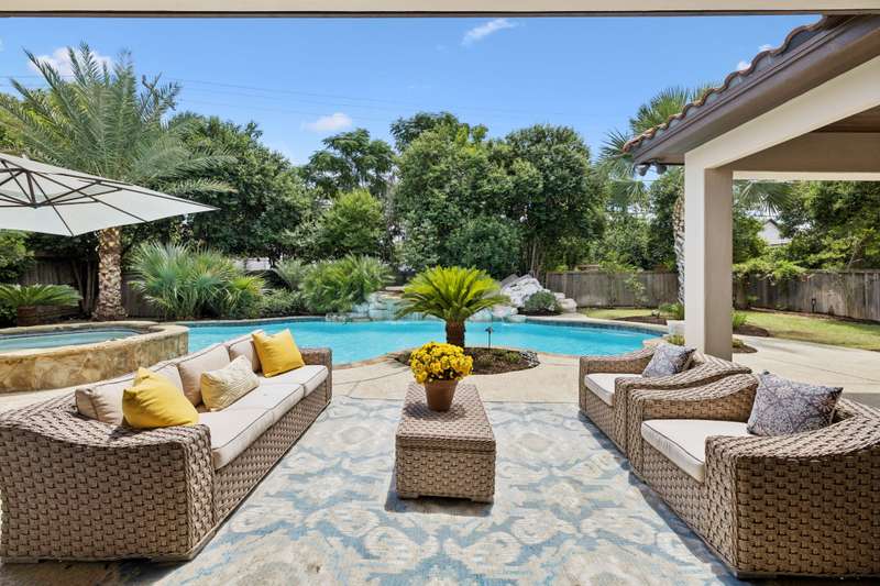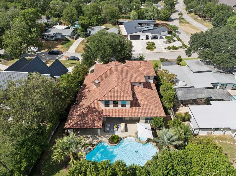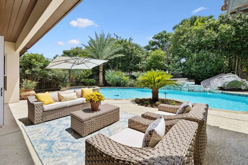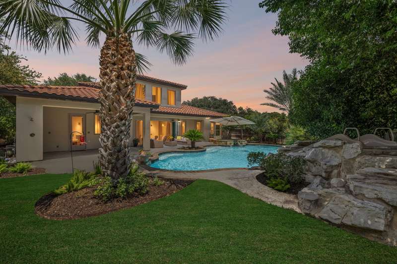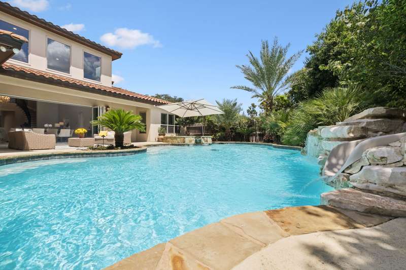 In one of San Antonio's most coveted ultra-luxury communities, this Burdick custom home pairs beautifully finished interiors with a year-round resort atmosphere. Hardwood and travertine floors lead through open, light-filled spaces with 25-foot ceilings, where quartzite and honed granite surfaces and striking light fixtures set an elevated tone. Two bedrooms, including the primary suite, are on the main level along with a private office and media room. The kitchen is anchored by a handsome stainless Wolf gas range and custom cabinetry. The primary suite features an incredible walk-in closet and a bath with a steam shower and a dramatic marble wall above the tub. Upstairs, a generous flex space adapts for storage, fitness, or a second office. Glass accordion doors open to a Keith Zars pool and spa with natural rock waterfall and slide, an outdoor kitchen with built-in grill and Green Egg, and an outdoor shower surrounded by lush landscaping and shaded terraces. 4 bed 4 bath 4258 sq ft .32 acre 25 ft ceilings Private study Media room Flex room Pool + spa w outdoor shower 3 car garage - 11/3/2025 3:15:14 AM