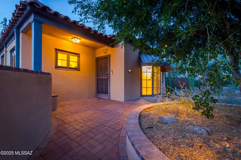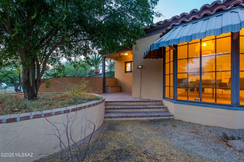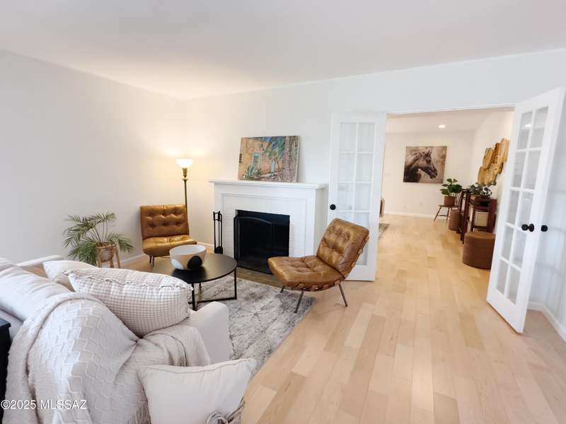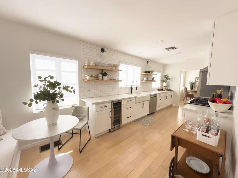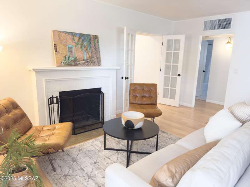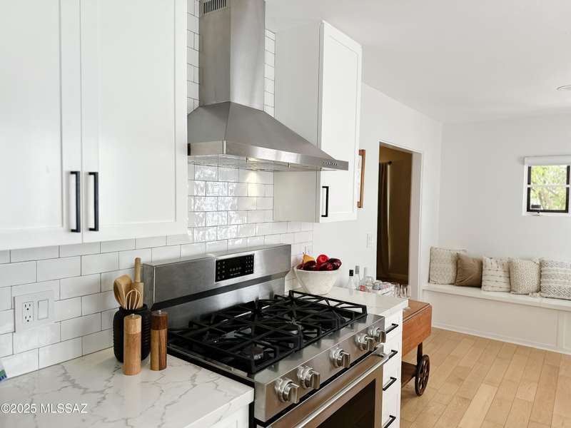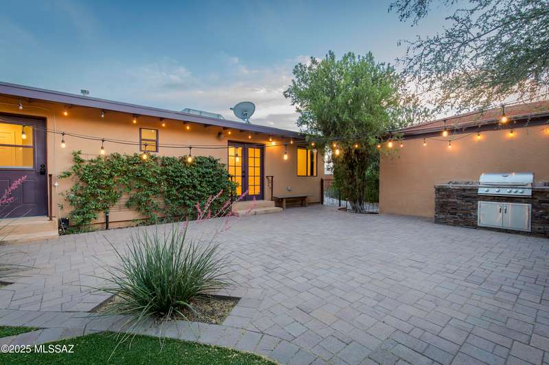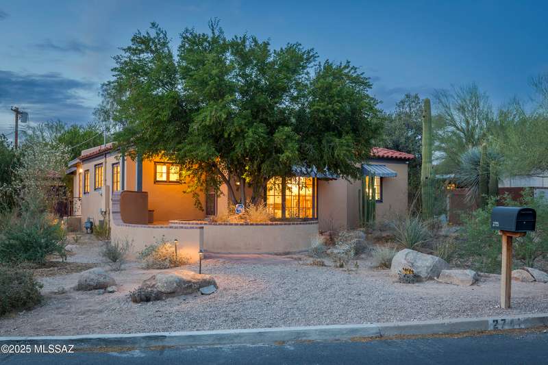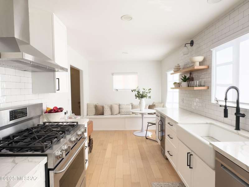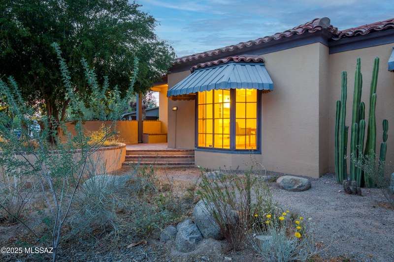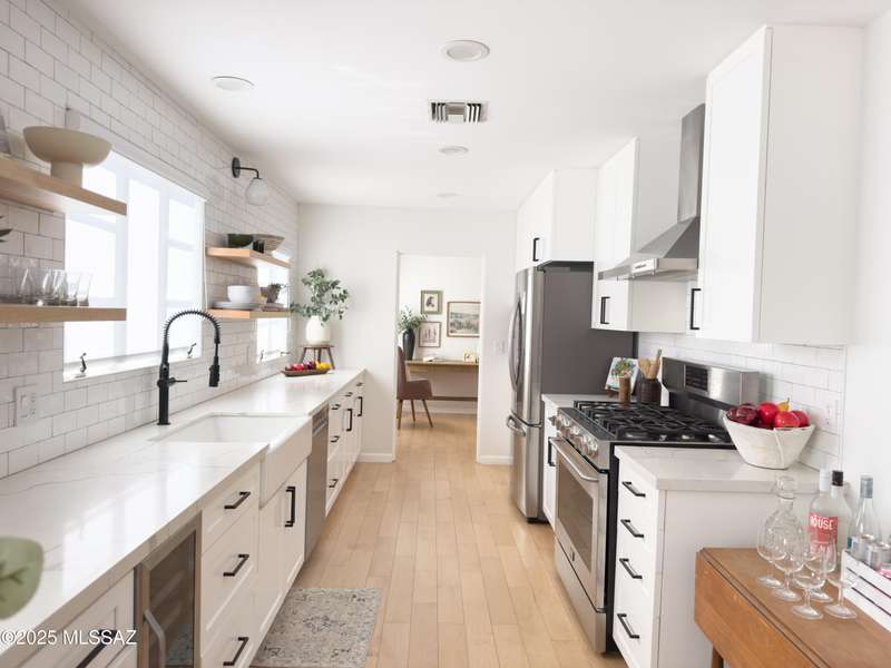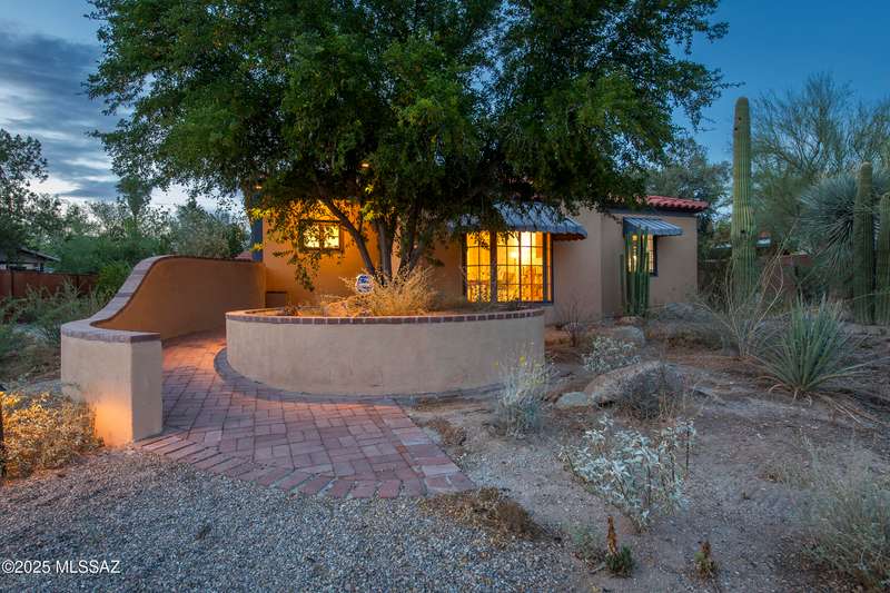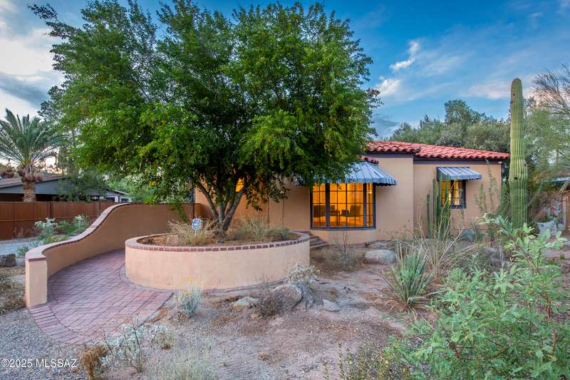 This Gem of a 3 bedroom, 2 bath bungalow perfectly blends historic charm with modern sophistication in one of Tucson's most sought-after neighborhoods. Lovingly maintained and thoughtfully updated, the home features gorgeous maple hardwood floors and a light-filled layout that invites you in.The kitchen is a stunning focal point-- quartz countertops, a crisp white tile backsplash, floating maple shelves, and a chef-worthy gas range and beverage fridge. The living room offers a stunning bay window that floods the space with natural light a true window to the neighborhood, along with a cozy wood-burning fireplace that adds ambiance to those cool desert nights.