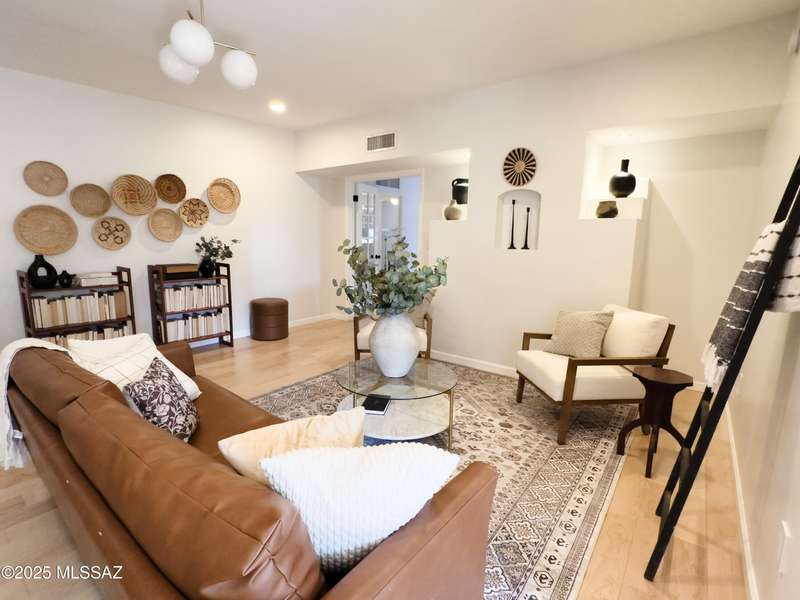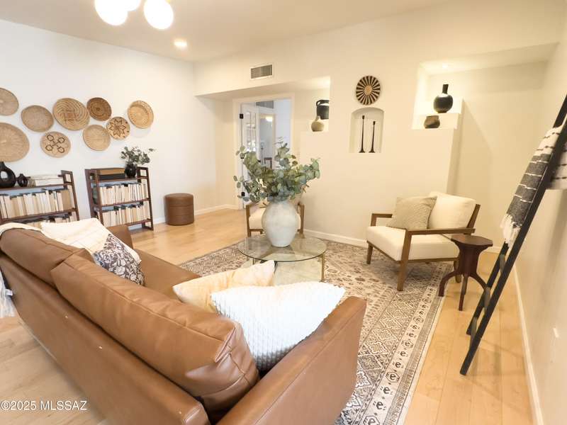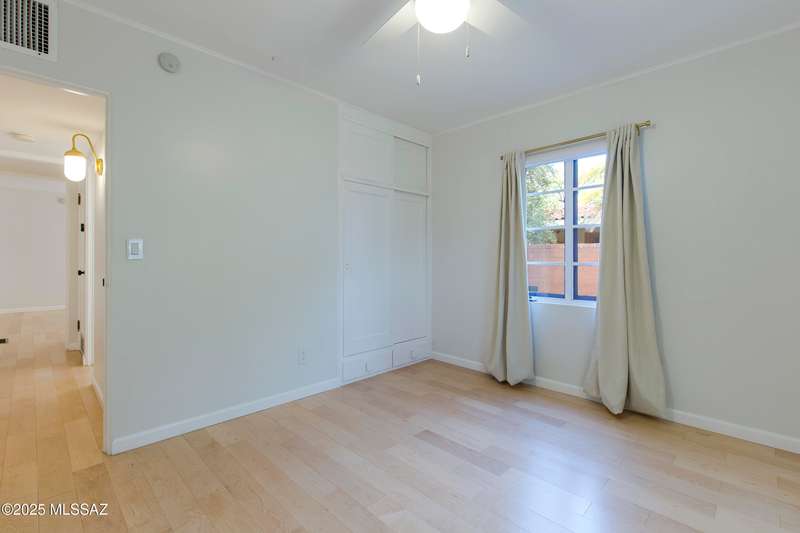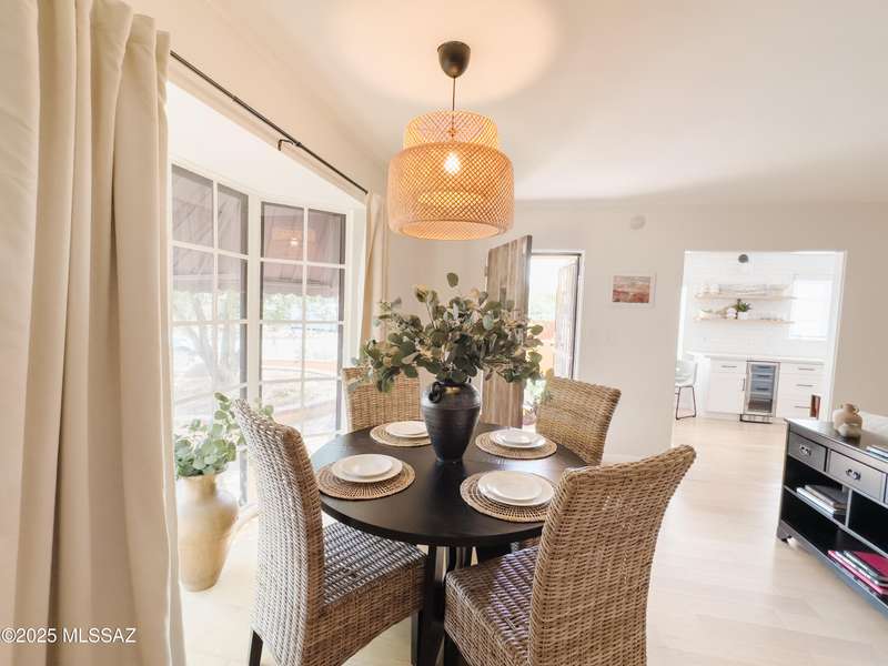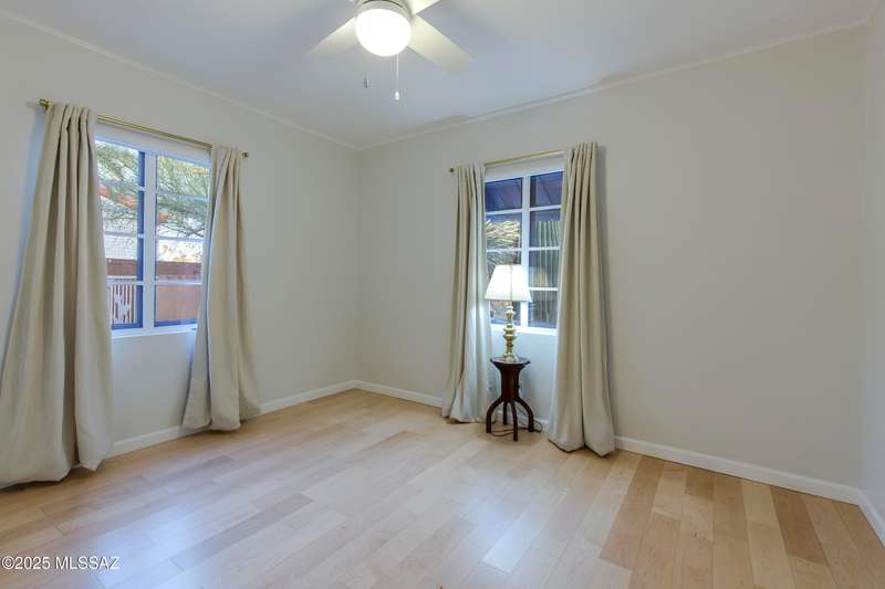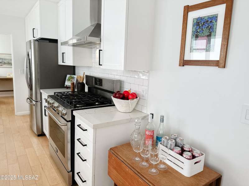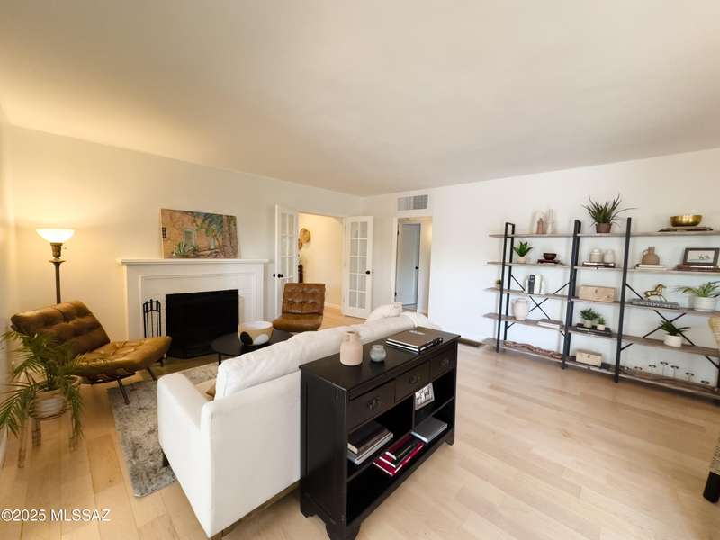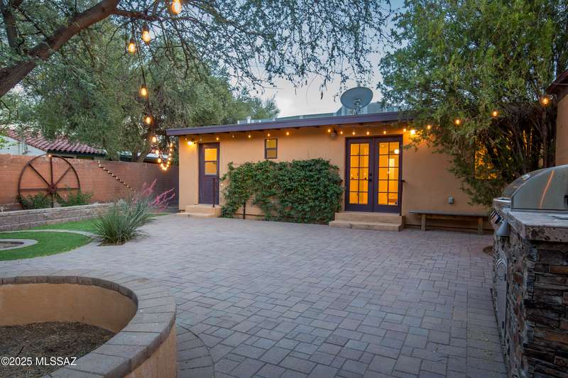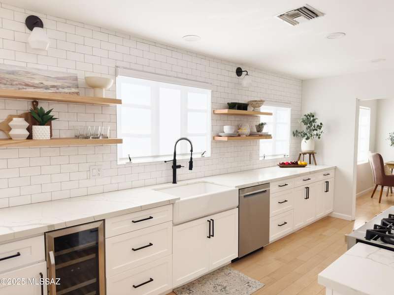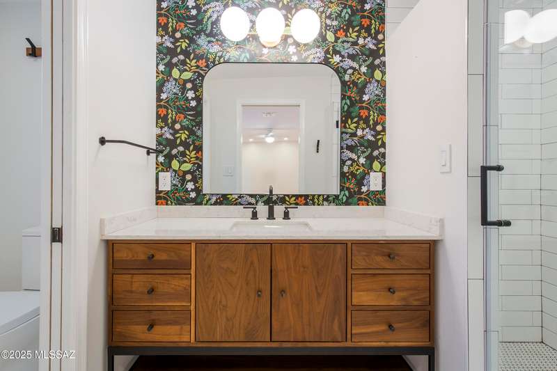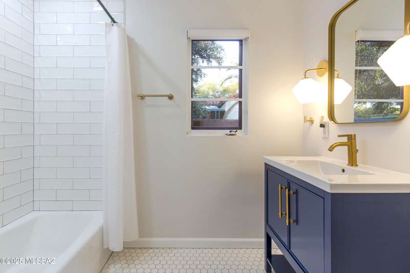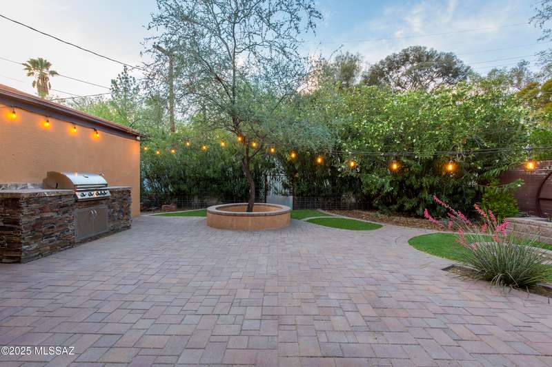 This Gem of a 3 bedroom, 2 bath bungalow perfectly blends historic charm with modern sophistication in one of Tucson's most sought-after neighborhoods. Lovingly maintained and thoughtfully updated, the home features gorgeous maple hardwood floors and a light-filled layout that invites you in.The kitchen is a stunning focal point-- quartz countertops, a crisp white tile backsplash, floating maple shelves, and a chef-worthy gas range and beverage fridge. The living room offers a stunning bay window that floods the space with natural light a true window to the neighborhood, along with a cozy wood-burning fireplace that adds ambiance to those cool desert nights.