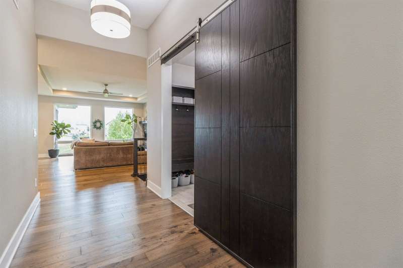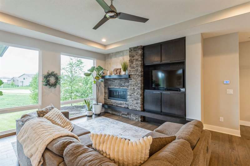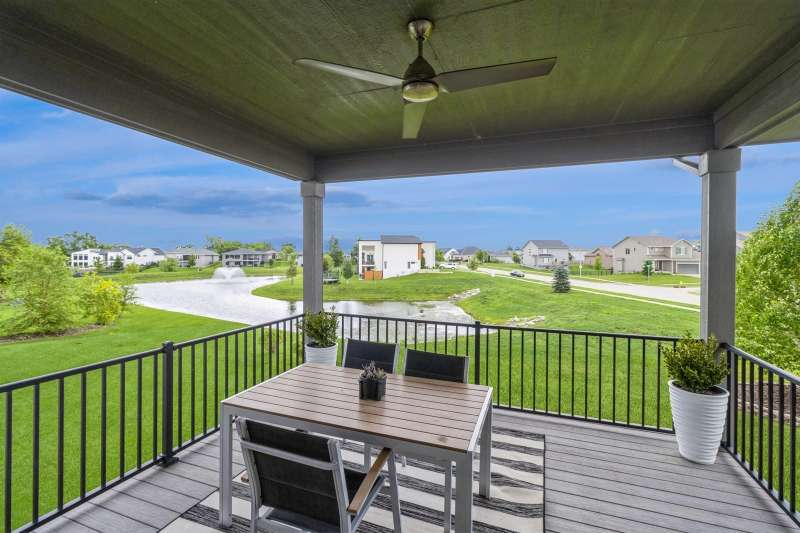 Welcome to your dream home. Custom-crafted and beautifully set on a corner lot with peaceful views of a pond and sparkling fountain. Enjoy wine on the covered deck or sunsets from your walkout patio- luxury and comfort await at every turn. Inside, the bright main floor features a spacious family room with floor-to-ceiling windows and a striking linear fireplace, offering warmth and style. The kitchen is a standout, with contemporary white cabinetry, custom tile backsplash, walk-in pantry, and large island-perfect for entertaining. New LG stainless steel appliances and a reverse osmosis system complete the space. The main level includes a primary suite with ensuite bath, two additional bedrooms, a second full bath, drop zone, and laundry room with sink. The finished lower level offers a large family room-perfect for game nights or movie marathons with wet bar and custom wine table, two more bedrooms, and full bath. Brand-new carpet just installed. The large 3-car garage is a hobbyist's dream: equipped with Swiss Trax flooring, cabinetry, storage, and 220V heater. A must-see!