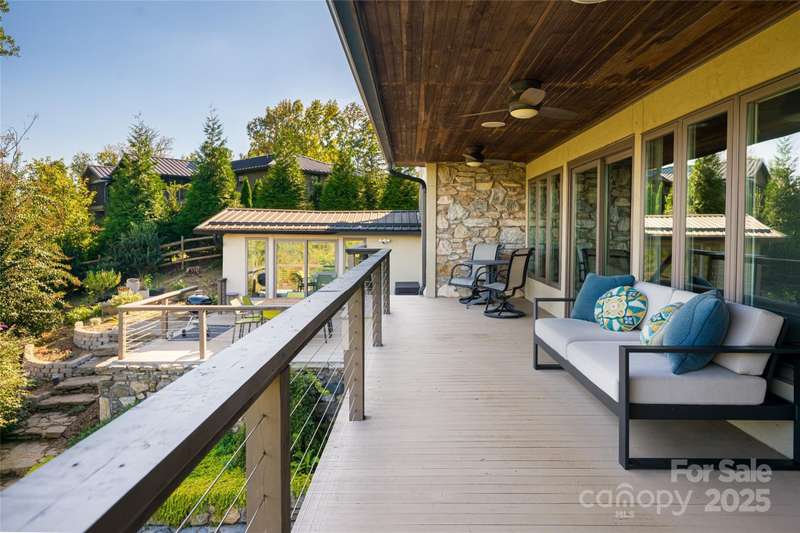 Discover Horizon Hill on Lookout Mountain-North Asheville's elite hilltop enclave with unmatched panoramic views. Expansive long-range vistas, tranquil surroundings and NO HOA set this location apart from all the rest. 79 Horizon Hill sits on the point of the mountain's crest with mountain views from every window. The home has a spacious primary suite, four stone fireplaces (two gas, two wood-burning), vaulted ceilings, and multiple decks for outdoor living plus a new flagstone patio. Updates include a young metal roof, 12.9 kWh solar array with two backup batteries, a hard coat stucco exterior that complements the natural stone, all new Andersen windows and doors, a multi-zone heat pump/AC, and professional landscaping with native plants. The large primary suite is a true retreat with a wood-burning fireplace, jetted tub, glass-enclosed shower, and stackable laundry. The lower level provides a second kitchen, living area, full bath and its own entrance-perfect for use as a rental or mother-in-law suite. Additional features include a two-car garage, abundant parking, and a 200 sq. ft. bonus room ideal for an art studio, office, gym, or craft space-all with mountain views as the backdrop. Move in ready because it includes all the furniture!!