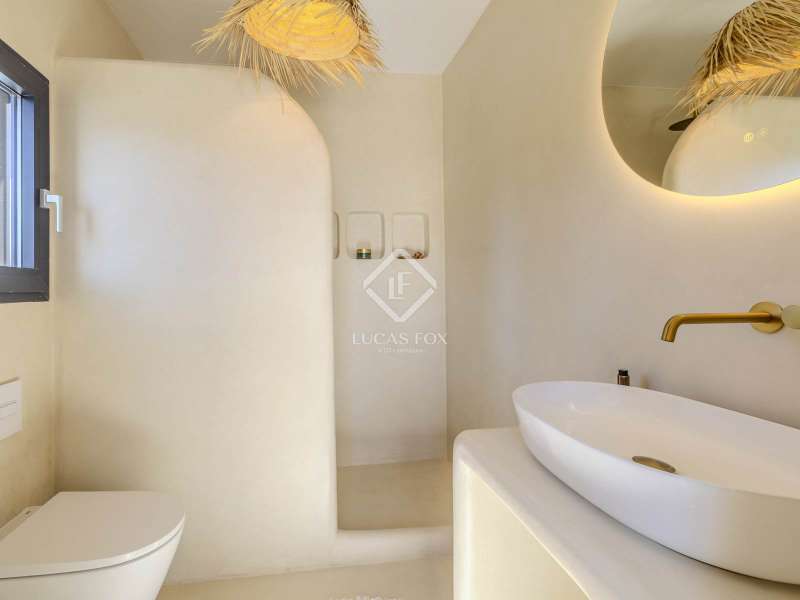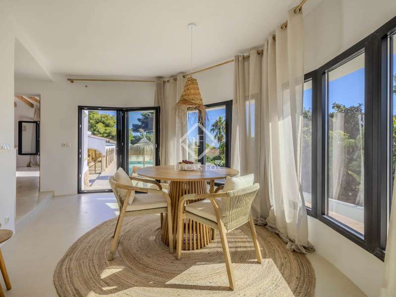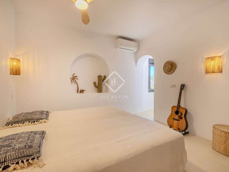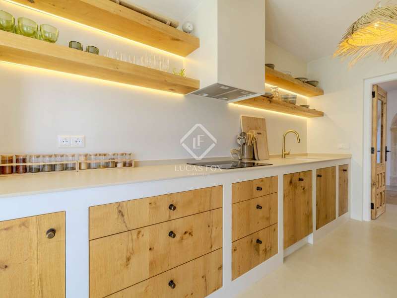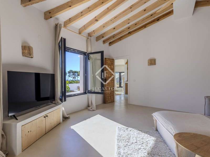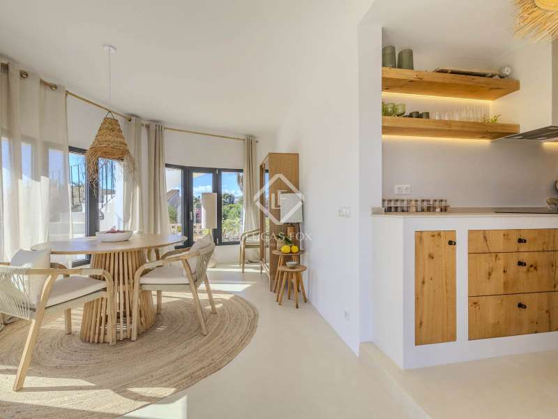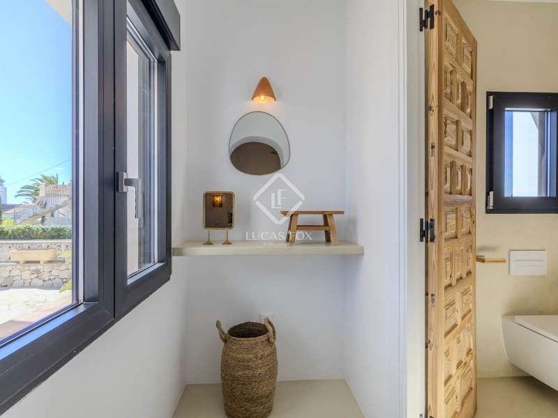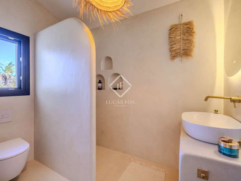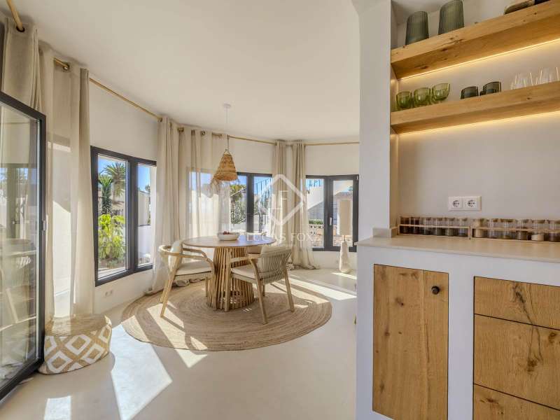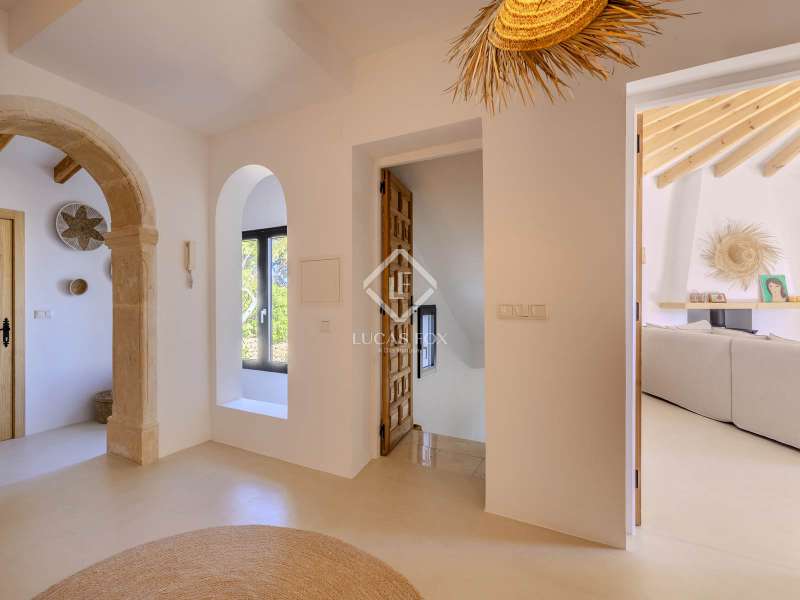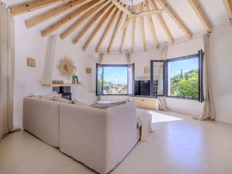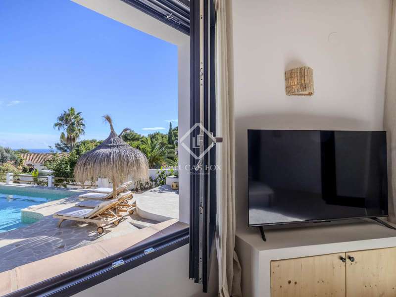 Located in the sought-after residential area of Balcón al Mar, this superb property enjoys an elevated position, ensuring wonderful sea views throughout. Recently completely renovated, the home beautifully combines timeless Mediterranean charm with modern luxury. The renovation includes all new double-glazed doors and windows, microcement floors, and original sandblasted Castellano doors, preserving character while enhancing comfort. The Ibiza-style kitchen features high-quality equipment, sleek finishes, and a relaxed yet elegant design. Access to the property is available via a pedestrian gate or through the private garage, which offers parking for one large vehicle. From the garage, an internal staircase leads to the lower level of the house, while a second staircase connects to the main hallway. The beautiful wooden front door opens into an elegant entrance hall with a guest toilet and built-in wardrobe. From the central hallway, we can access two bedrooms, both with their own en-suite bathrooms, the spacious living room, and the fully equipped kitchen. From the kitchen, the bright dining area opens through glass doors onto the terrace, where we can enjoy views of the pool, garden, and sea beyond. The living room also enjoys sweeping sea views and features a cozy wood-burning fireplace, adding warmth and ambiance during the cooler months. Natural light floods the home through its many windows, and there is hot and cold air conditioning throughout for year-round comfort. The lower level of the house offers a laundry and storage room that also houses all the technical installations. In addition, there is a versatile room with an en-suite bathroom and direct access to the terrace, ideal for use as a gym, spa, or extra guest bedroom. A winding staircase from the main terrace leads up to the roof terrace solarium, a true retreat offering both space and spectacular sea views, creating a tranquil and luxurious atmosphere. The pool terrace is one of the property’s standout features. The entire exterior has been newly tiled with “piedras alemán”, adding a refined and contemporary touch. The 10x5 metre swimming pool has been fully retiled with elegant Bali green tiles, surrounded by ample space for sunbathing and relaxing, as well as an outdoor shower. The low-maintenance Mediterranean garden is landscaped with gravel, mature hedges for privacy, and a variety of plants and fruit trees well-suited to the local climate. The property also includes a separate guesthouse, offering its own entrance, fully equipped kitchen, covered naya/living area, and a large double bedroom with an en-suite bathroom, ideal for guests or extended family seeking independence and privacy. On the side of the guest casita, there are two additional storage spaces, and at the rear of the property, an extra office space with its own terrace and sea views, a perfect spot for working from home in a serene setting. This wonderful, fully renovated villa, with its separate guesthouse, versatile additional spaces, and breathtaking sea views, is perfect as a family residence or as a luxurious Mediterranean retreat. Call us today to arrange your private viewing.