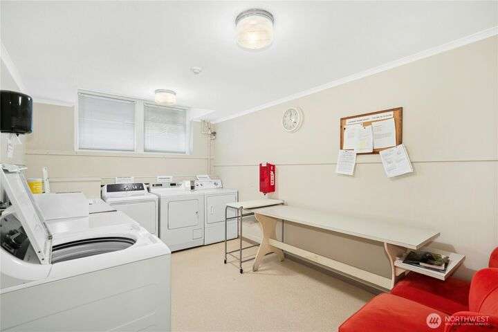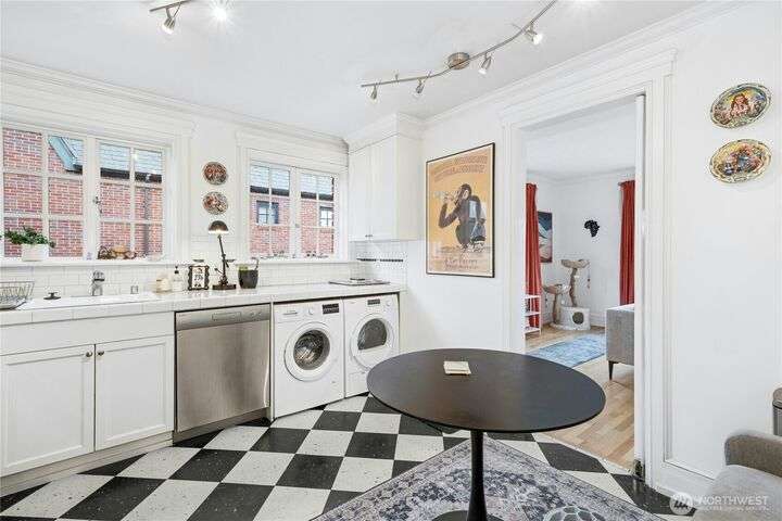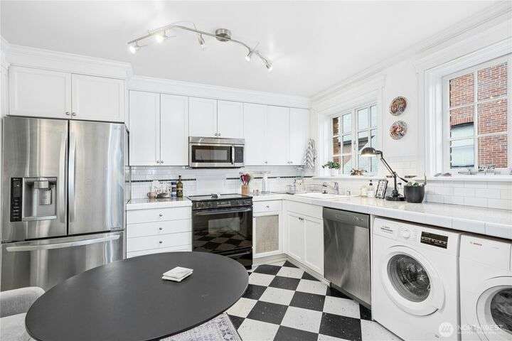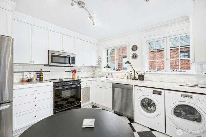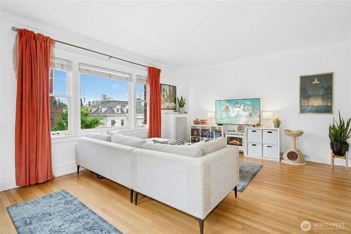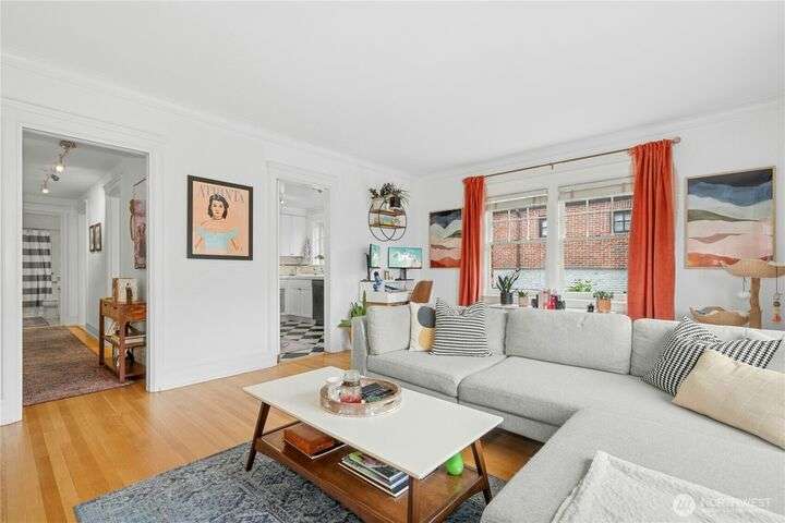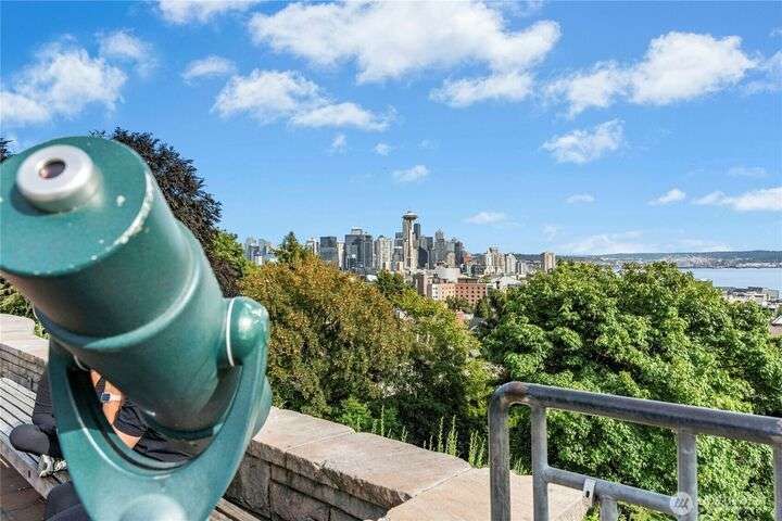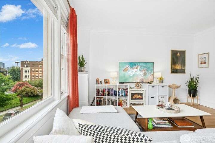 The Victoria is a stately classic building on scenic West Highland Drive near Kerry Park in the vibrant Queen Anne neighborhood. You are welcomed into a gorgeous landscaped courtyard before entering the well run and superbly maintained condominium. Enjoy the architectural details of the lobby before your vintage elevator ride. # 404 is a top floor light-filled corner unit. Features include oak hardwood floors, high ceilings, decorative crown molding, kitchen with eating space, newer appliances (in unit laundry), gorgeous bathroom with floor to ceiling subway tile, closet system, and city/Space Needle view from the living room. There is a storage unit and designated garage parking. The Victoria features a laundry room, bike room, and gym.