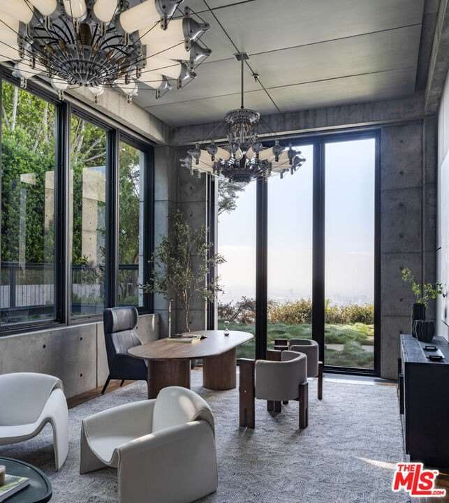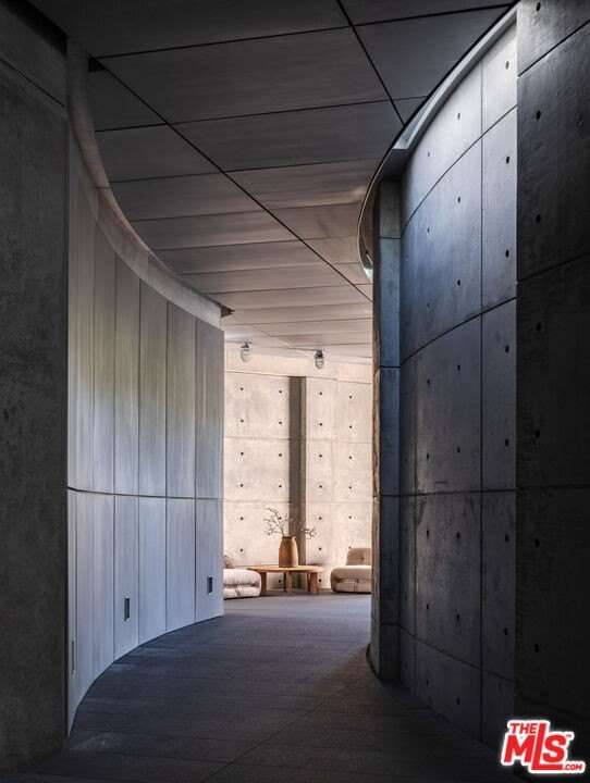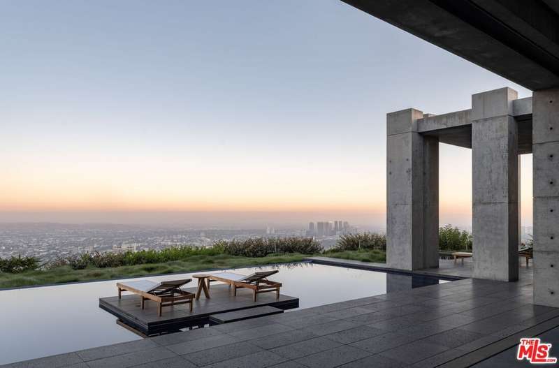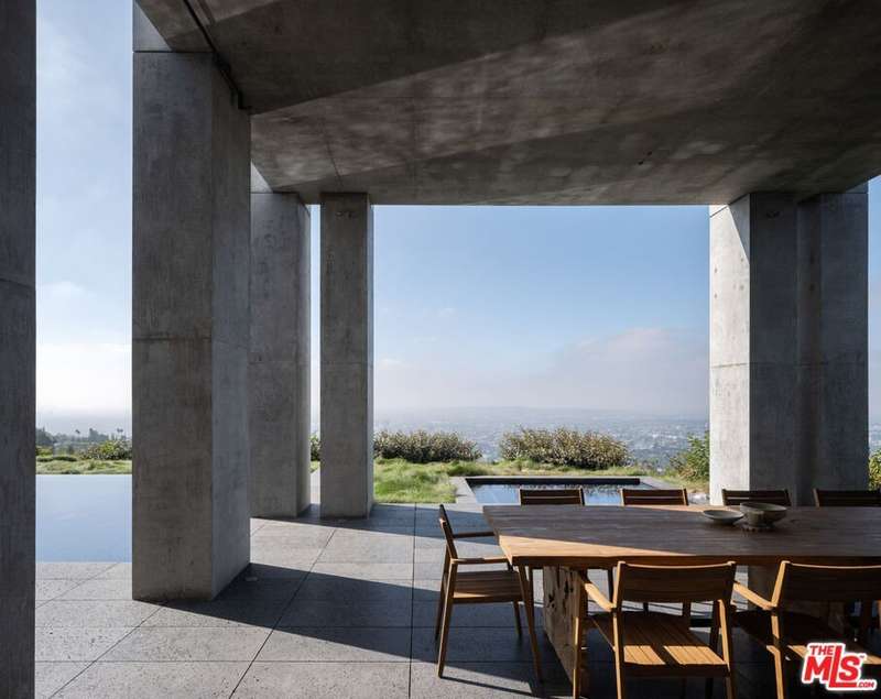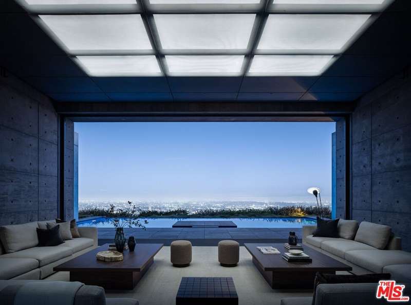 Set at the top of Trousdale, this unparalleled estate is a bold exploration of raw precision, industrial elegance, and sculptural architecture, all while capturing sweeping 180-degree southern views. Designed and built by the acclaimed ID Group, the home centers around a circular motor court enveloped by rhythmic board-formed concrete. Monolithic walls serve as both privacy buffers and dynamic light sculptures, casting dancing shadows from sunrise to dusk. Inside, the architectural intent continues with oversized concrete volumes, perforated metal ceilings, and brushed steel detailing. Framed views of the city and ocean command attention, most dramatically from the main living room, where a retractable glass wall opens to an infinity-edge pool and a horizon that stretches across the Los Angeles skyline. One of the home's most striking features, a fully exposed concept motorcycle, is installed beneath a skylit entry, serving as a dramatic showpiece. Skylights and deep architectural reveals filter daylight through the interiors, creating a constantly shifting interplay of light and shadow. Resort-caliber amenities include a state-of-the-art theater, a spa-inspired primary bath, manicured grounds, walk-in humidor, and meticulously curated one-of-a-kind fixtures. Every element of the home, from its structural form to its bespoke finishes, has been purposefully designed, making 410 Trousdale a truly singular modernist retreat in the heart of Beverly Hills.