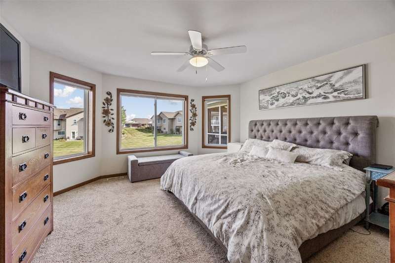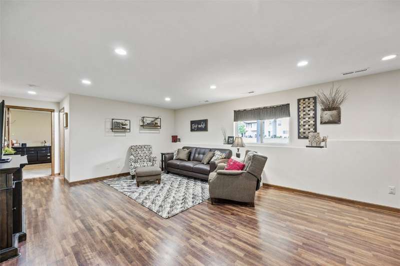 Welcome to your light-filled premium end-unit condominium home in the Villas at Prairie Knolls. Enjoy a carefree, low-maintenance lifestyle with a well-designed floor plan featuring a vaulted ceiling in the main living area, open great room and dining space, main floor laundry, double master bathroom sinks, and a spacious walk-in master closet. A new 3-season room (added in 2022) and rear deck overlook a large lot and green space, providing extra privacy from neighbors. The finished lower level includes large daylight windows, a full bathroom, and a generous bedroom. Additional highlights include a 2-car garage with code access, new roof in October 2020, and allowance for up to 2 pets under 110 pounds. Neighborhood amenities include a walking trail, lawn maintenance, snow removal, and insurance.