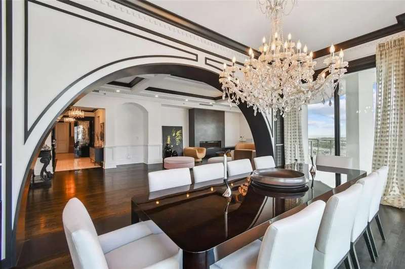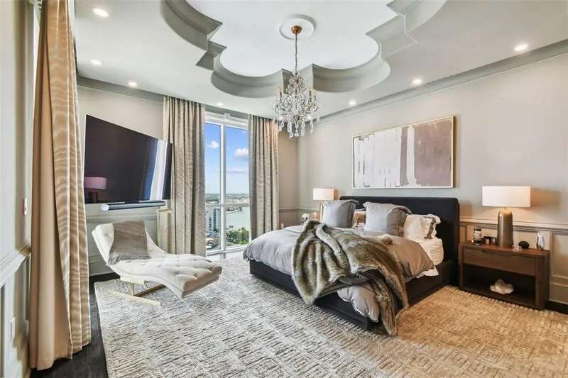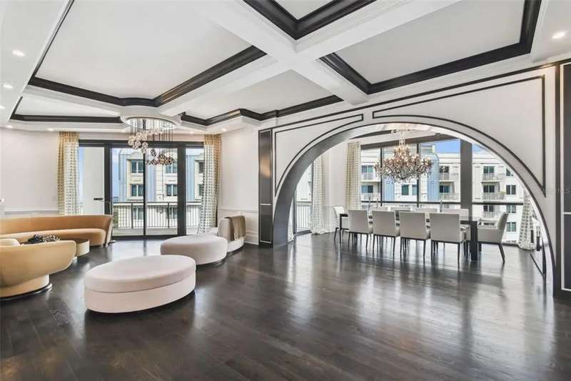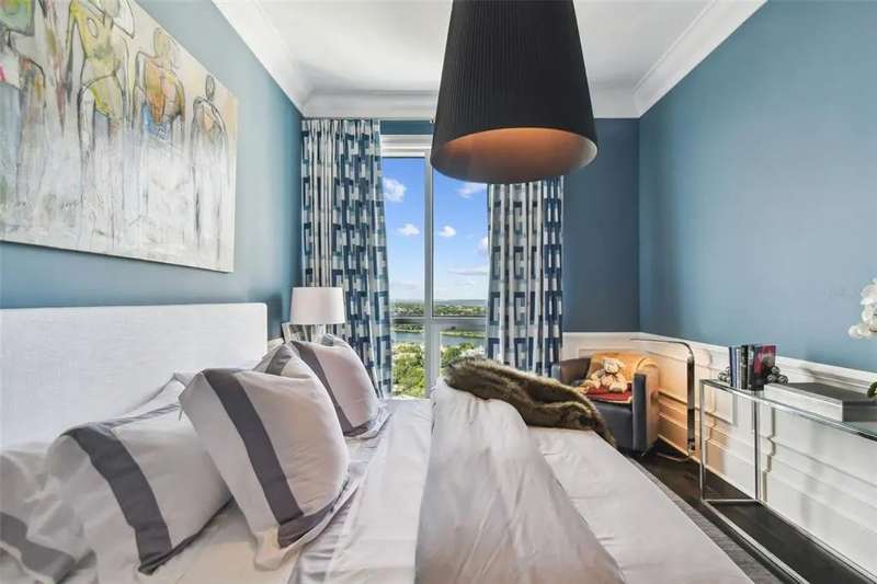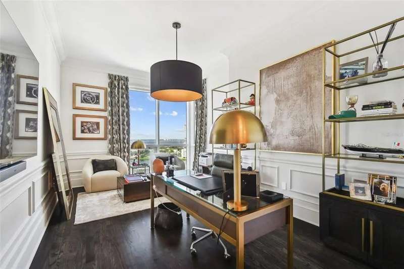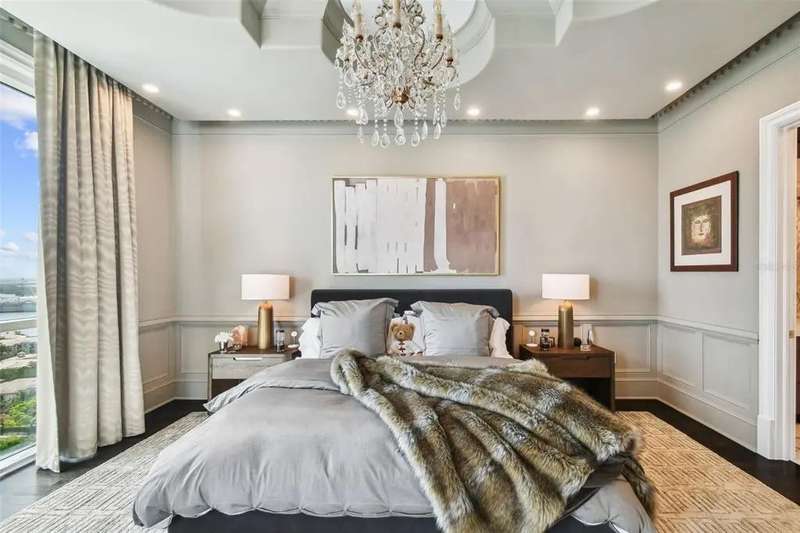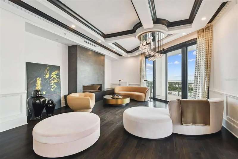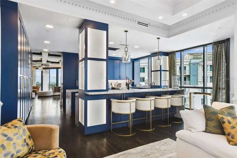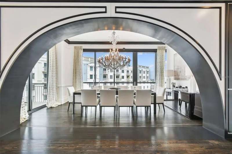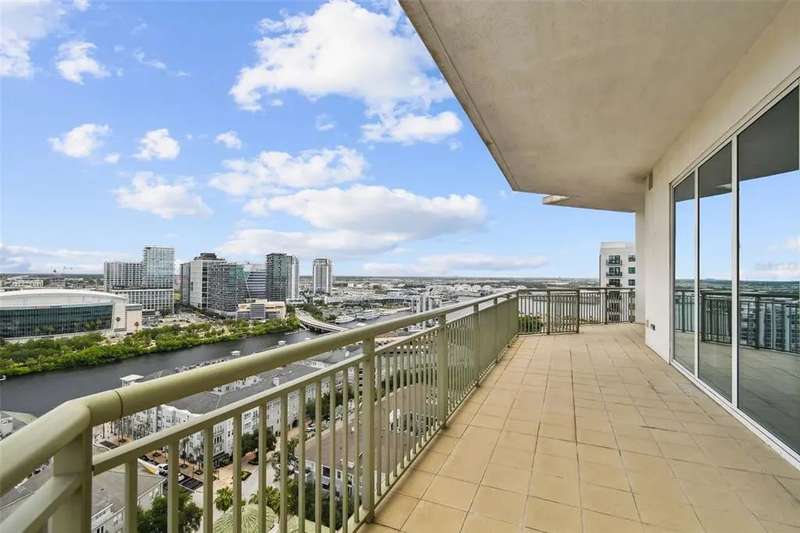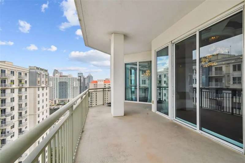 Poised atop the 20th floor of The Plaza, this extraordinary 3,980-square-foot penthouse is a masterclass in refined living. Thoughtfully reimagined in 2023, the residence blends impeccable craftsmanship with sweeping views—capturing the energy of downtown Tampa to the north and the serene beauty of Hillsborough Bay to the south. A private elevator opens to a dramatic marble foyer anchored by a crystal chandelier, leading into formal living and dining rooms adorned with custom millwork, archways, fireplace, and access to a private balcony with downtown water and skyline views. Rich wood and marble flooring, coffered ceilings, and detailed wainscoting underscore the residence’s elevated aesthetic. The chef’s kitchen is as functional as it is striking—featuring waterfall marble countertops, a Wolf 48" dual-fuel range, Sub-Zero appliances, dual dishwashers, farm and prep sinks, bar seating with under-counter storage, and ample space for both hosting and everyday living. A secondary living area offers a more intimate setting, complete with its own chandelier and access to a second balcony with bay views. The primary suite is a true retreat, framed by floor-to-ceiling windows and offering balcony access, a custom walk-in closet with island storage, and a spa-inspired bath with dual vanities, built-in dressing table, soaking tub, and a walk-in marble shower with four shower heads and body jets. Two additional bedrooms provide flexible accommodations—one with an en-suite bath, LED-lit vanity, walk-in closet, and tilt window; the other perfectly suited for use as a spacious office or guest room. A full laundry room with custom cabinetry adds everyday convenience. Additional features include a Brilliant Smart Home system, three deeded parking spaces (#229, #230, #107), and two climate-controlled storage units (#2 and #3). The Plaza’s renowned amenities include 24-hour concierge and valet, resort-style pool and spa with cabanas, fitness center, billiards room, guest suites, and meeting rooms. HOA includes internet, water, trash, security, insurance, recreational facilities, and more. This residence represents a rare opportunity to own a top-tier penthouse in one of Tampa’s most prestigious addresses.
