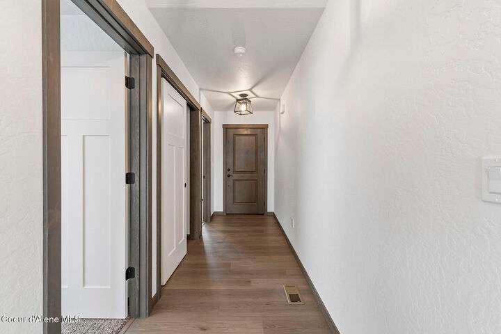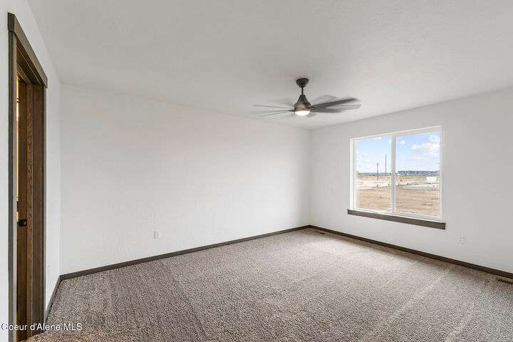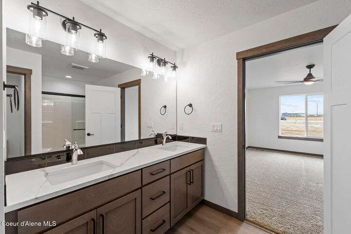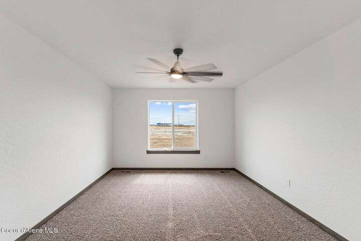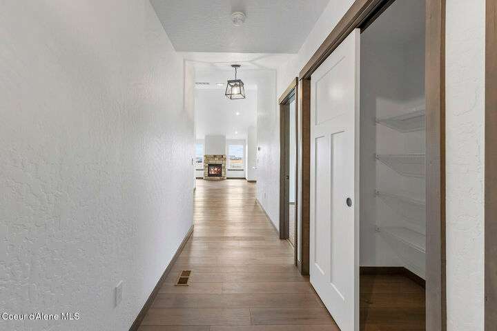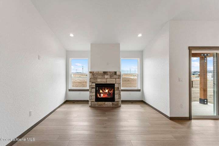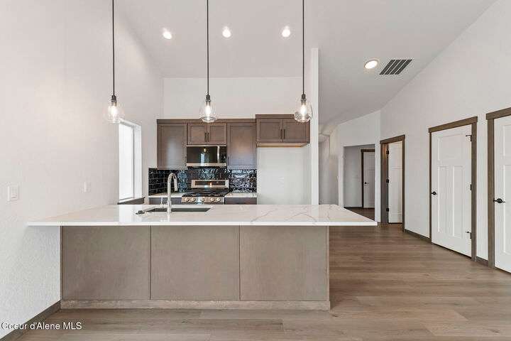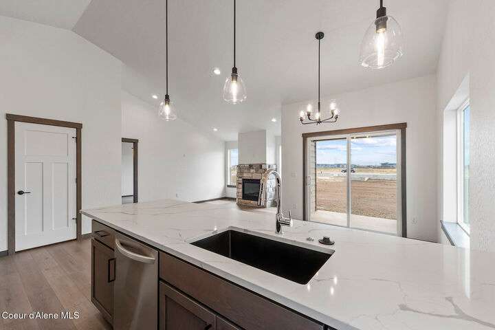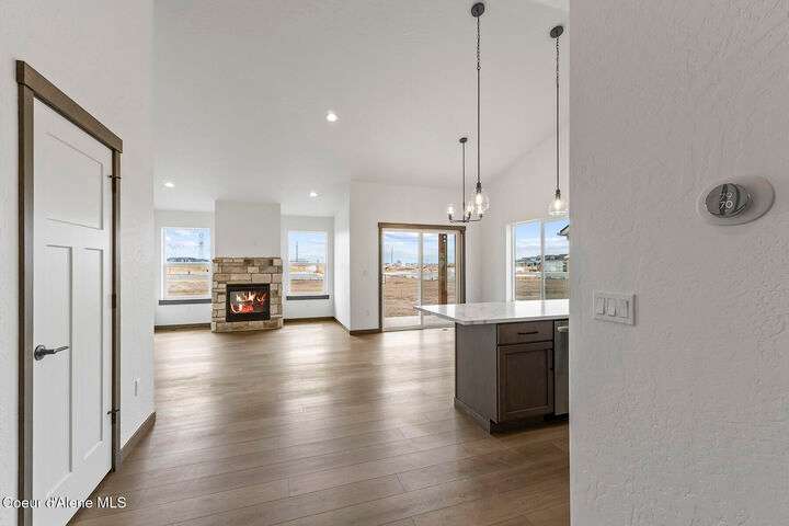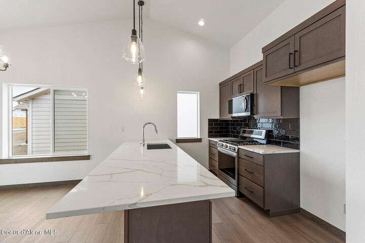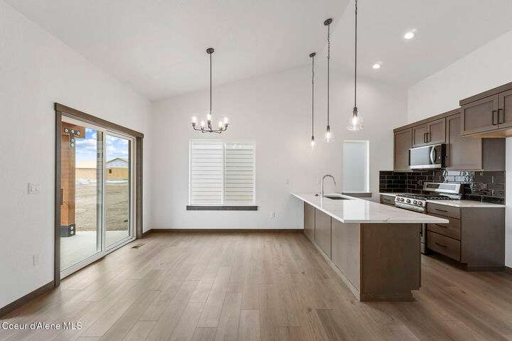 Home is complete. 3rd Bay garage is 12 wide and 32 feet deep exterior measurement with a garage door opener, gas fireplace, quartz countertops throughout, covered front and rear patio, vaulted ceilings, 95% gas furnace, Nest thermostat, tankless gas water heater, gas to rear patio, gas range, LVP flooring every where except bedrooms and closets, garage door opener, garage man door and front yard landscaping and sprinkler system. Return home to style and elegance every day when you make this beautiful abode your own. There's an impressive 1,437 sqft of living space with a bright and open-plan layout that invites you to rest and relax. The owner's suite enjoys a private position, complete with an ensuite bath and an abundance of closet space. The two guest bedrooms are serviced by the hall bath. When friends drop by, you can flow freely from the living room, into the dining room and the kitchen beyond. A breakfast nook set under a statement chandelier light.