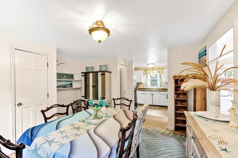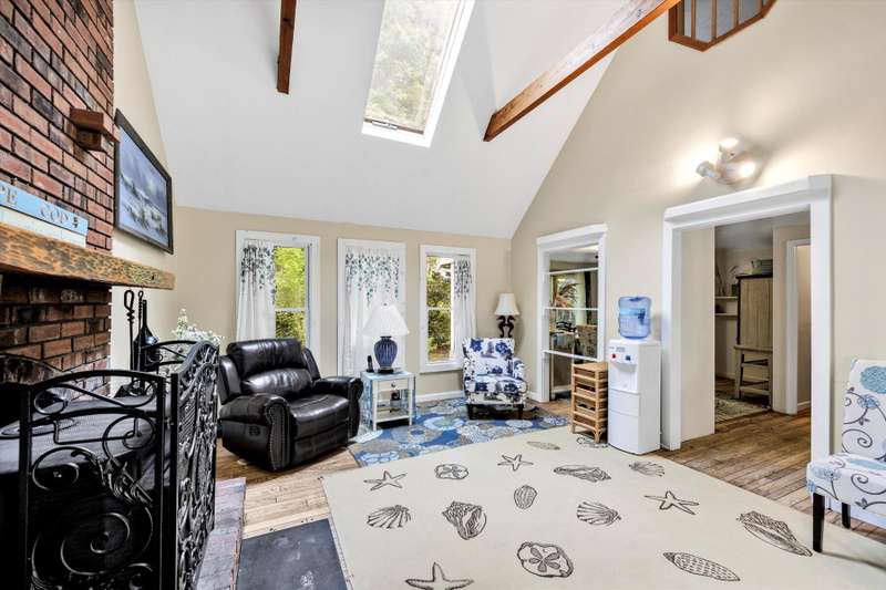Gardener's paradise in this beautifully maintained Cape-style home, nestled on a private lot in sought-after Hatchville neighborhood. Just a short stroll from Deep Pond, enjoy swimming, fishing, or relaxing on its sandy beach. This inviting home features a flexible floorplan with a first-floor primary bedroom and office, plus two spacious upstairs bedrooms bathed in natural light from skylights. The living room boasts soaring beamed ceilings and a Russo woodstove for cozy supplemental heat. Original oak floors flow through the living areas, complemented by recent updates including replacement windows and fresh paint. Newly updated exterior trim, siding, drain and gutters, along with a leaf gutter filter system add to the appeal. A partially finished walkout basement offers easy access to the secluded backyard. This solid home is a rare opportunity to own in a prime location with easy access to beaches, the bridge, and all the Cape has to offer.