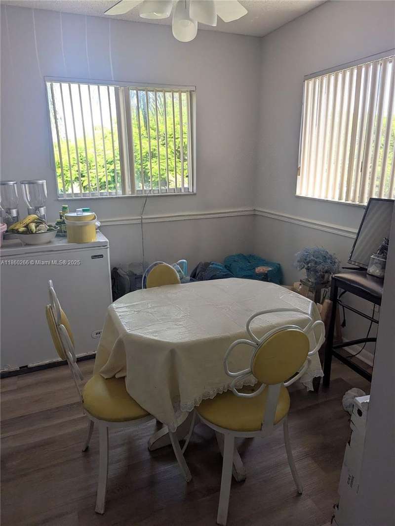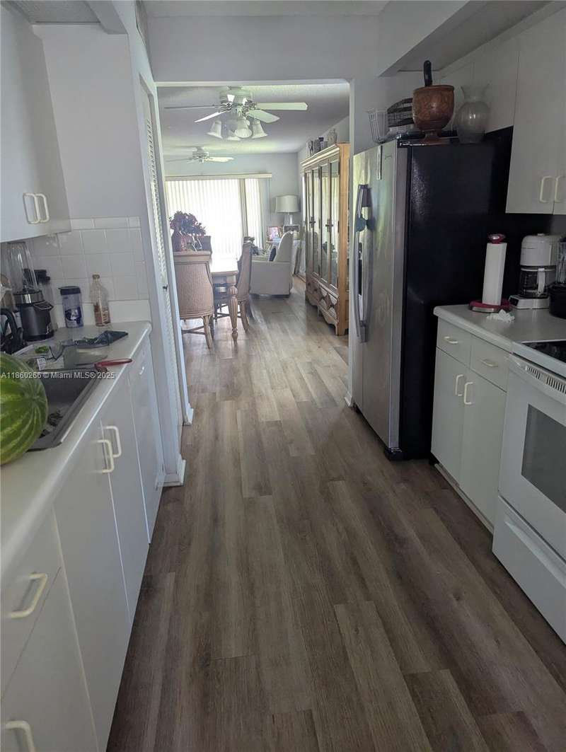REDUCED!! Lovely unit with laminate flooring, eat in kitchen area, washer and dryer in unit. Unit is the largest model, 1461 sq feet. Corner unit, according hurricane windows, lots of light and nice garden view. One assigned parking spot and guest parking. Guest bathroom has been remodeled. Unit is currently rented with lease completed November 30th, 2025. Tenant is ok to show, but call agent to assist. Unit can be rented again with no restrictions. Tenant would like to continue leasing. She has been a good and timely paid tenant for 3 years. Current lease is $2,100 a month. Great for investors. Century Village is a 55+ community and at least one person on the deed must be 55 years or older.