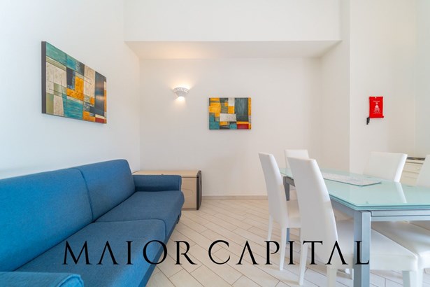 Inside, the flat opens onto an extremely bright living room, furnished with a modern open kitchen in neutral tones, which creates a cosy and functional ambience. Large windows provide splendid natural light throughout the day.