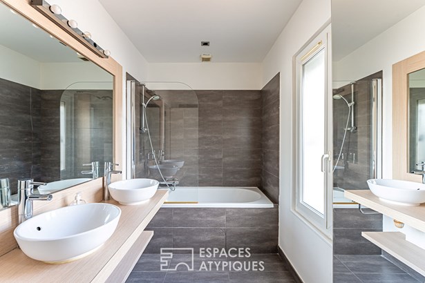 The first level houses a living room of over 42 m2, bathed in light, whose air conditioning guarantees optimal comfort in summer, and the stove a warm atmosphere in winter. It consists of a living room opening onto a balcony and a contemporary kitchen opening onto a terrace, ideal for extending outdoor meals.