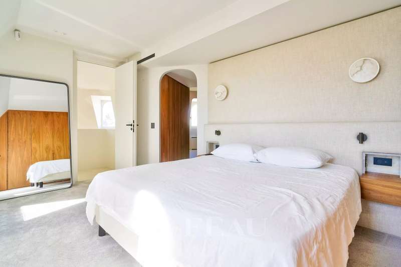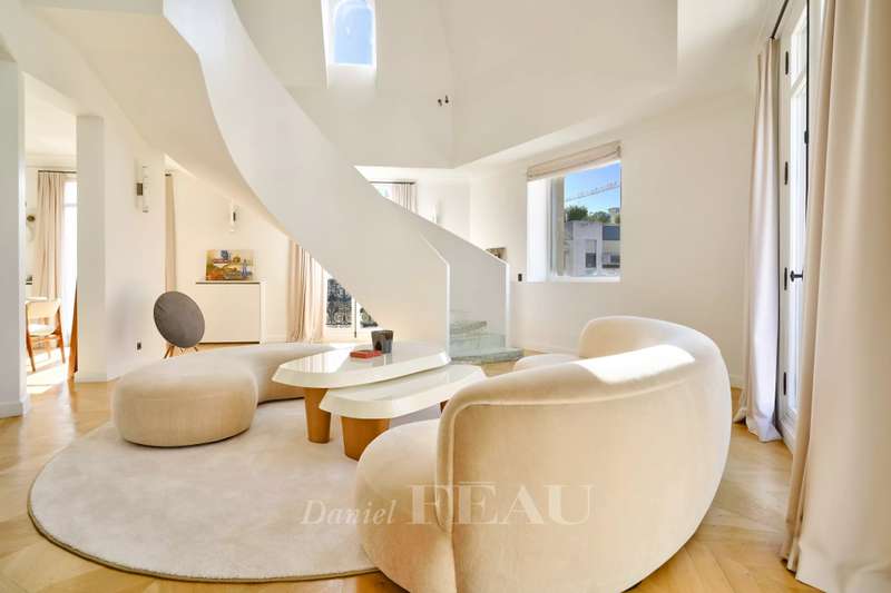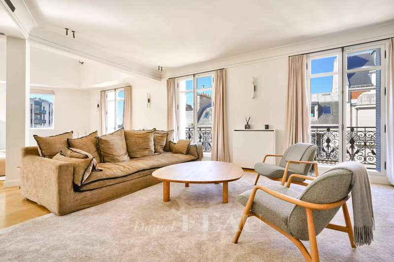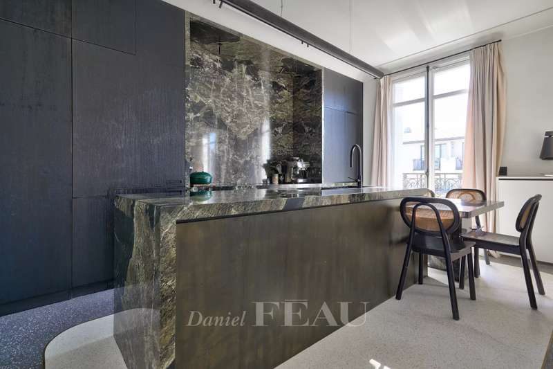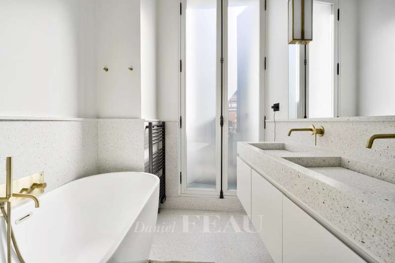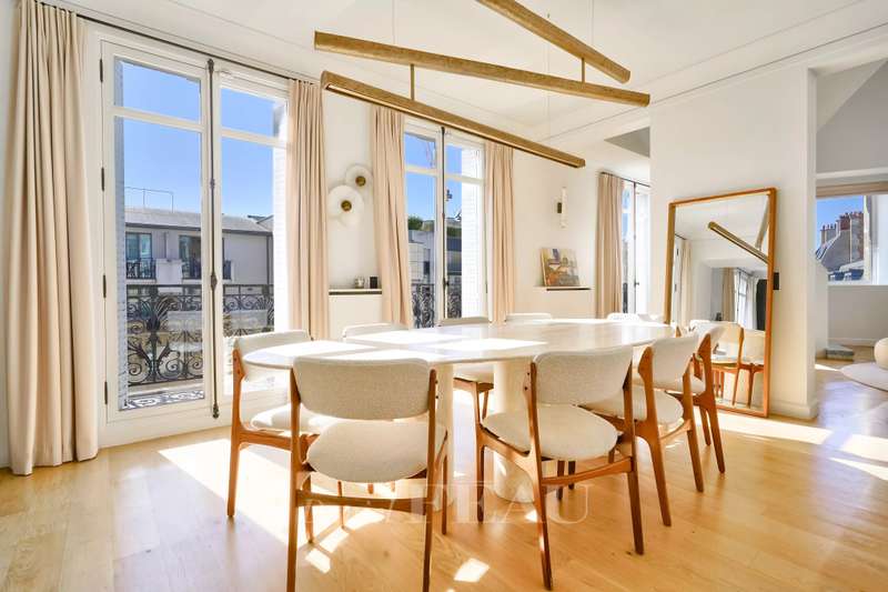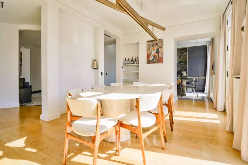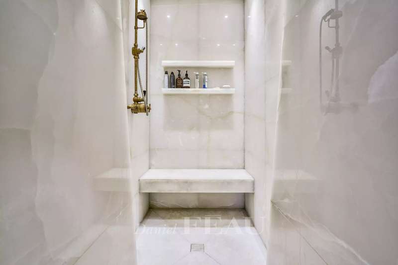 Sole Agent. Rue de Courcelles/Parc Monceau. This magnificent over 260 sqm apartment with a south-west facing balcony is on the 5th and top floor of an elegant late 19th century freestone building. Air-conditioned, it includes a superb corner living/reception room featuring an over 6-metre high ceiling, a dining room (90 sqm in total), an equipped kitchen, three bedrooms, a study, a bathroom, a shower room and a separate wc. A master suite with a bath/shower room, a wc and a dressing room is upstairs. The study could create a 5th bedroom if required. With a cellar and a maid’s bedroom with a kitchenette and a shower room/wc. Featuring Iranian marble and white onyx, the apartment has been renovated throughout by a renowned interior decorator. In a prime location in the immediate vicinity of leafy Parc Monceau, the shops and the schools.