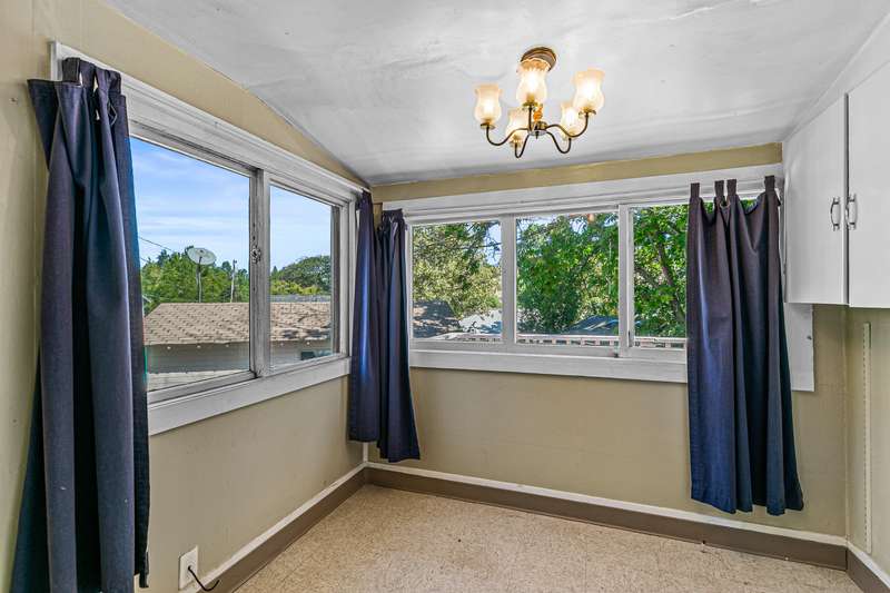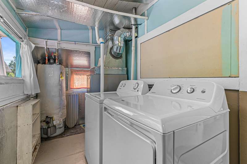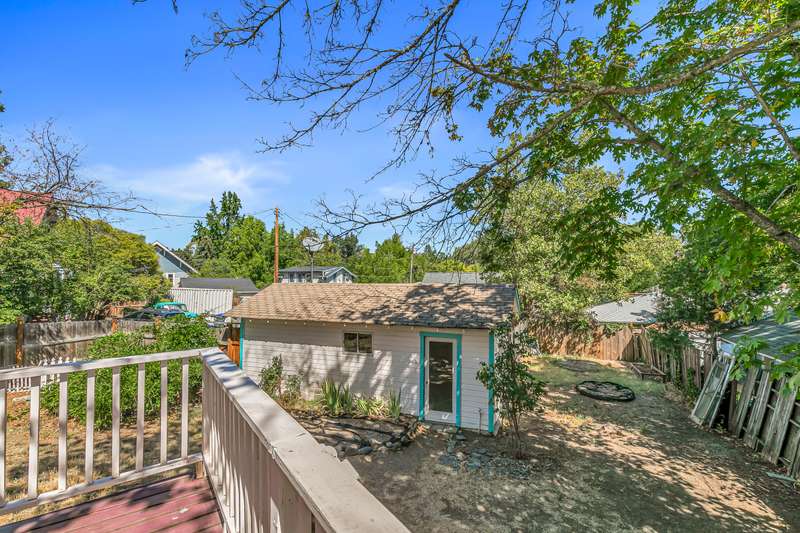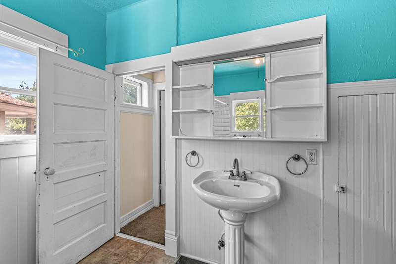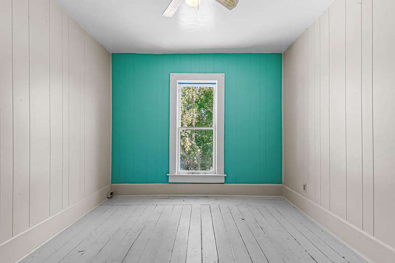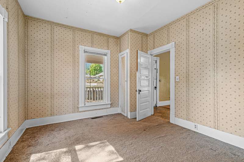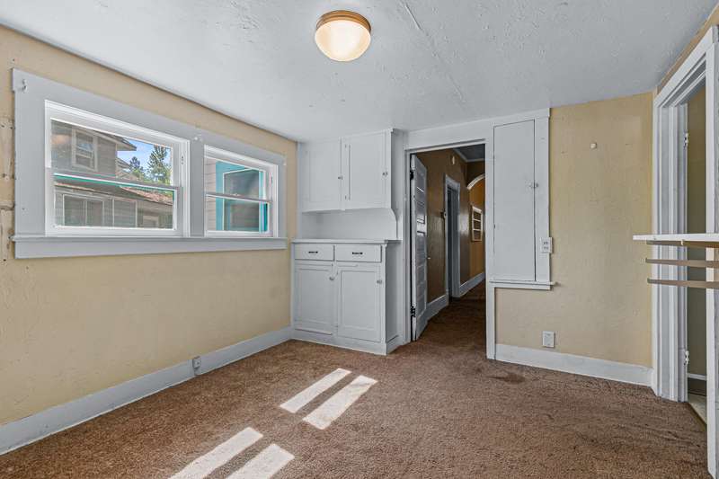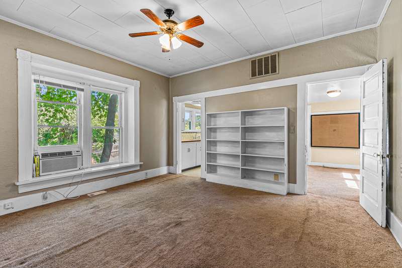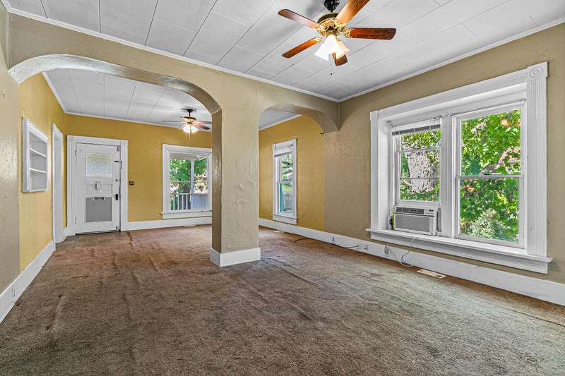 Historic home on a spacious lot with ~121 feet of alley access — centrally located across from Triangle Park! Living and formal dining with high ceilings, curved archways, built-ins, and ceiling fans. Kitchen with tiled counter and backsplash, stainless double sink, refrigerator, and gas range; adjacent informal dining or breakfast nook with built-ins. Main-level bedroom with abundant natural light and second bedroom or office with built-in cabinets and shelving. Full bathroom with pedestal sink and tiled tub shower. Enclosed back porch mudroom with washer and dryer. Two upper-level bedrooms with closets and ceiling fans. Exterior stairs to lower-level basement with poured concrete foundation. Fully fenced yard with mature trees, sunny gardening areas, gated alley access, and large parking area with space for multiple vehicles. Detached 288 SqFt garage with power, storage shelving, and poured concrete slab. Property shall be sold ''As-Is'' in present condition. Inquire for details!