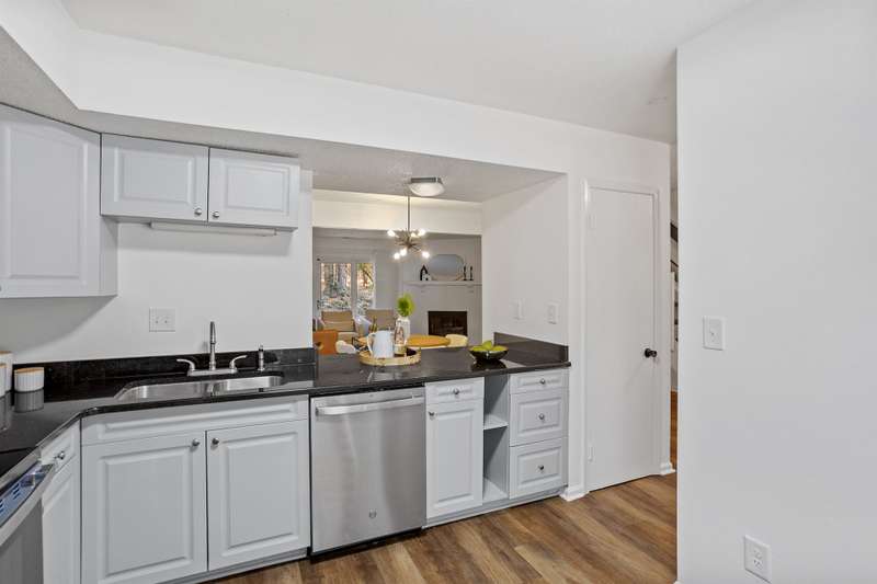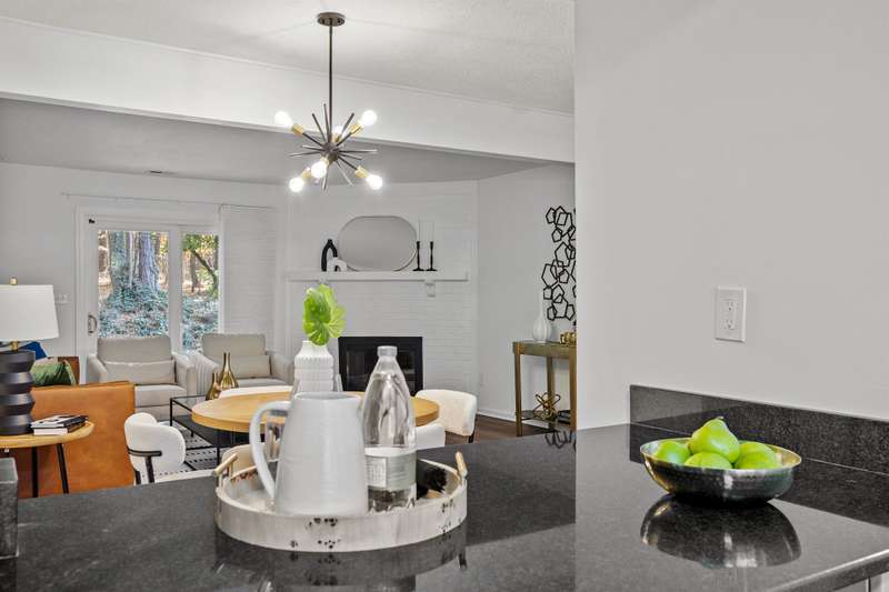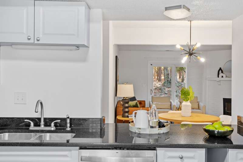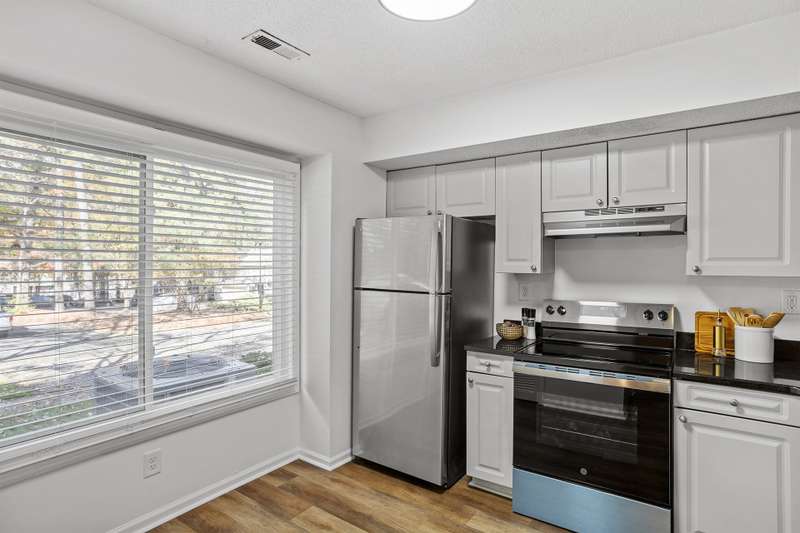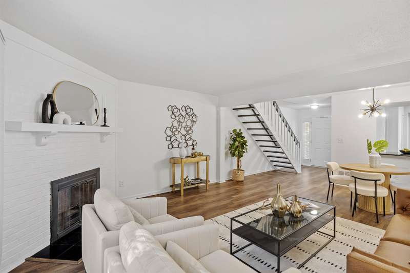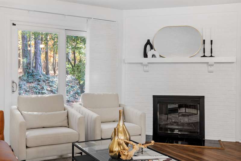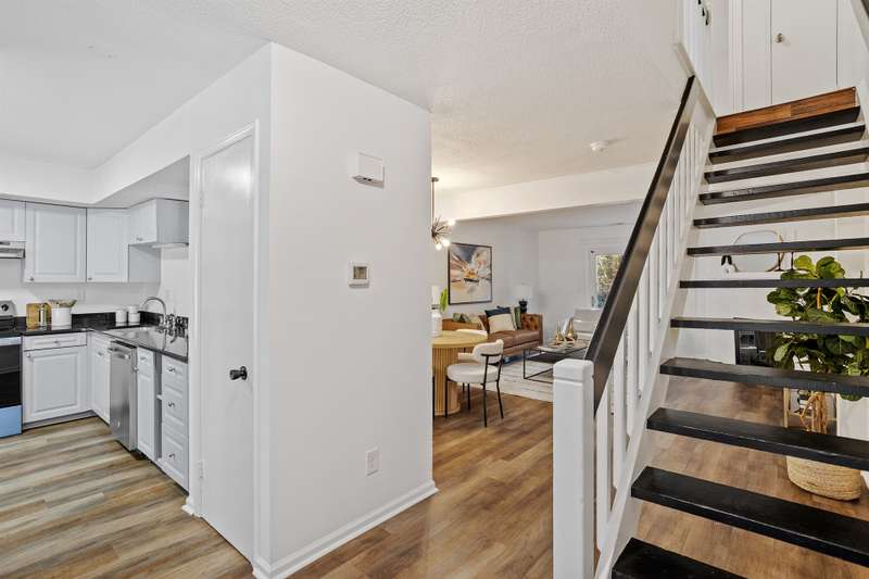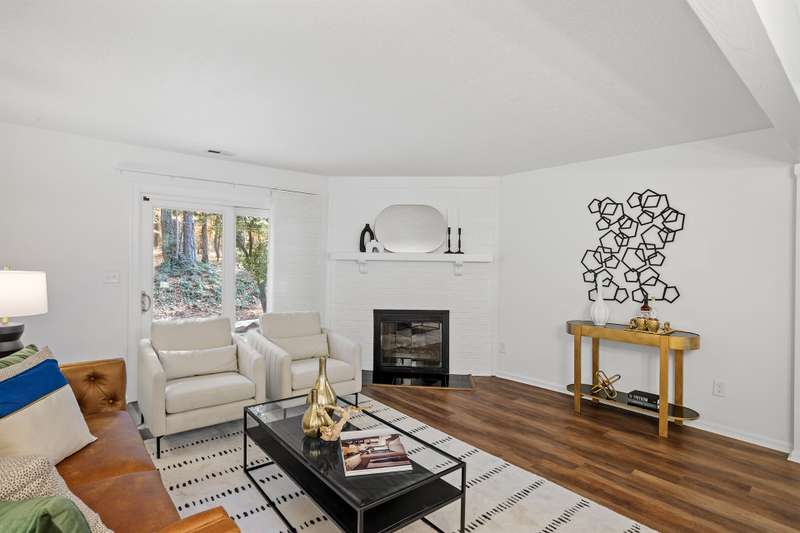 This MOVE-IN READY townhome with 2 bedrooms and 2.5 baths blends modern updates with midcentury character. A striking floating staircase brings your midcentury modern dreams to life, complemented by fresh paint (2025), new carpet in the bedrooms (2025), and brand new stainless steel kitchen appliances including refrigerator, dishwasher, range, and vent hood. Downstairs, enjoy beautiful LVP flooring, gorgeous granite countertops, and a decorative fireplace. Refrigerator, washer, and dryer convey for your convenience. The HOA covers the roof (updated 2016), exterior maintenance, and water service, plus access to community pool amenities. Dixon Drive Park is just a few steps away. Investor-friendly HOA allows rentals, making this an excellent opportunity for primary residence and investors alike. With well-maintained grounds, updated exterior paint, and a prime Raleigh location only 10 minutes from North Hills and Crabtree Valley Mall, this townhome offers convenient, stylish living in Northclift Villages.