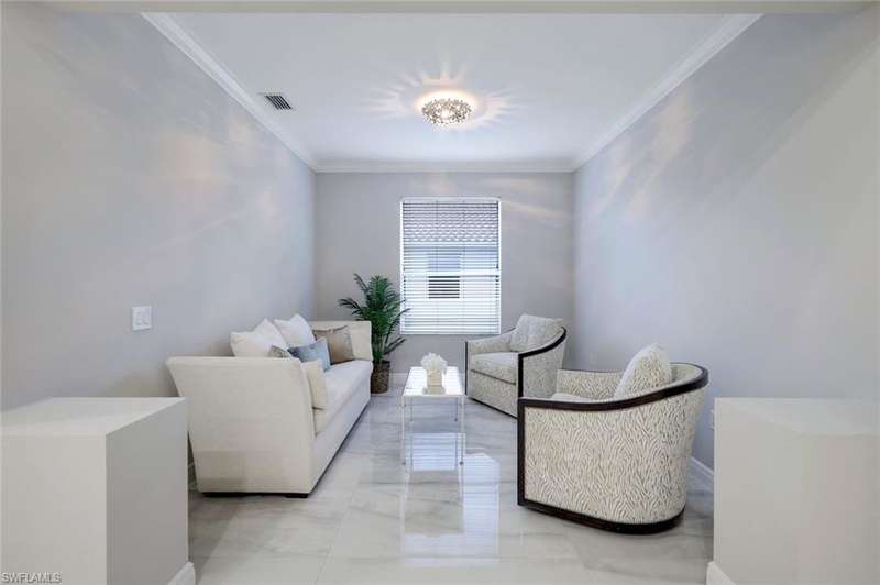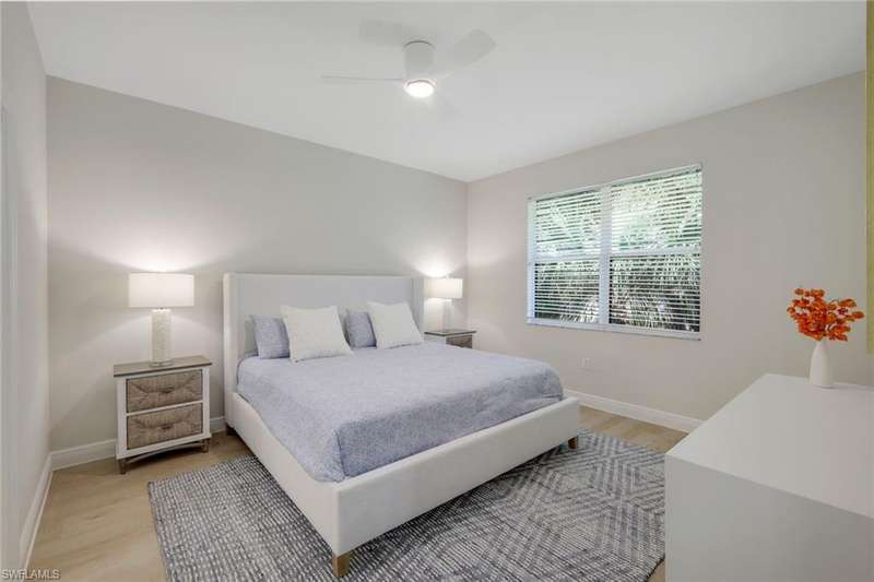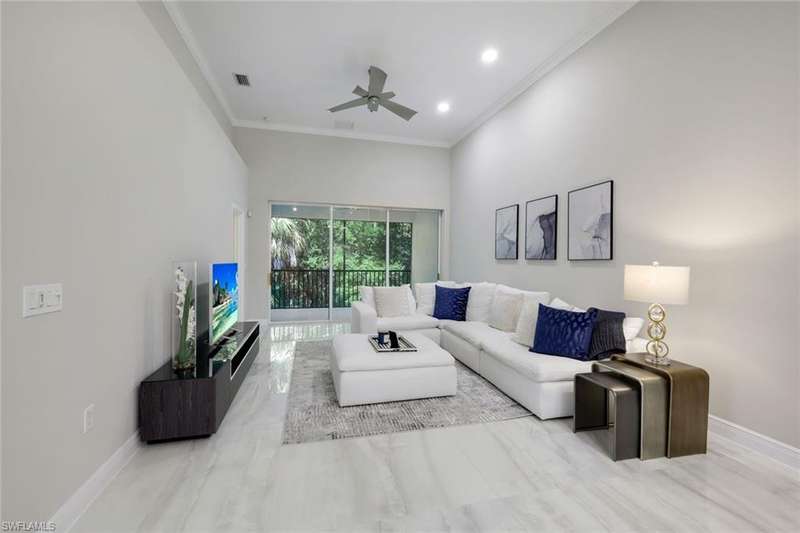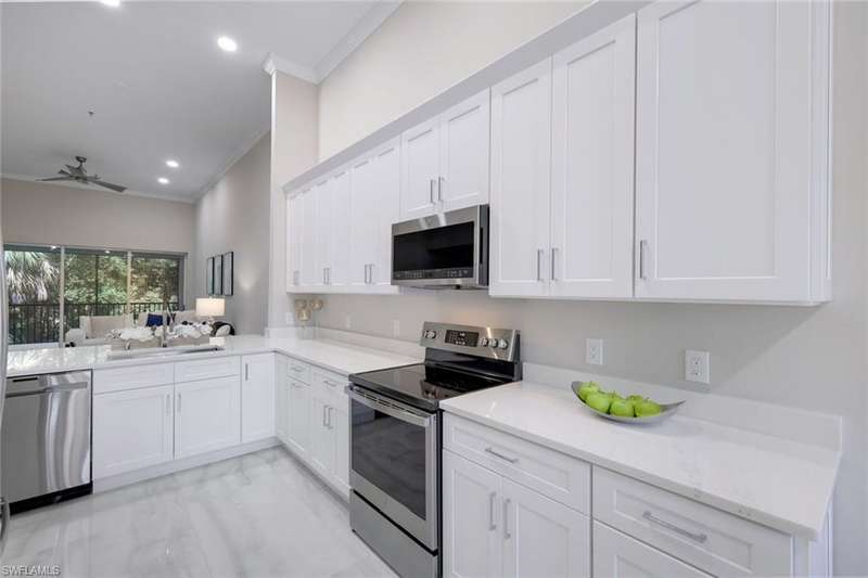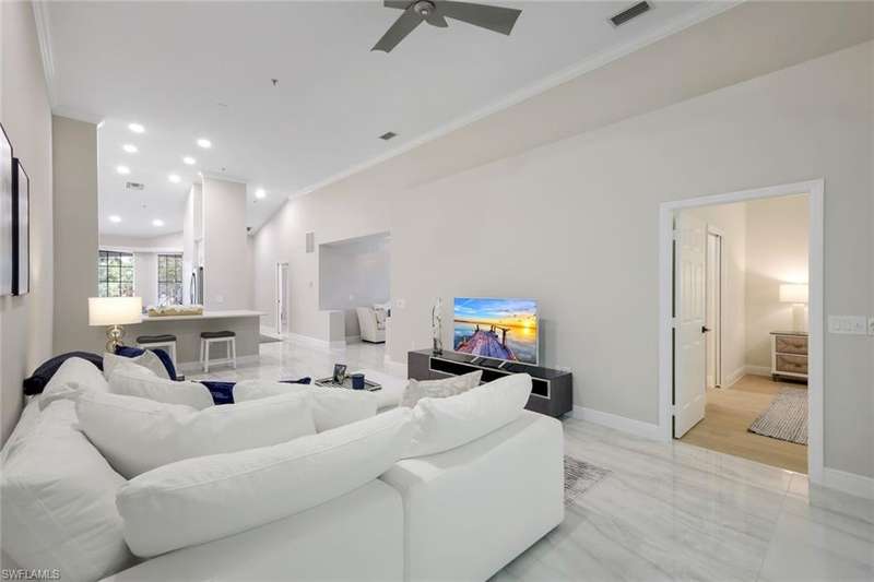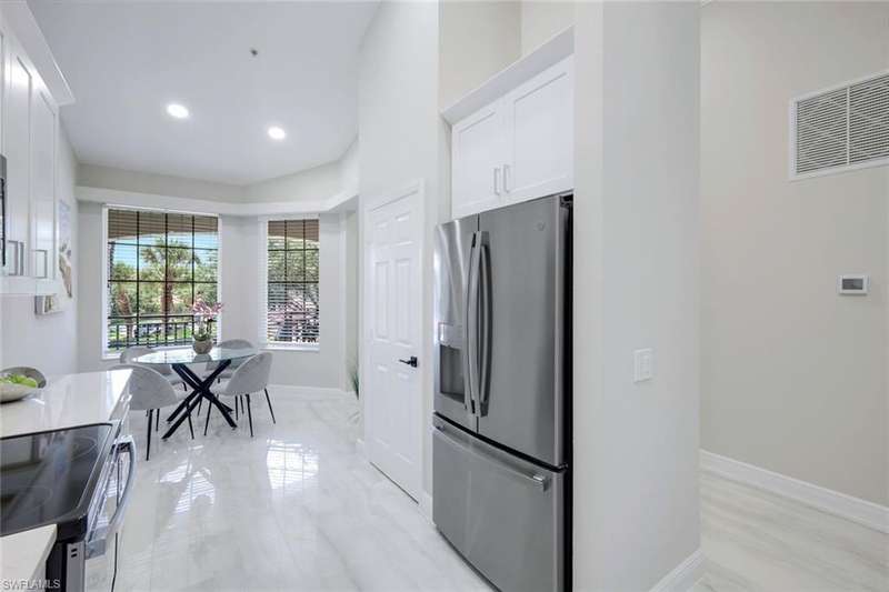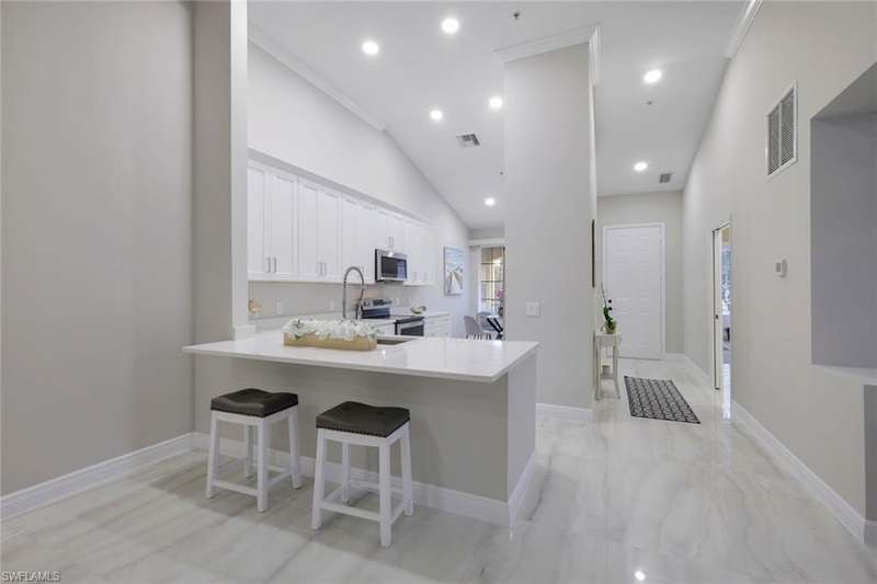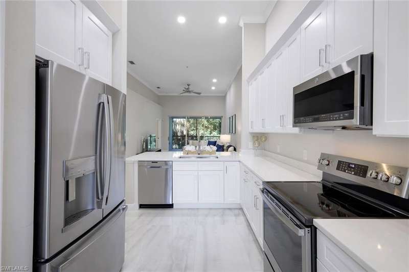 Indulge in the ultimate golf lifestyle with this completely renovated and furnished 2-bedroom, 2-bathroom plus den, END UNIT (extra windows) condominium, complete with BUNDLED GOLF! Step into luxury with fresh porcelain flooring in main living area, and ceramic plank flooring in bedrooms, serene white cabinetry, quartz countertops, and state-of-the-art GE Profile stainless steel appliances in the kitchen. Both the primary and guest bathrooms have undergone complete transformations, boasting new quartz countertops, cabinets, gorgeous shower, and exquisite ceramic tile finishes. Air conditioner new in 2024 ensures year-round comfort. The split bedroom layout provides privacy, while the open floor plan creates a seamless flow throughout. Take advantage of the fantastic community pool and embrace the wealth of amenities including access to the golf course, golf practice facility, tennis courts, bocce, fitness center, clubhouse lifestyle area with pool and poolside service, as well as the