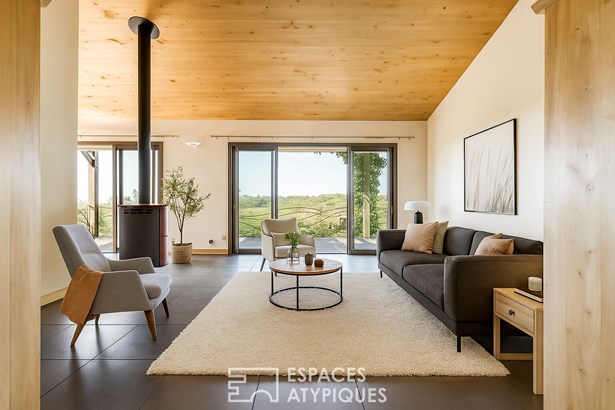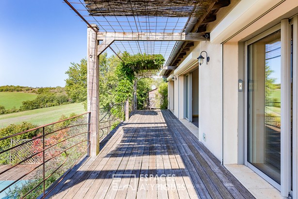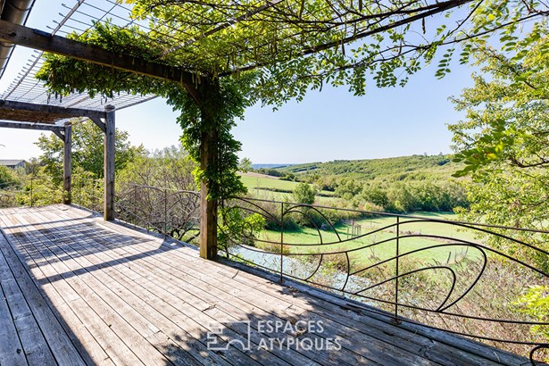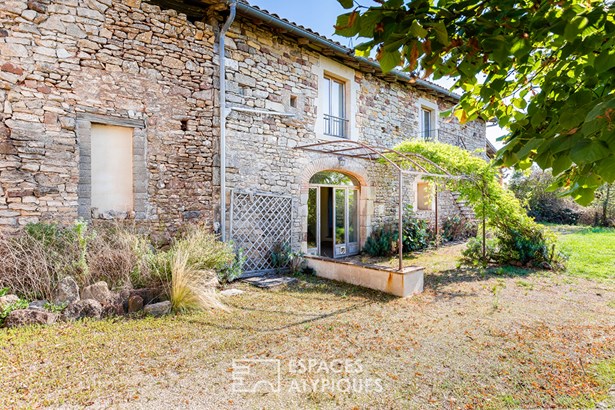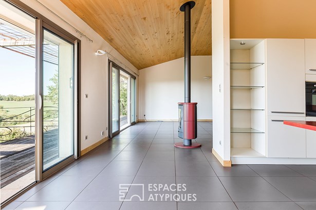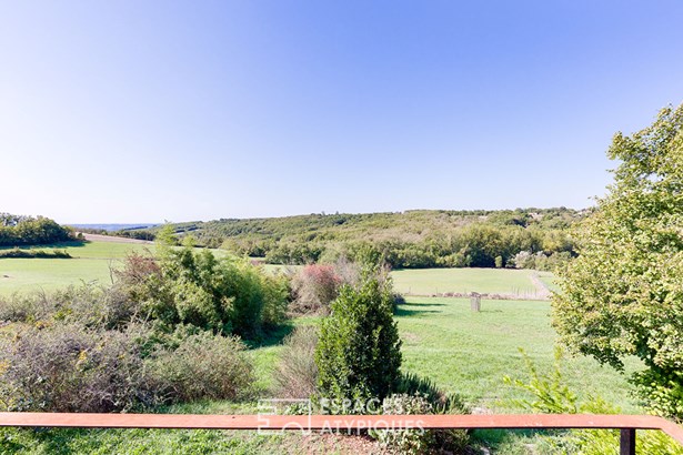 The main house, with a surface area of 1,537 sq ft, was renovated in the 1990s and offers a bright, south-facing single level. Its large living room with library and wood-burning stove, as well as the fitted and equipped kitchen, open onto a panoramic terrace through large bay windows, inviting you to contemplate the wooded valleys and, on a clear day, the Pyrenees mountain range.
