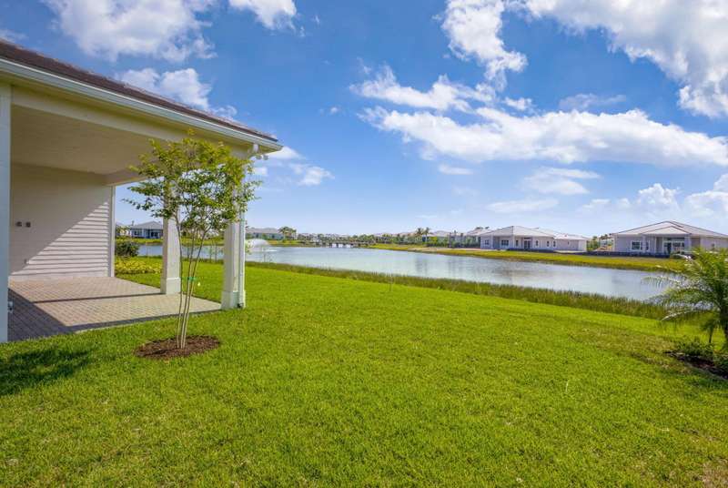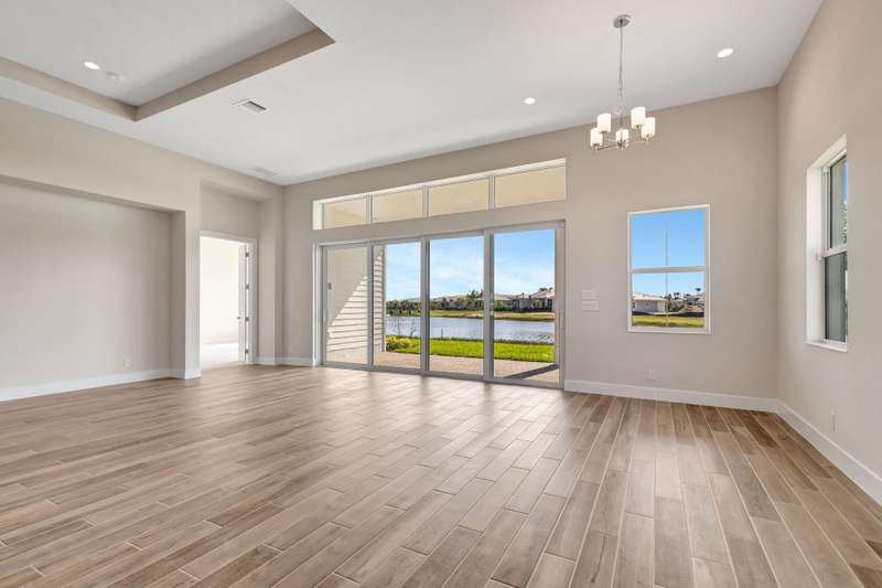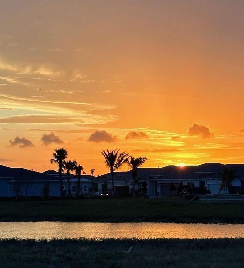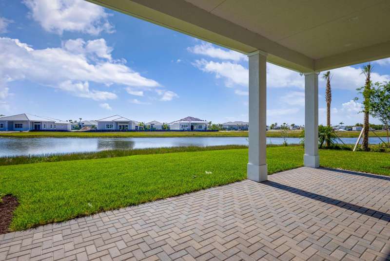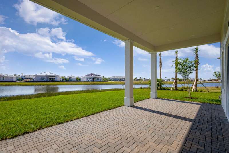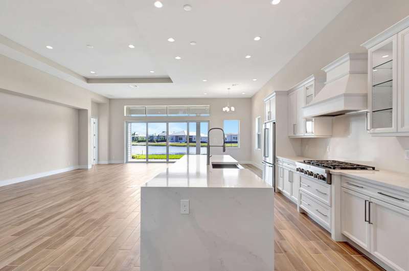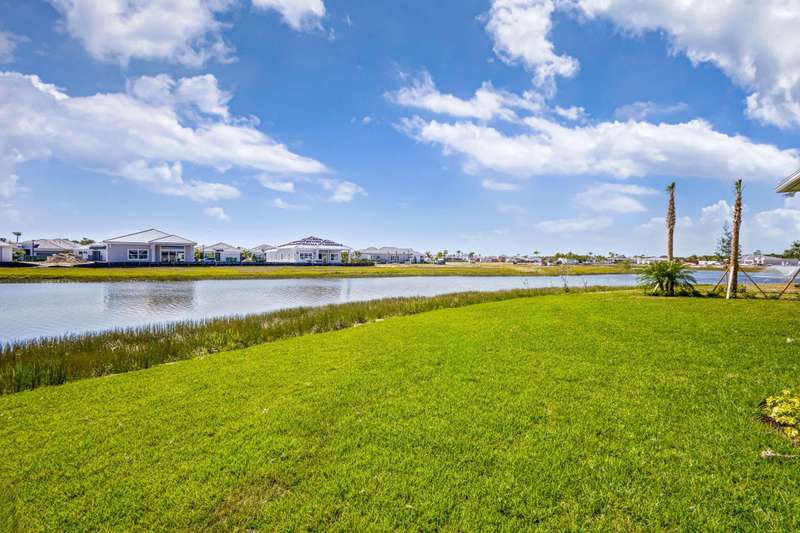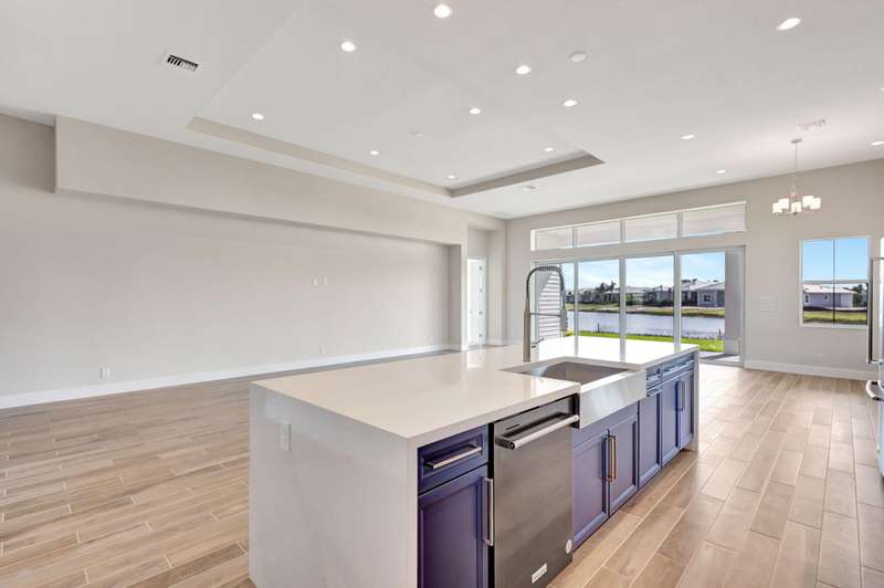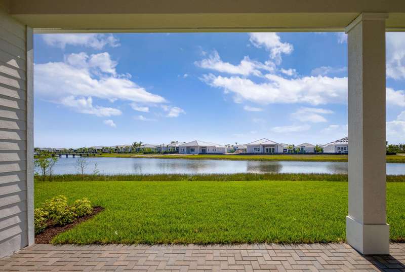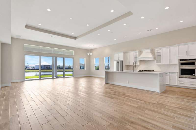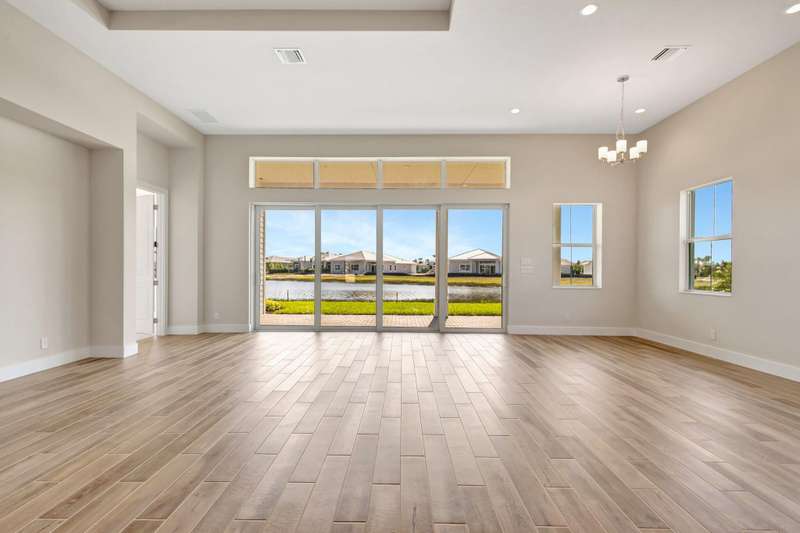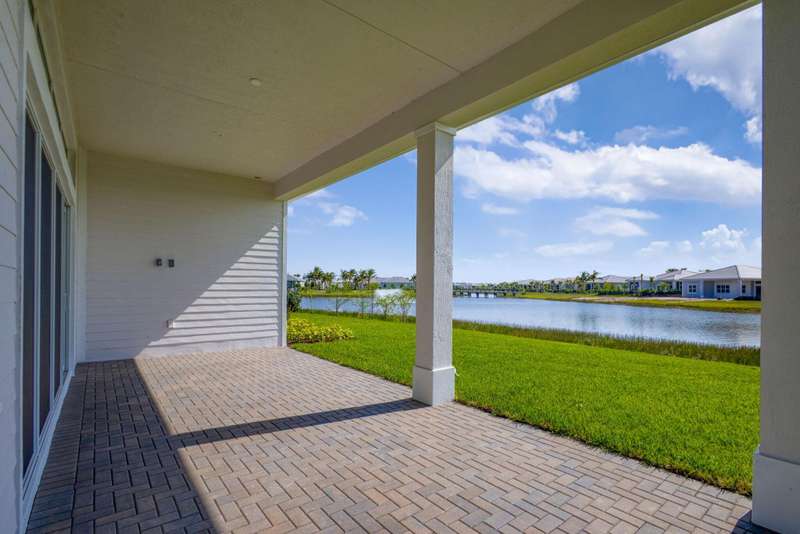 Coastal Elegance with Expansive Water Views and Stunning Sunsets. Nestled on an oversized lot, this beautifully designed coastal-style home offers breathtaking water views and unforgettable sunsets. A charming covered porch and welcoming entryway open into a grand foyer, setting the tone for the spacious and light-filled interior. The open-concept great room impresses with a coffered ceiling and seamlessly flows into the bright dining area and expansive covered lanai--ideal for indoor-outdoor living. Thoughtfully upgraded throughout, the gourmet kitchen boasts a large center island with breakfast bar, abundant cabinetry and counter space, and a generous walk-in pantry--perfect for everyday living and entertaining. The luxurious primary suite features a tray ceiling, dual walk-in closets, a