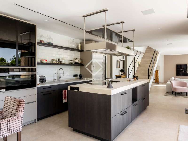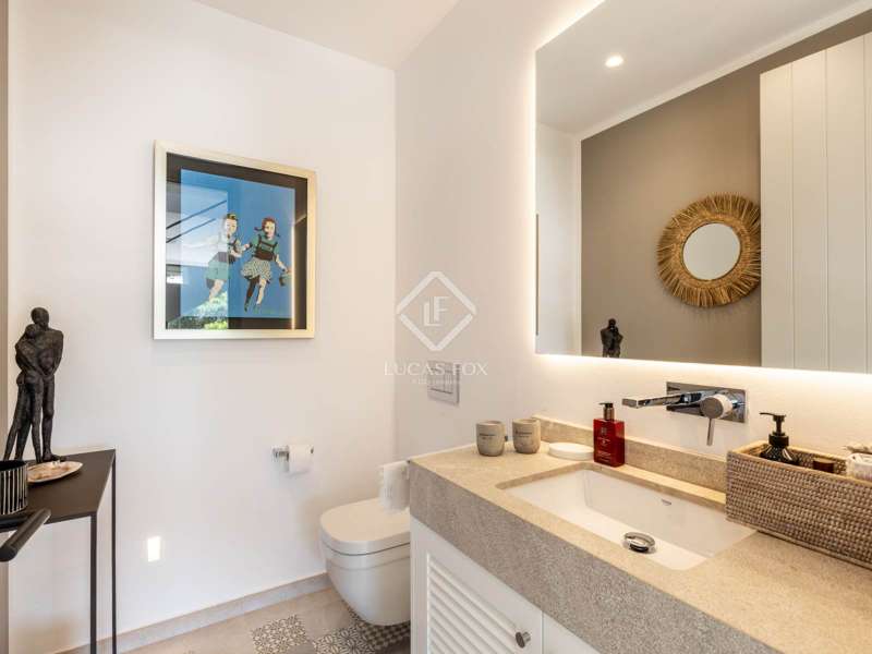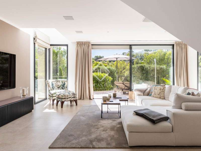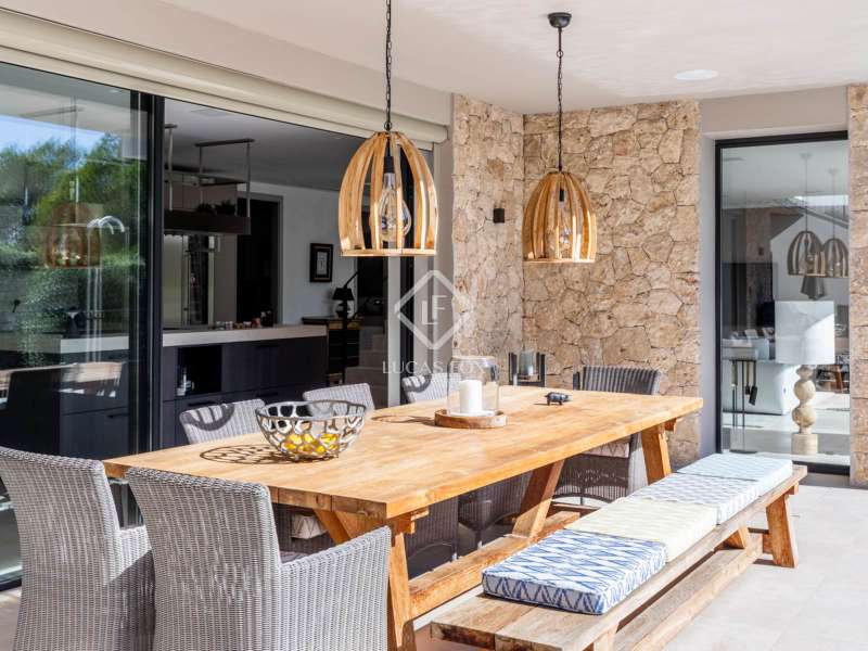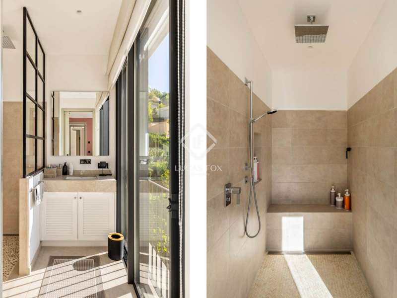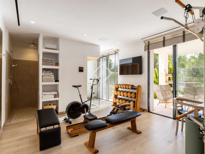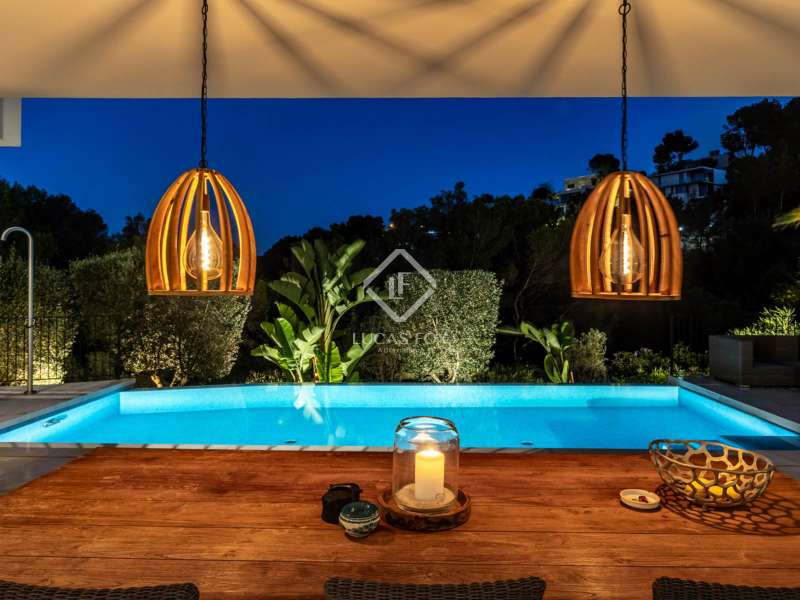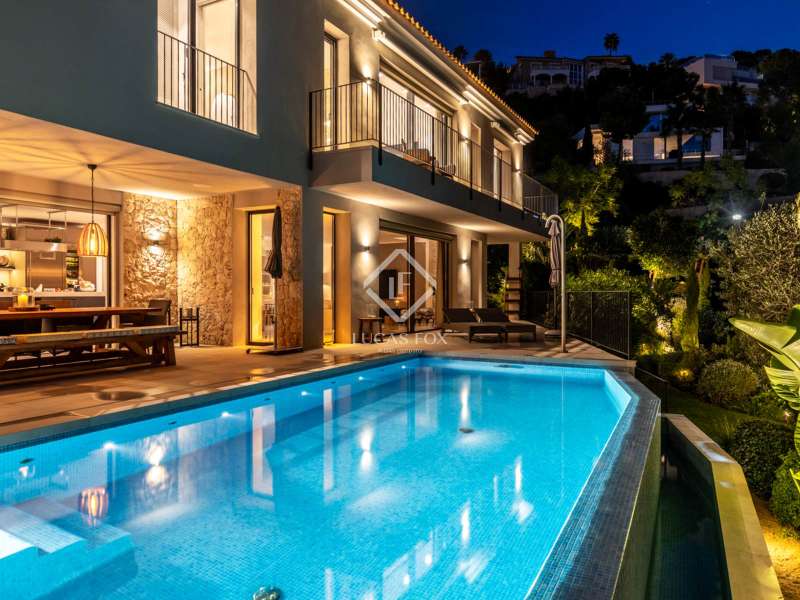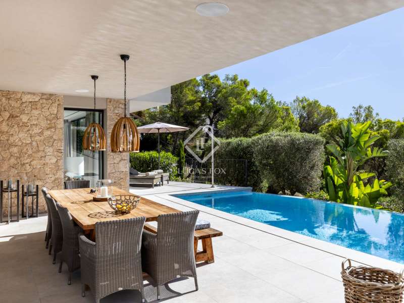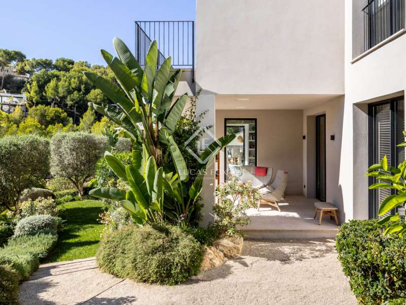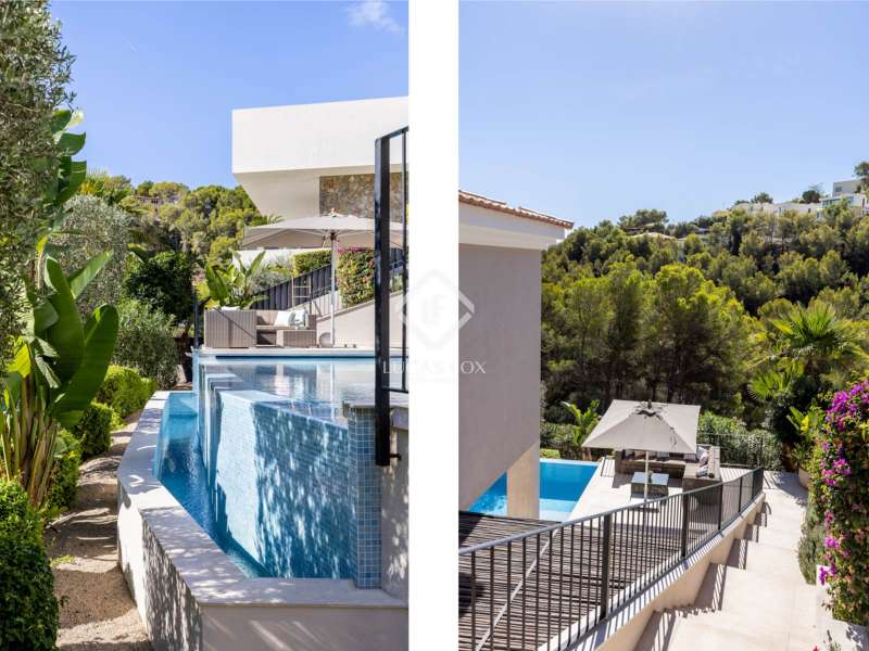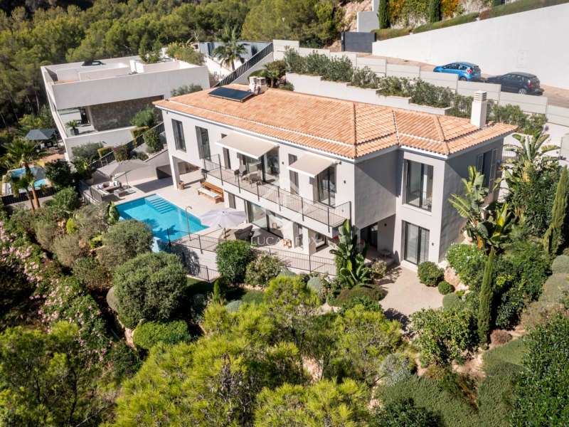 Elegance, comfort and exclusivity in Costa d'en Blanes Fall in love with this sumptuous, recently completed villa, ideally located in one of the most sought-after areas of southwest Mallorca: Costa d'en Blanes. Offering a perfect balance of luxury, modernity, and nature, this partially furnished property is ready to welcome you with no work required. Located on a perfectly maintained plot of 1,000 m², the villa offers 401 m² of living space bathed in light, in a green and peaceful setting. Refined living spaces The house features three spacious bedrooms, all en suite, including two upstairs, opening onto a large, sunny terrace with breathtaking panoramic views. The master suite invites you to relax with its large walk-in shower, elegant bathtub, and custom-made dressing room. On the ground floor, a wellness area has been carefully designed: gym, sauna, shower... A true haven of peace. The large, bright living room with fireplace, the high-end open kitchen designed by Birgit Müller (with central island, wine cellar and Miele & Gaggenau appliances), and the convivial dining room open onto a summer kitchen with barbecue, ideal for entertaining. A Mediterranean garden with a dream swimming pool Outside, everything is designed to enjoy the island's exceptional climate: large covered and uncovered terraces, tropical garden, fruit trees, and a heated salt-water swimming pool with counter-current swimming, facing south for optimal brightness all year round. High-end services Among the many amenities: underfloor heating with heat pump, Daikin air conditioning, double-glazed aluminum windows, double garage, Dolby Surround sound system, connected Sony TV, automatic watering, gray water treatment, high-speed internet, alarm, thermal solar panel... Residents also benefit from a private tennis court just 100 meters away. A privileged location Just minutes from Palma, Puerto Portals, international schools, golf courses, beaches, and the island's most renowned restaurants, this villa is a true gem for those seeking the sweet Mediterranean lifestyle in an exclusive setting.