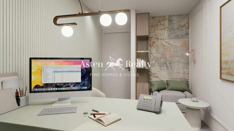 To maintain a modern and functional aesthetic, all the doors in the apartment are lacquered in light gray. The kitchen is delivered furnished and equipped with a compact quartz countertop and high-end appliances. The bathrooms are outfitted with designer porcelain fixtures, including shower trays, glass enclosures, chrome faucets, and bathroom furniture. All rooms are pre-installed for air conditioning, a video intercom, and an electric water heater with a heat pump.