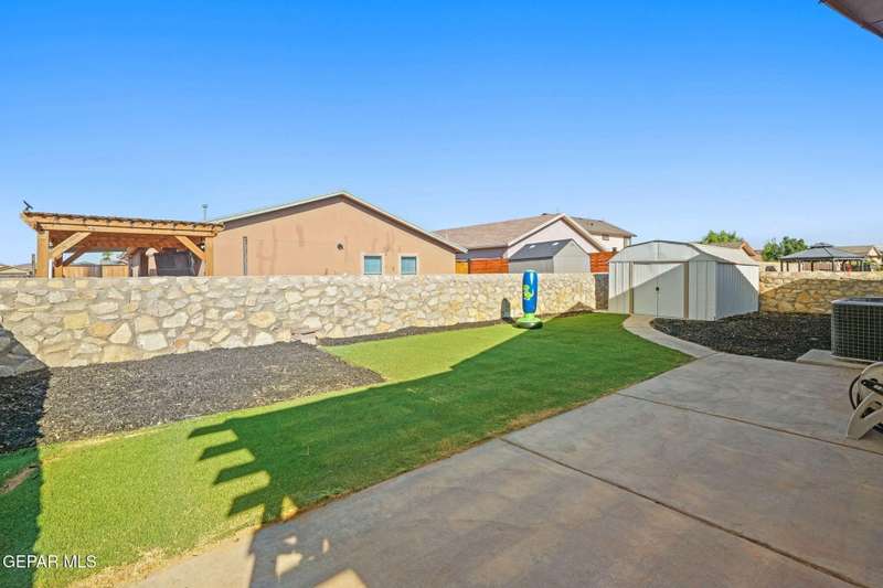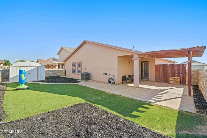Discover comfort and convenience in this beautifully maintained 4-bedroom, 2-bathroom home offering 1,845 sq ft of single-level living. Located on a spacious corner lot, this property features two inviting living areas and elegant shutters throughout. Enjoy year-round comfort with refrigerated air and a thoughtful layout that suits any lifestyle. Complete with low-maintenance turf, a stylish pergola perfect for outdoor gatherings, and a storage shed for added convenience.