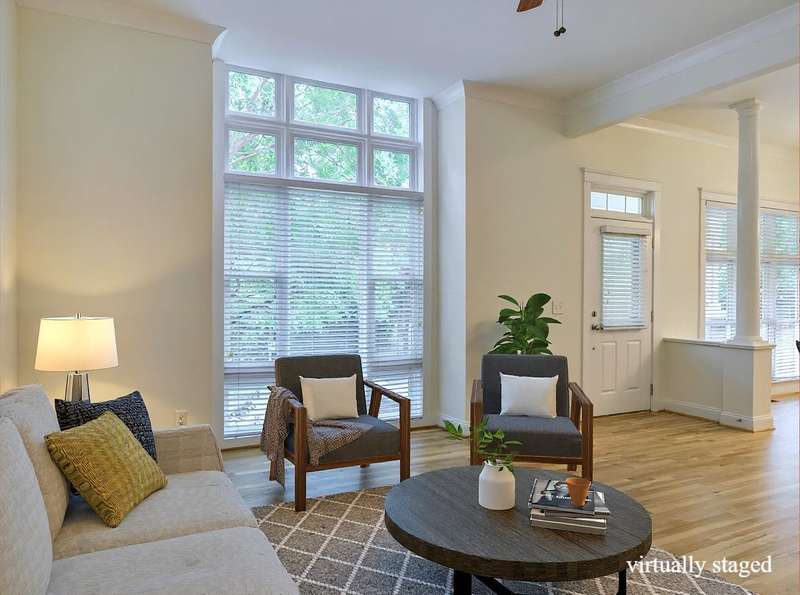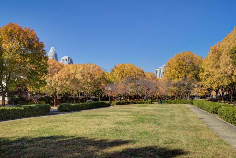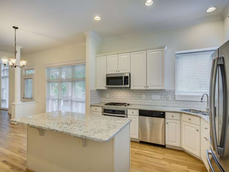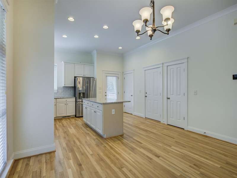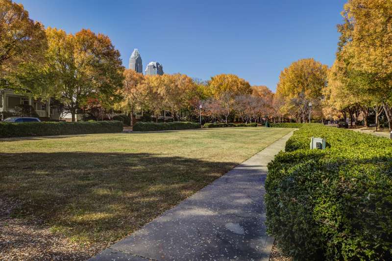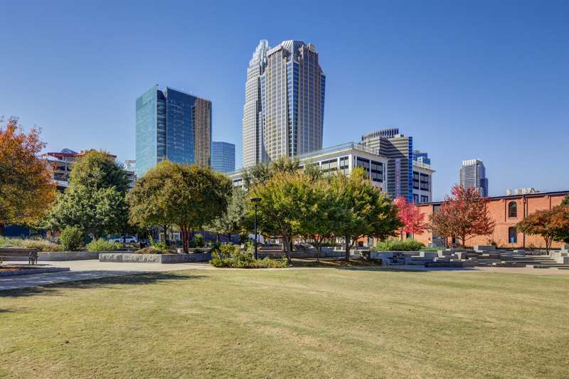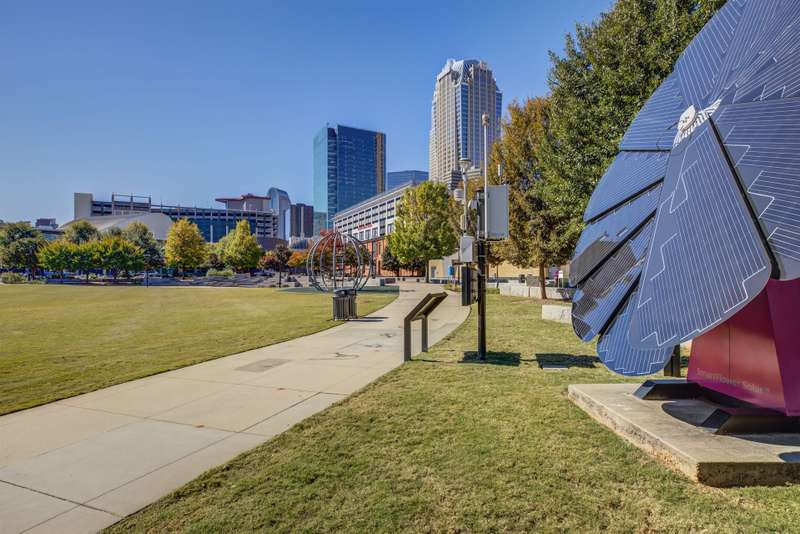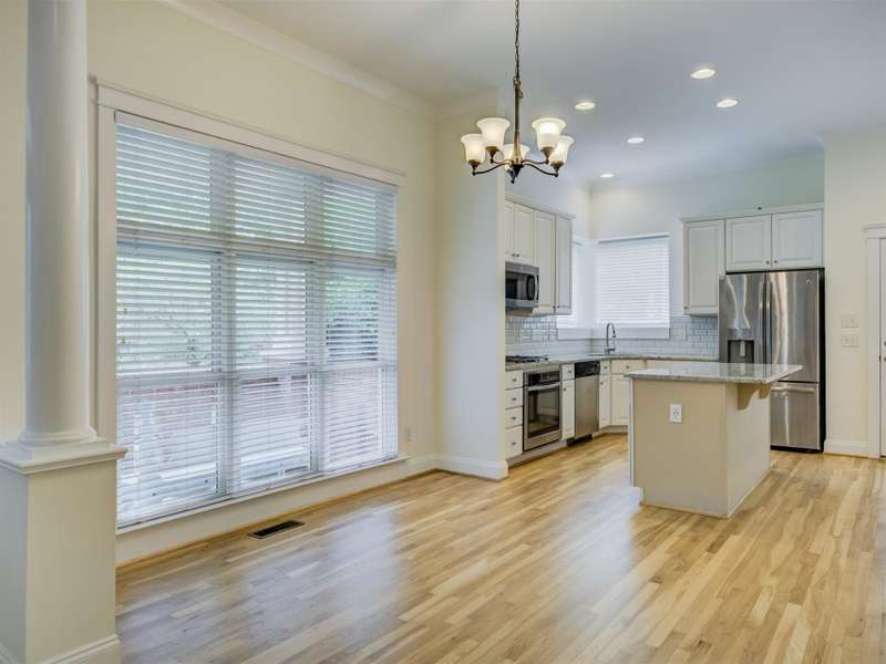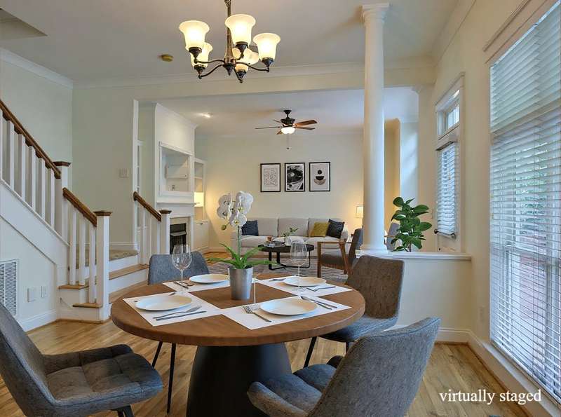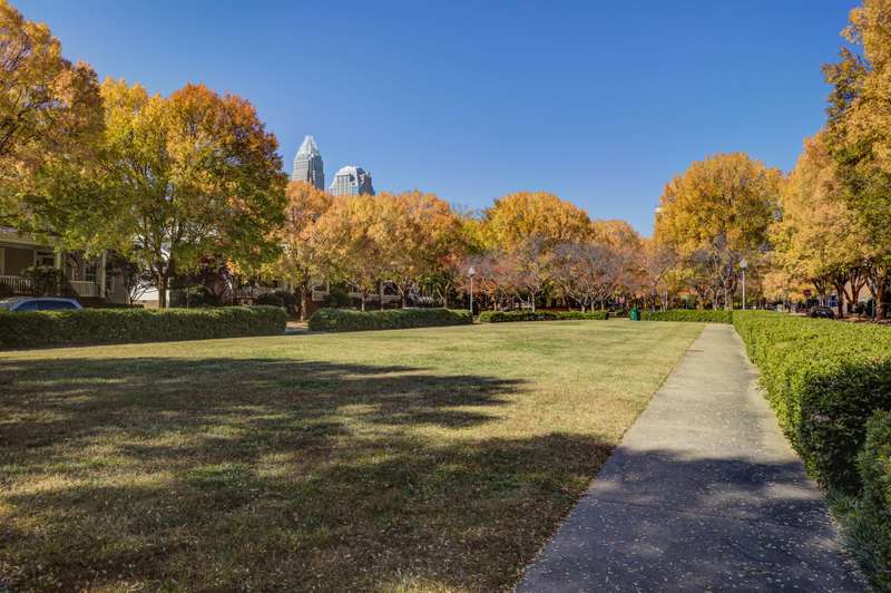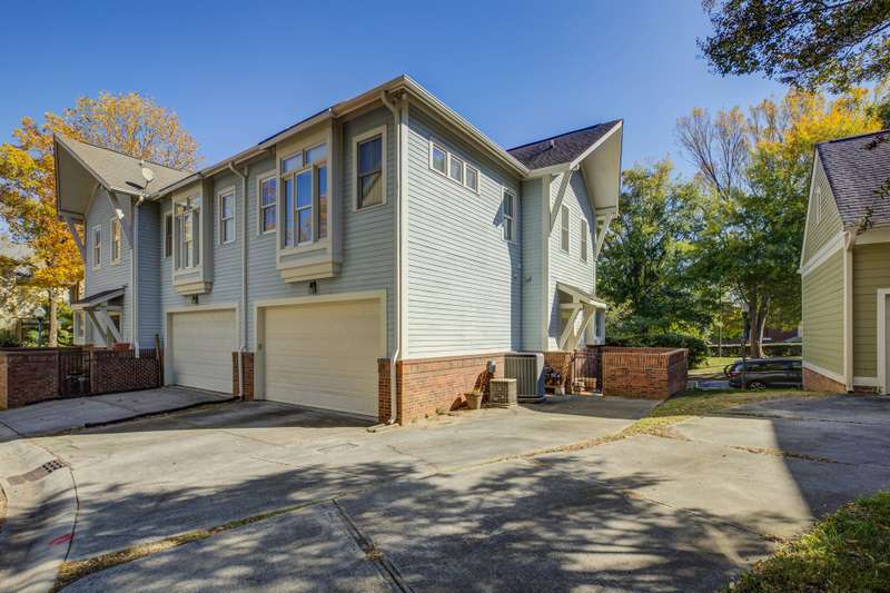 Bright, versatile First Ward townhome with 3 bedrooms, 2.5 bathrooms, -1,990 sq?ft, and a rare attached 2-car garage plus extra parking. 10-foot ceilings, oversized windows, and freshly refinished hardwoods create a light-filled, welcoming space. The living room features a fireplace with built-in bookshelves, perfect for cozy evenings or entertaining, while the dining area and spacious kitchen with island make hosting easy. Step outside to the private brick-enclosed patio for morning coffee or grilling. Upstairs, the primary suite includes two closets, a tiled shower, and a separate tub. Two additional bedrooms, a full bath, and convenient laundry room provide flexibility for guests, work-from-home setups, or hobby space. With only one shared wall, this home offers more privacy than most Uptown townhomes. Low HOA dues keep city living simple, and the location puts you walking distance from First Ward Park, 7th Street Market, Spectrum Center, restaurants, and offices. Move-in ready and perfect for a variety of lifestyles.