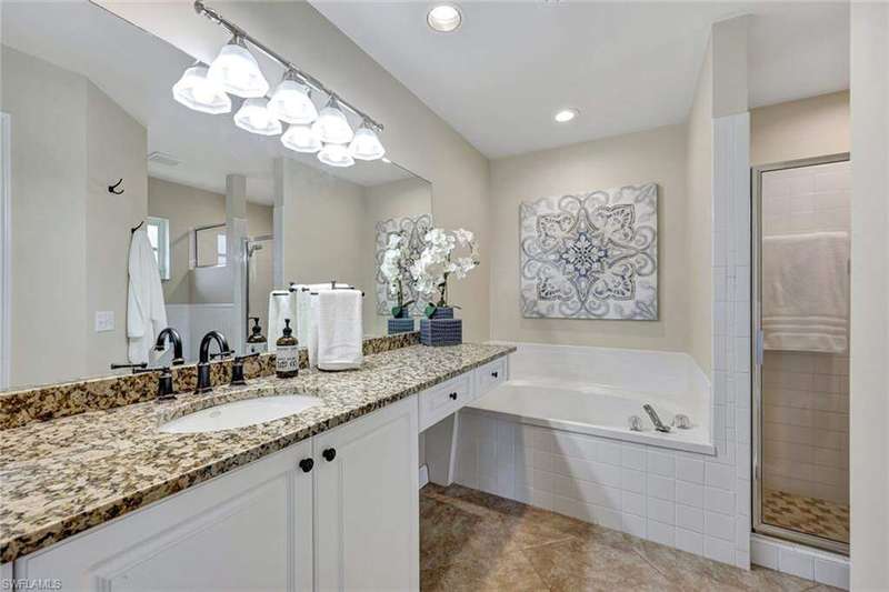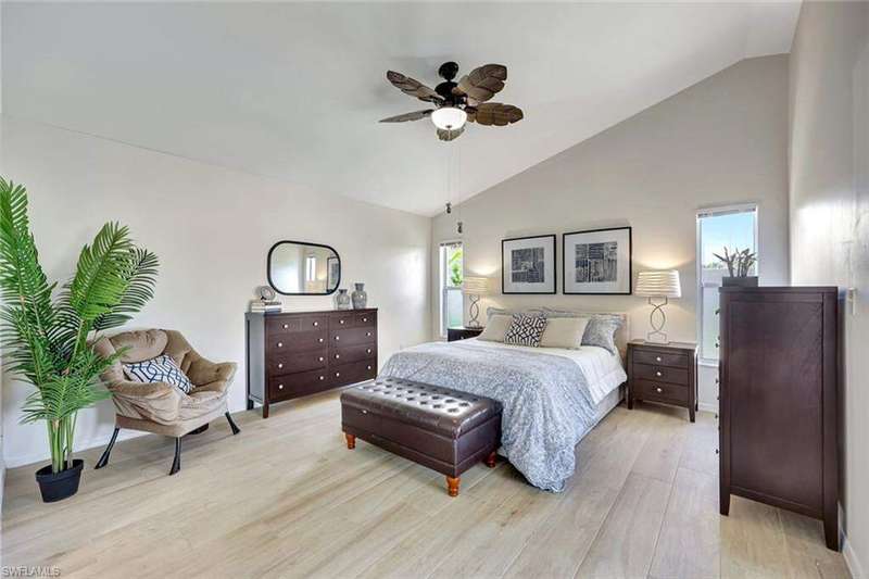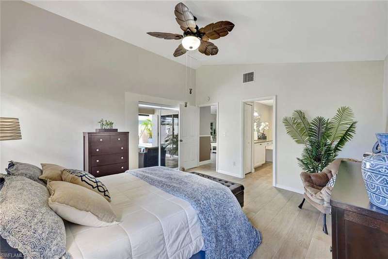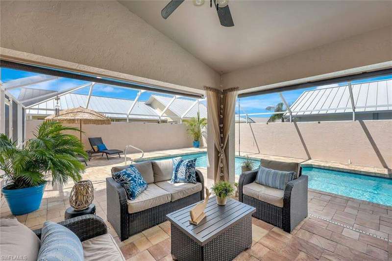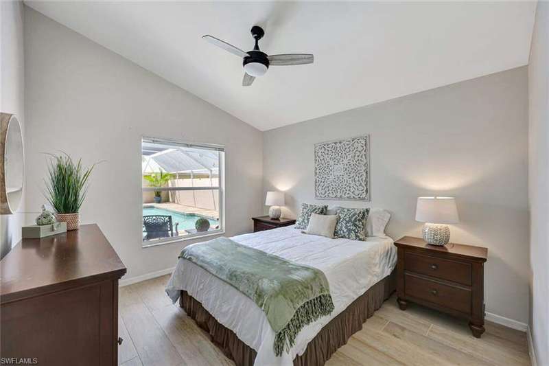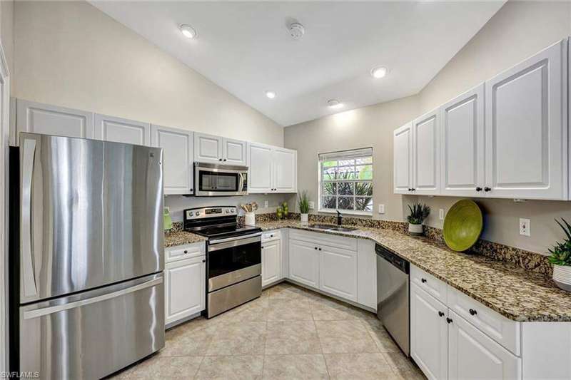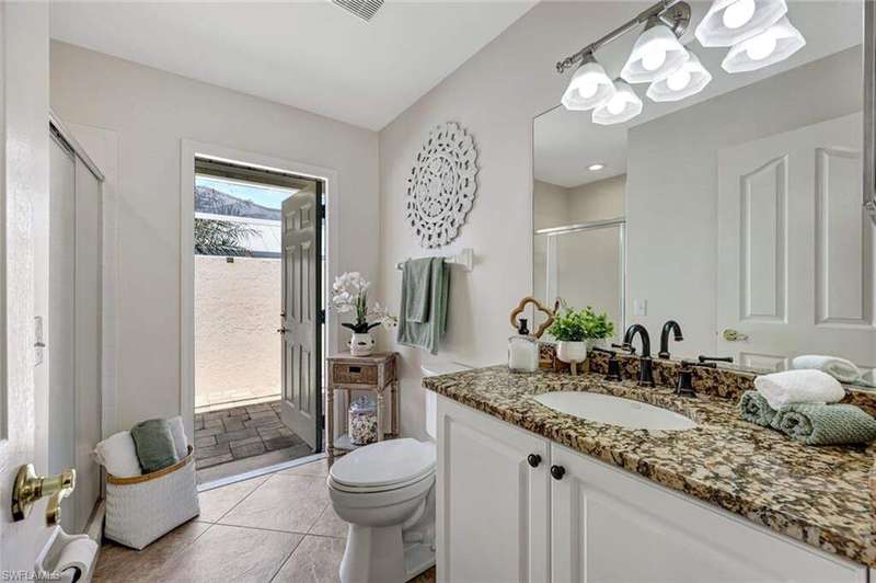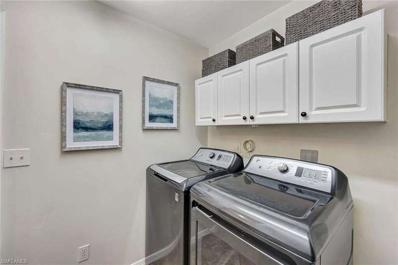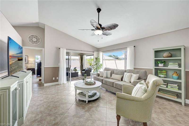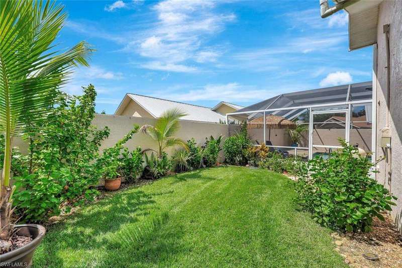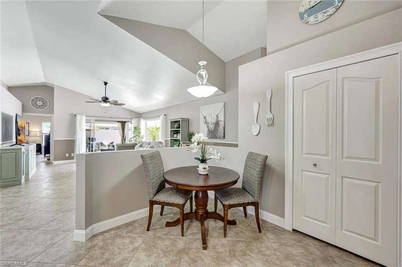 You'll fall in love with this wonderfully charming and welcoming home in the desirable gated community of Longshore Lake! Be greeted by high ceilings, a bright living room, separate dining room, eat-in kitchen and beautiful, roomy bedrooms. The inviting kitchen is equipped with a newer stove and dishwasher, and connects to pantry and in-home laundry room. Fresh paint has been added in most rooms. Recent updates include a new pool pump, newly screened lanai cage, new garage door opener, new electric shades in primary bedroom, and new toilets. The 8 solar panels efficiently heat the pool for usage year-round and the spacious paved pool deck provides ample room for outdoor lounging and dining. Adjacent to the pool deck, find an adorable private side yard with tropical vegetation; perfect for pet owners! The interior features tile flooring throughout with light porcelain wood-look tile in the bedrooms. The living room opens to the lanai with pocketing sliders, creating a seamless indoor-outdoor flow. Additional features include manual exterior sun shades, smoke detectors, and mature landscaping. Longshore Lake offers an exceptional lifestyle with 9 tennis courts, fitness center, basketball court, playground and Pickleball courts will be added soon. The clubhouse is the social heartbeat of the community and includes a large gathering room, cozy restaurant and bar overlooking the 88-acre lake. Residents can enjoy electric powered boats, kayaks, canoes, and paddleboards on the scenic water. Best of all: The clubhouse will receive a fresh, new look within the next year and a half. A fantastic opportunity in a premier North Naples community!
