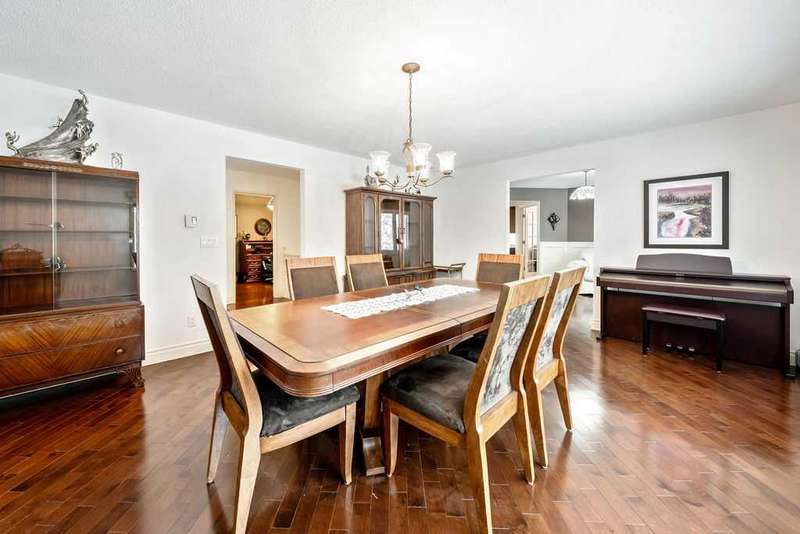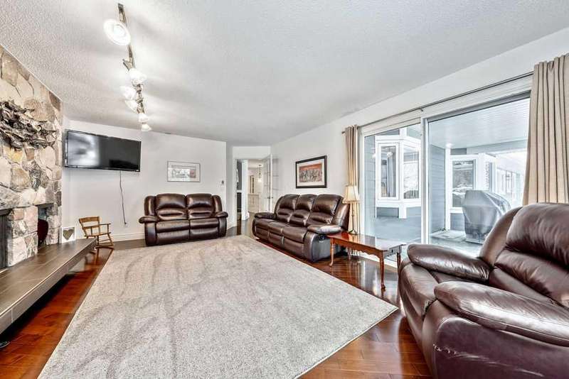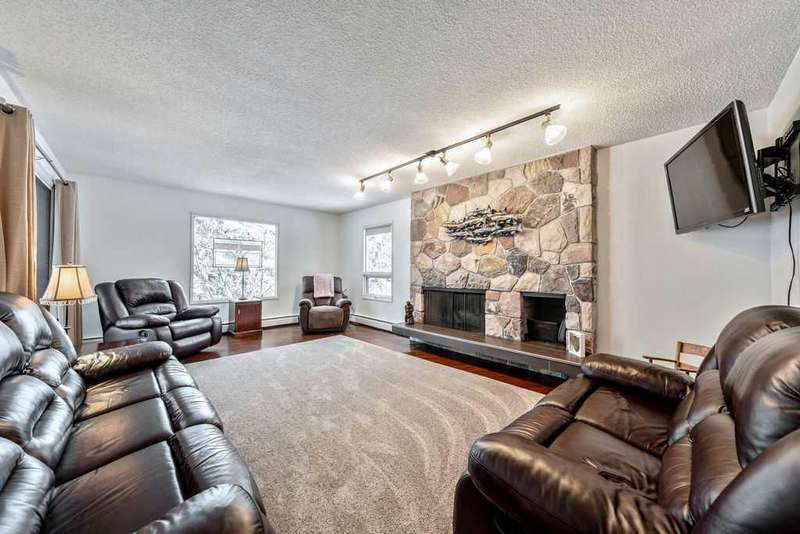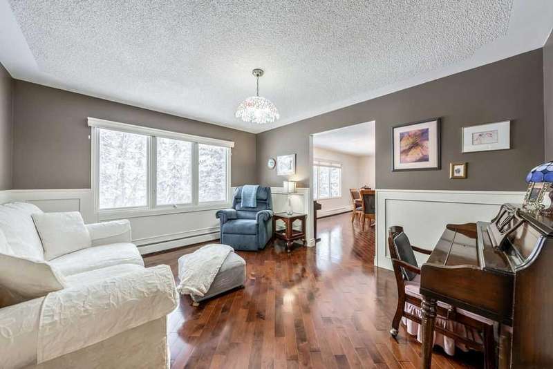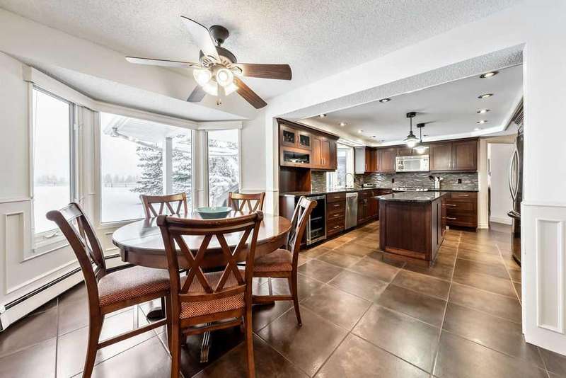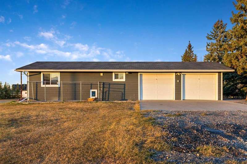 This beautifully treed and well-maintained acreage offers outstanding privacy and an incredibly convenient location, just minutes from Calgary. Set on 2.60 acres and surrounded by mature evergreens, this large bungalow provides 2,857 sq. ft. above grade and over 5,700 sq. ft. of total interior space. It includes a triple attached garage and a separate heated shop with running water, measuring 26 x 50 feet. This is a rare opportunity to enjoy quiet country living with mountain views and stunning sunsets while remaining within walking distance of the city. The main level is bright and welcoming, featuring a spacious front entry, rich hardwood floors, and large windows overlooking the property. The dining and sitting rooms are warm, comfortable spaces filled with natural light. The kitchen is practical and well-designed, offering full-height cabinetry, granite counters, a large island, wine storage, and a sunny breakfast nook with a clear sightline into the backyard. The primary suite offers a true sense of retreat with its impressive dimensions, easily accommodating a king bed along with space for a reading area or lounge furniture. The custom walk-in closet provides excellent organization, and the beautifully finished ensuite features a deep soaker tub, glass shower, double vanity, and rich wood cabinetry. Two additional bedrooms, a full bathroom, an office or den, a family room, a mud room, and a laundry room complete the main level. The fully developed lower level adds exceptional flexibility, offering a large recreation area, bar space, media room, three additional bedrooms, two bathrooms, several storage rooms, and a convenient kitchenette. This layout is ideal for large families, multigenerational living, or anyone wanting extra space for hobbies or entertaining guests. A steam room is roughed in and ready for the next owners to finish if desired. Outside, the property offers both privacy and highly usable yard space. Tall trees create a natural buffer around the home, and there is a pleasant outdoor fire pit area, a pond, and plenty of open, partially irrigated lawn to enjoy. The fully fenced garden, complete with elk fencing and raised beds, is perfect for growing produce or flowers. The exterior of the home has motion sensitive lighting and has been upgraded with high-end Hardy Board siding. Mechanically, the property is serviced by a super productive 8.5 GPM well. The home is heated with two boilers that provide a very efficient and comfortable, even heat throughout the entire home. Electric heated floors are located in the kitchen, the ensuite bathroom, and the 2 piece bathroom by the laundry room. With its excellent location, privacy, square footage, and versatility, this acreage presents a fantastic opportunity in a highly sought-after area. It offers the quiet of country living while keeping you close to all city amenities. Book a private viewing at your convenience.