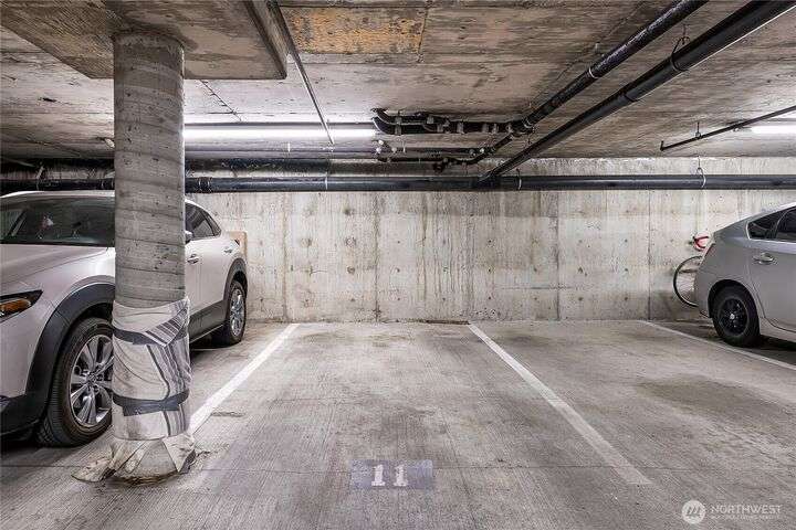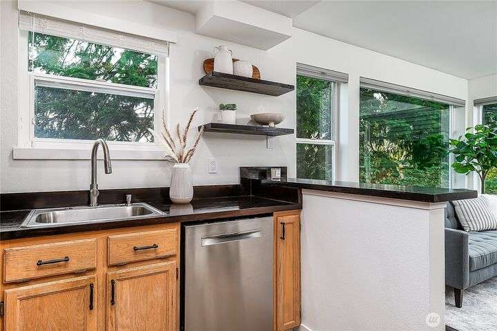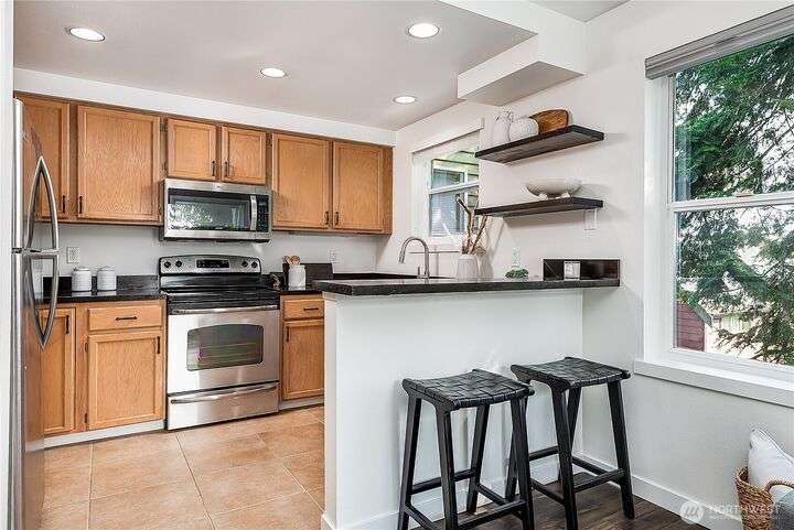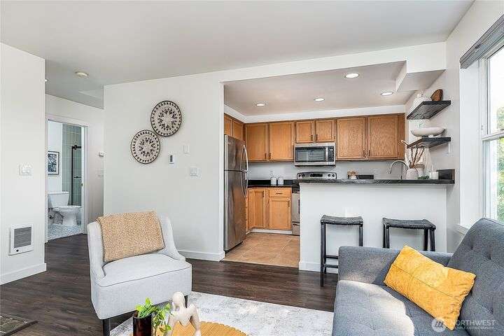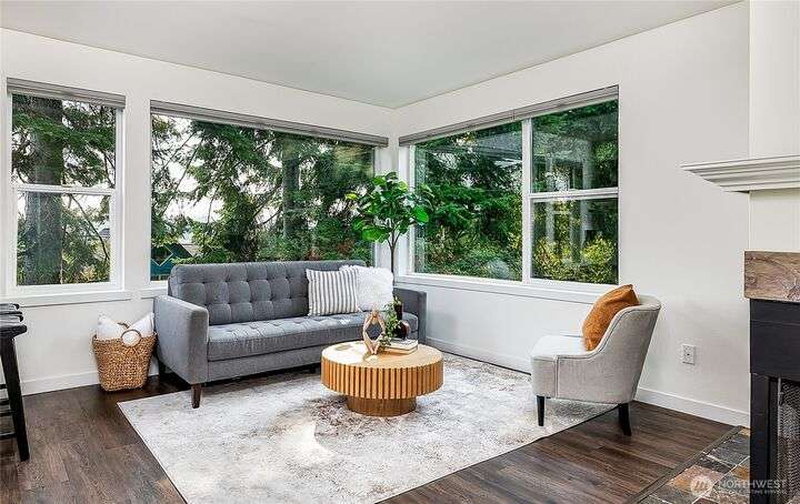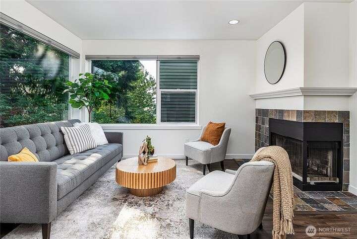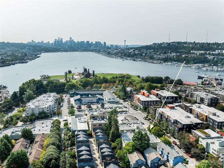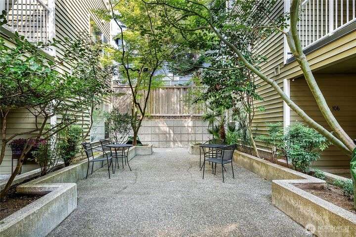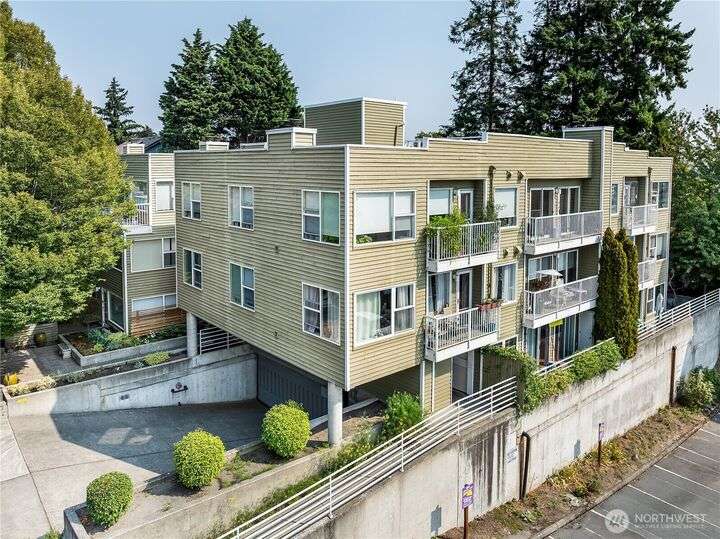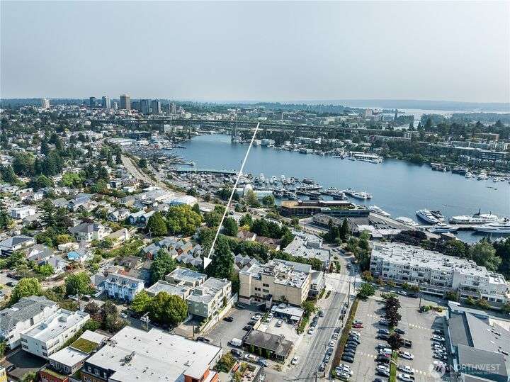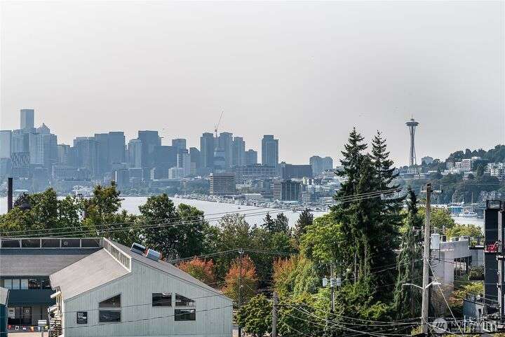 Enjoy the best of Wallingford living in this TOP FLOOR SE CORNER unit, where location and peek-a-boo city views create an exceptional urban retreat. Expansive picture windows frame lush treetop views. Thoughtful upgrades include LVP flooring, butcher block countertops, fully remodeled bathroom with sky light, and updated blinds throughout. Additional highlights: fresh paint, a full-sized W/D, wood-burning fireplace, one parking spot, storage closet, and rooftop deck with sweeping Lake Union and city views. This small, quiet community of three buildings offers a secure entry, elevator access, with courtyard/trees and privacy. Pet friendly.Steps from the best of city living—coffee shops, eateries, BG trail, Gas Works Park, Fremont and more.