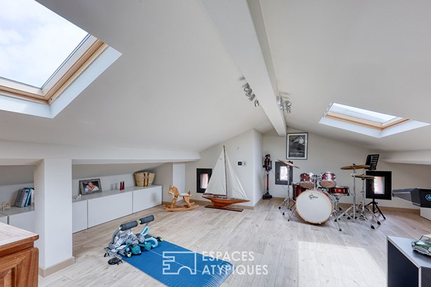 The interior, bathed in light thanks to large bay windows, is centered around a living space with clean lines. The adjoining living and dining rooms open to the outdoors, creating a seamless connection between indoors and outdoors. The semi-open kitchen, with its meticulous finishes, completes this welcoming space. Three bedrooms offer generous volumes and custom-designed storage. The fully finished attic accommodates a large recreation room, ideal for an office, a gym, or a relaxation area. The high-quality materials?natural stone floors, aluminum joinery, and integrated lighting?enhance the authenticity of the space.