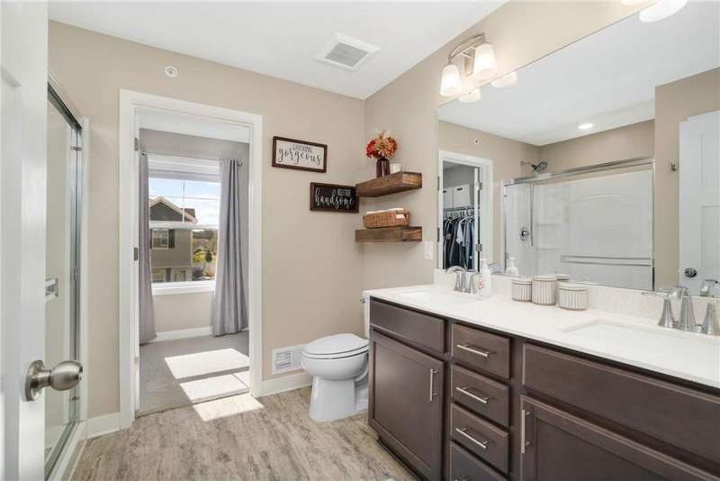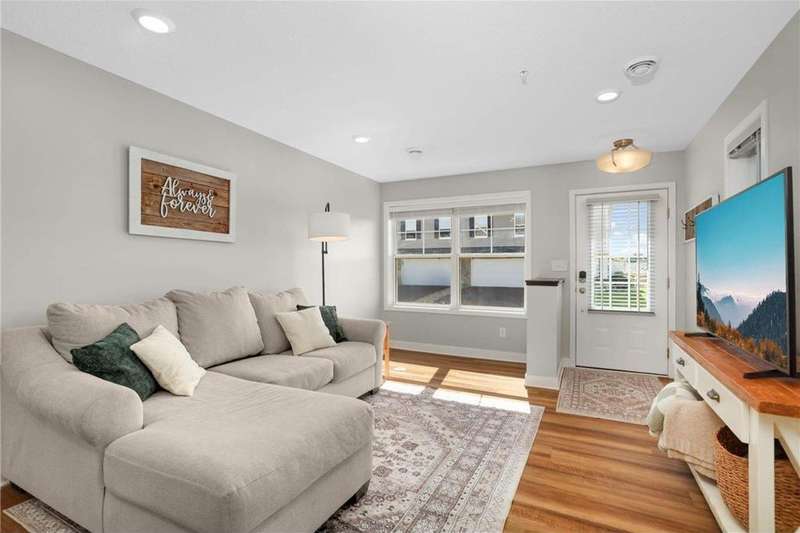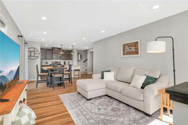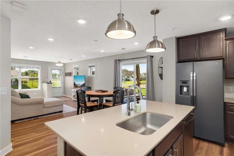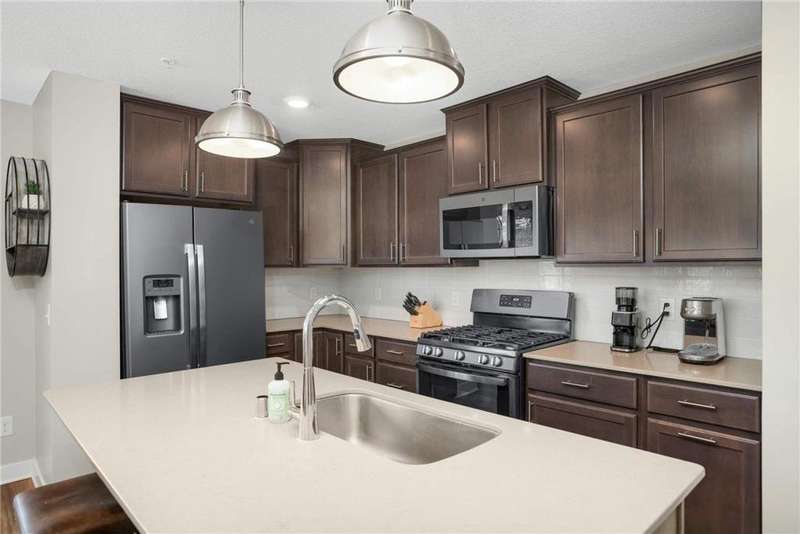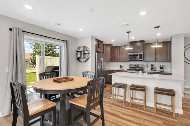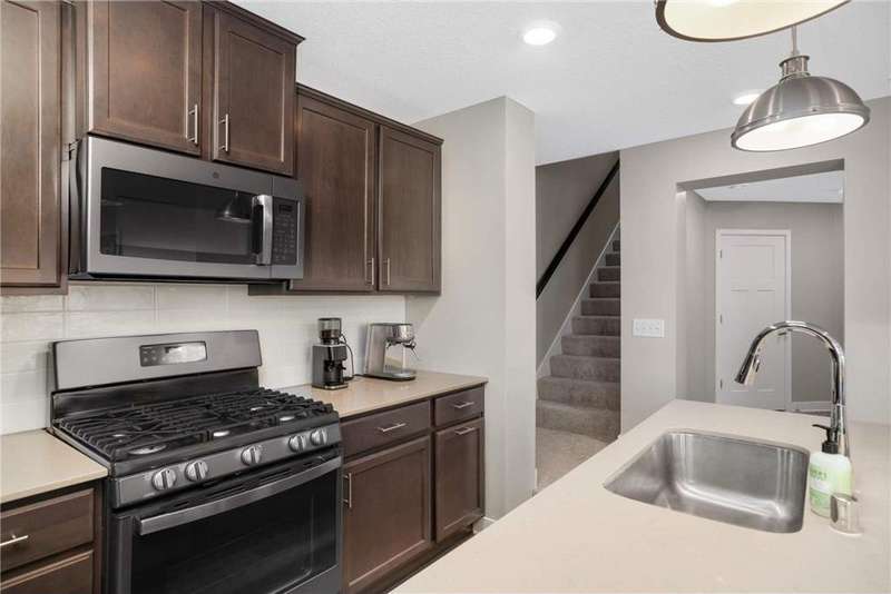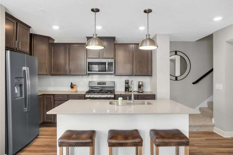 Welcome to this beautifully maintained end-unit townhome in the desirable Calarosa neighborhood. The open-concept main level features a bright living room with large windows, stylish flooring, and a cozy layout that flows seamlessly into the dining area and modern kitchen. The kitchen is equipped with stainless steel appliances, rich cabinetry, a center island with seating, and sleek pendant lighting. Upstairs, you'll find spacious bedrooms including a serene primary suite, plus brand-new carpet throughout the upper level. Enjoy the added privacy of an end unit, a charming outdoor space, and the benefits of the Calarosa community amenities. Move-in ready with a fresh, inviting design-this home is perfect for easy everyday living.