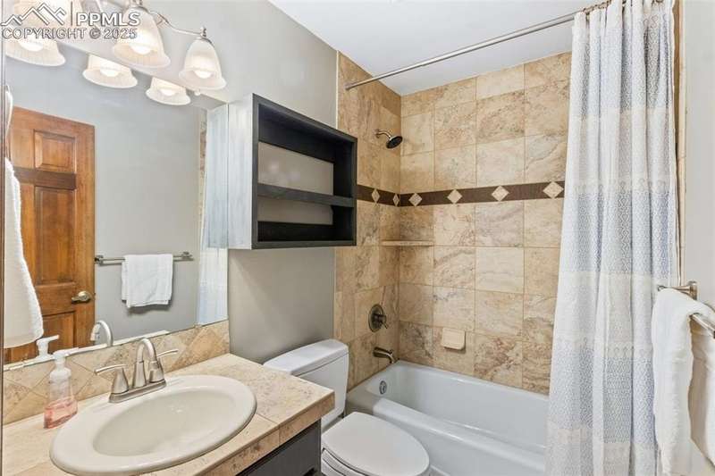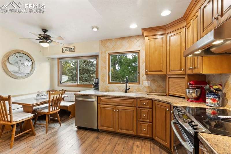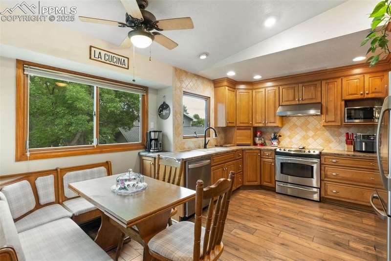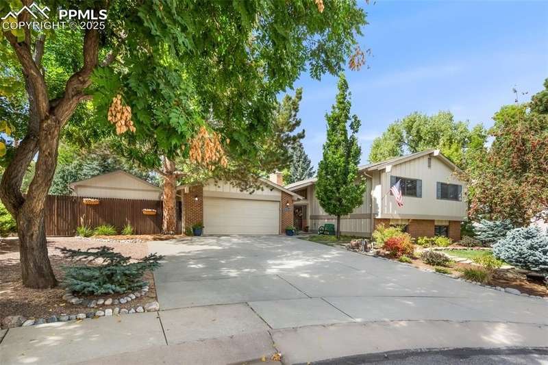 Incredibly maintained home in desirable Country Broadmoor, ideally situated on a quiet cul-de-sac, on .32 acres of mature trees and natural privacy. Featuring 4 bedrooms, 3 baths and over 2,700 square feet, this home blends comfortable everyday livability with inviting spaces for entertaining. The welcoming foyer opens to a sun-filled living room featuring soaring ceilings. The renovated kitchen boasts abundant cabinet and counter space, stainless steel appliances, stylish tile backsplash, and a custom dining nook. The adjoining formal dining room offers a picture window overlooking the back yard. The main-level primary suite includes a walk-in closet and adjoining bath. A second bedroom and updated full bath complete the main level. The lower level offers exceptional additional living space with a large family room featuring a brick fireplace, a billiards or game area, two spacious bedrooms, a full bathroom, and a generous laundry room. Step outside to the expansive two-tiered composite deck and experience the tranquility of the beautifully landscaped and tree-lined property, ideal for outdoor dining, gatherings, or quiet relaxation. A large workshop and separate storage shed provide excellent space for projects, hobbies and tools. Thoughtfully updated, this home features Renewal by Anderson windows, a newer electrical panel, new switches and outlets, and new sewer line from the house to the city sewer. Move right in and enjoy this home. Just minutes from I-25, shopping, dining, The Country Club of Colorado, and award-winning Cheyenne Mountain District 12 schools, this home offers an exceptional location and lifestyle.