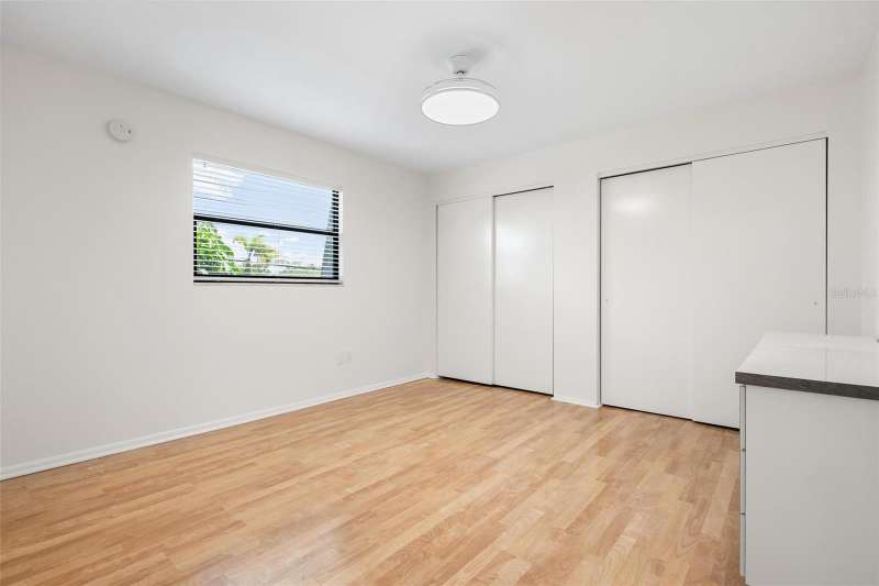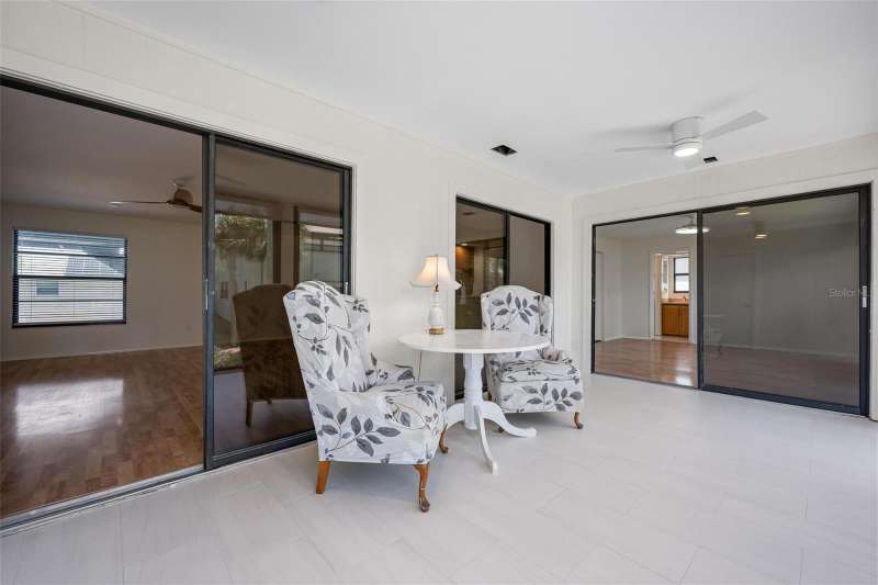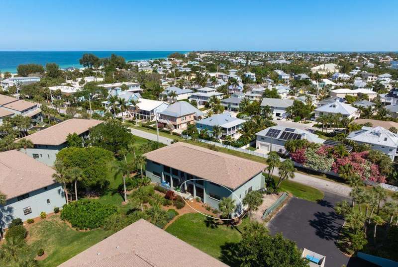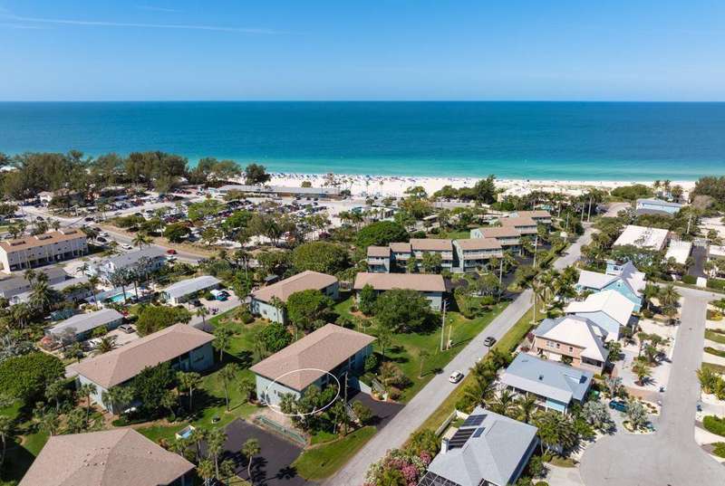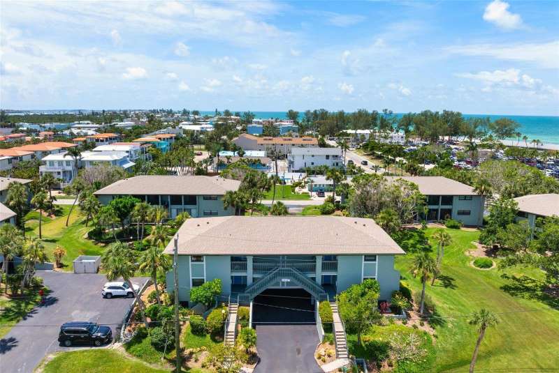 One or more photo(s) has been virtually staged. One or more photo(s) has been virtually staged. NEW ROOF! Welcome to this freshly remodeled, elevated 2-bedroom, 2-bathroom end-unit condo with a flex room at Island Village in Holmes Beach. Perfectly located just one block from the pristine sands of Anna Maria Island. This bright and airy condo has been thoughtfully updated and sustained NO damage in the recent storms. It includes two dedicated parking spaces under building and includes a storage. Inside, the condo has been freshly painted with new tile floors in the kitchen and flex room featuring a clean, modern aesthetic. One of the standout upgrades is the enclosed flex room, now fully under air with the recent extension of the A/C system. This versatile bonus room serves as a wonderful flex space, featuring a large closet and offering endless possibilities for use — whether as a bright and inviting sunroom filled with natural light, a comfortable home office that inspires productivity, or a cozy retreat that effortlessly adapts to your lifestyle needs. This sun-filled retreat is enhanced with a wall of sliding glass doors and Phifer weave sunscreen shades, offering views of the lush, park-like surroundings. The kitchen is designed with both style and functionality in mind, featuring durable Corian countertops, a breakfast bar, a Whirlpool full-size stainless-steel refrigerator and freezer, and custom Kitchen Craftmade Cabinetry. The primary bedroom includes sliding glass doors that open to the air-conditioned flex room, a large walk-in closet, and an en-suite bathroom with a walk in shower. The second bedroom offers another ensuite bath, making it ideal for guests or family members. A dedicated laundry room with a full-size washer and dryer adds everyday convenience. Recent updates include a NEW ROOF in 2025, an upgraded electric meter in 2024, and a refreshed exterior paint job also completed in 2021. The condo also includes an osmosis water filtration system. This condo is part of Island Village, a well-maintained, maintenance-free community where the HOA covers cable TV, internet, water, sewer, trash, insurance, and upkeep of the grounds, exterior, community pools, and tennis courts. Residents enjoy access to two heated pools and two tennis/pickleball courts, offering ample recreational opportunities year-round, and owners are permitted to rent their condo up to three times per year, with a minimum rental period of one month. Located only two blocks to direct beach access, this condo is ideally positioned within easy access to over 20 public beach access points, 12 parks, popular restaurants, and local shops. Don’t miss this rare opportunity to own a beautifully updated condo in one of Anna Maria Island’s most desirable communities. Schedule your tour today and experience the relaxed, tropical lifestyle of Island Village. Be sure and check out the 3D walkthrough and floor plan for this lovely condo in Island Village.
