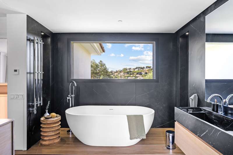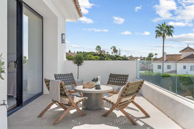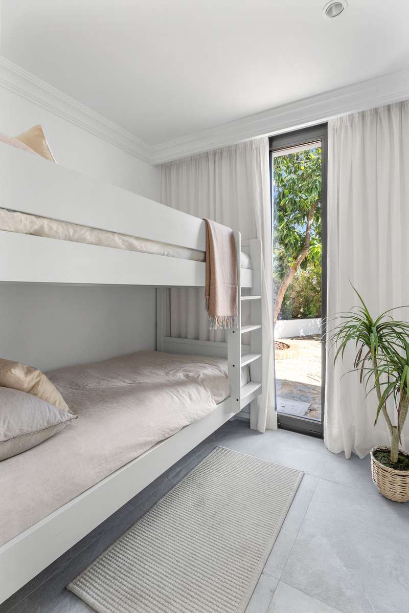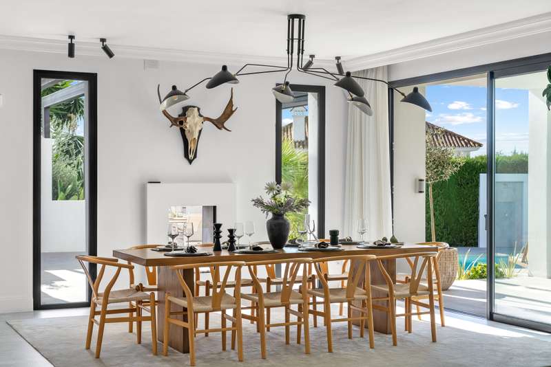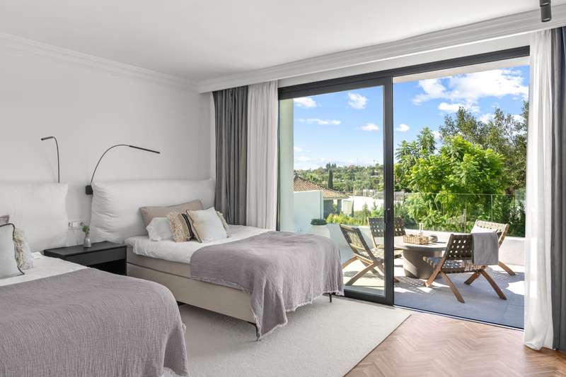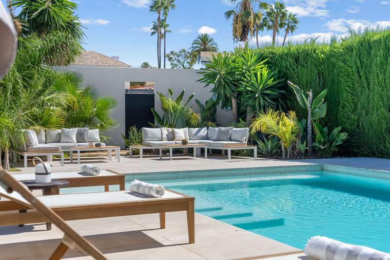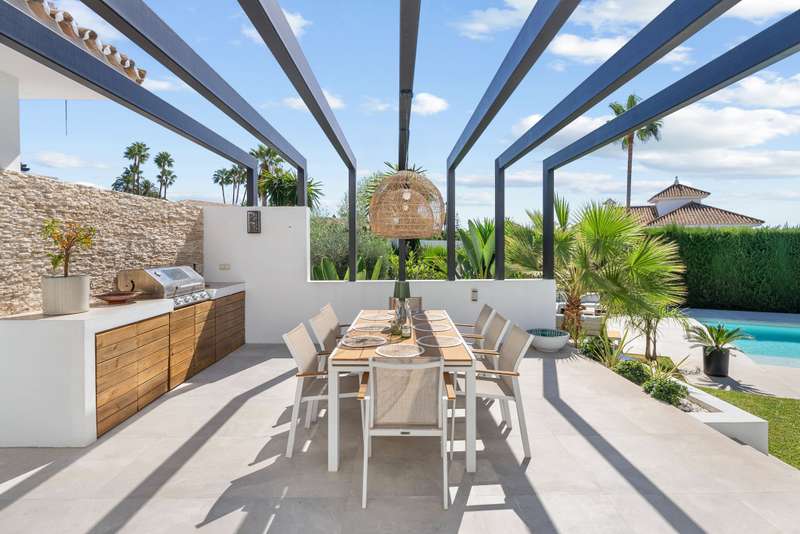 Located in the heart of Nueva Andalucía, this southwest-facing five-bedroom villa beautifully combines traditional Andalusian character with contemporary luxury. Recently renovated from top to bottom, it’s filled with natural light and features spacious terraces, a private pool, and lush landscaped gardens. Upstairs, the bedrooms overlook the nearby golf course, offering a peaceful, scenic setting. The open-concept kitchen and living area flow directly onto a covered terrace with an outdoor kitchen and pergola — perfect for year-round al fresco meals. The primary suite enjoys its own private terrace complete with a jacuzzi for stargazing, while three additional bedrooms keep the family close together. On the main level, two more versatile rooms can serve as a children’s playroom, home office, or guest quarters. The lower level is designed for fun and leisure, with plenty of space for a ping pong table, foosball, and a TV lounge — ideal for movie nights or entertaining. A climate-cont